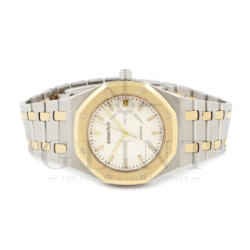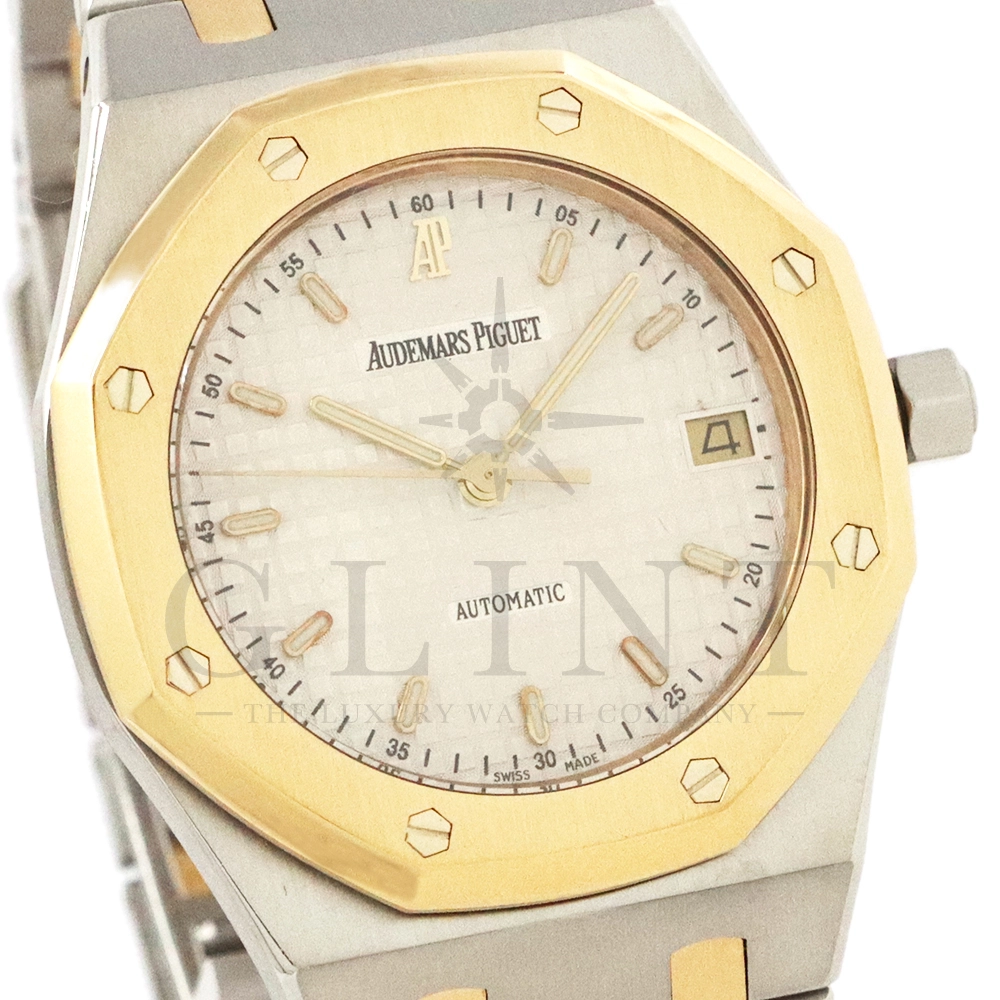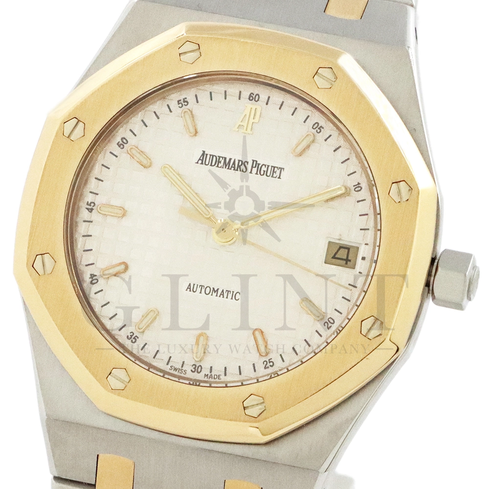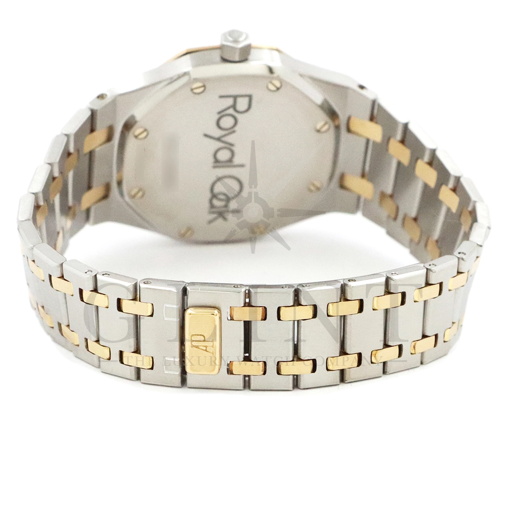 こちらはオーデマ ピゲ ロイヤルオークです。1980年代から2000年代まで長きに渡って生産されたRef.14790。ステンレススティールとイエローゴールドを組み合わせたコンビネーション仕様で、ロイヤルオークならではの造形美と高級感を存分に堪能できる一本です。八角形ベゼルとビスモチーフ、シャープなケースライン、そして一体型ブレスレットが織りなすデザインは、ジェラルド・ジェンタの哲学を色濃く反映。ステンレスの力強さに、イエローゴールドの華やかさが加わることで、スポーティさとエレガンスを高次元で両立しています。タペストリー模様が施されたダイヤルは、光の角度によって豊かな表情を見せ、洗練された存在感を演出。ケースサイズは程よく、日本人の腕元にも収まりやすく、ビジネスからプライベートまで幅広いシーンで活躍します。搭載される自動巻きムーブメンCal.2225はジャガールクルトのCal.889をベースとしており、比較的薄型に設計されたムーブメントはスリムな造形を実現するのにも適したムーブメントといえるでしょう。ロイヤルオークの歴史と品格を、日常の中で味わいたい方にふさわしいモデルです。