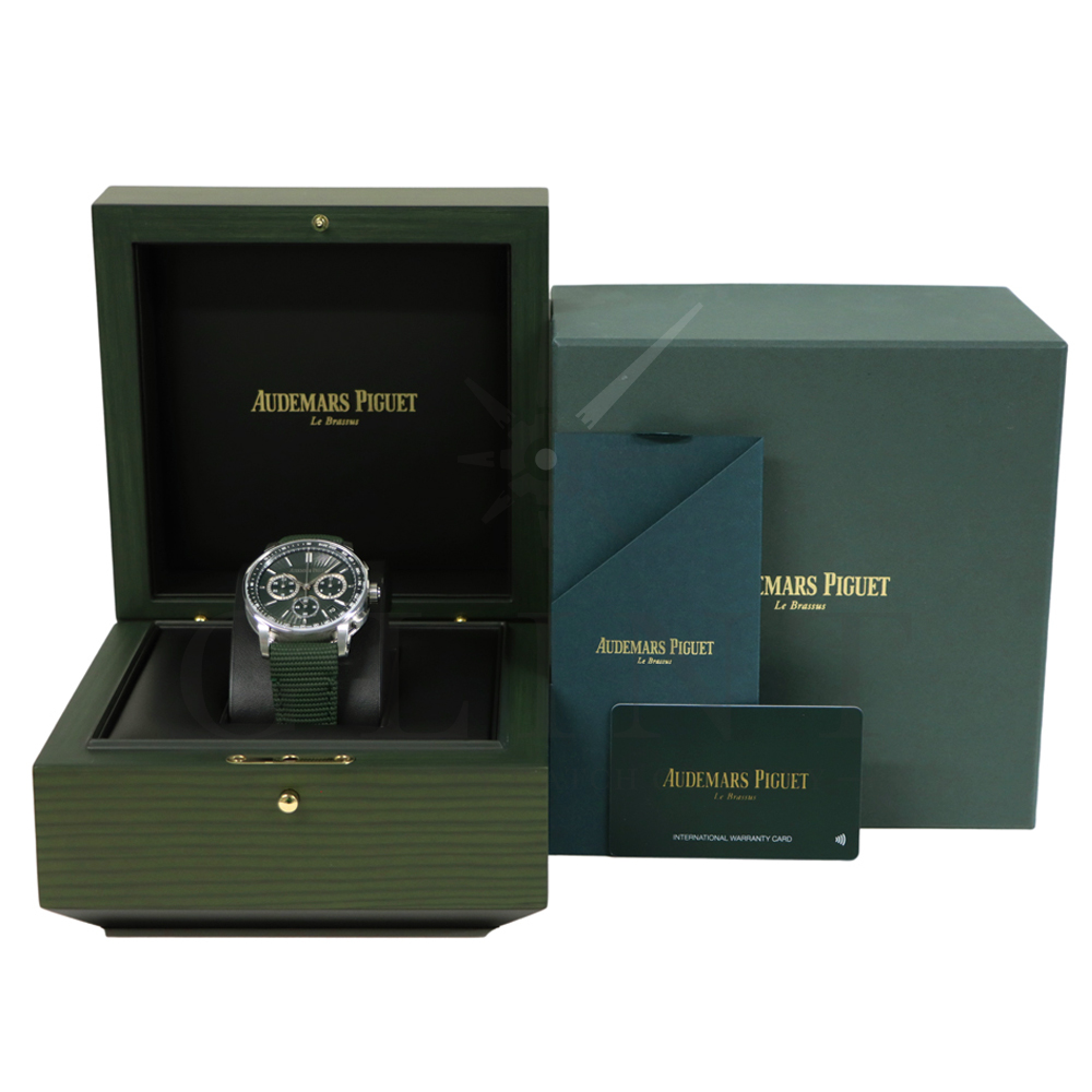 文字盤:グリーンダイヤル、グリーンカウンターとロジウムカラー外周リング、6時位置にグリーンカウンター、蓄光処理を施したホワイトゴールドのアプライドアワーマーカーと針、グリーンのインナーベゼル