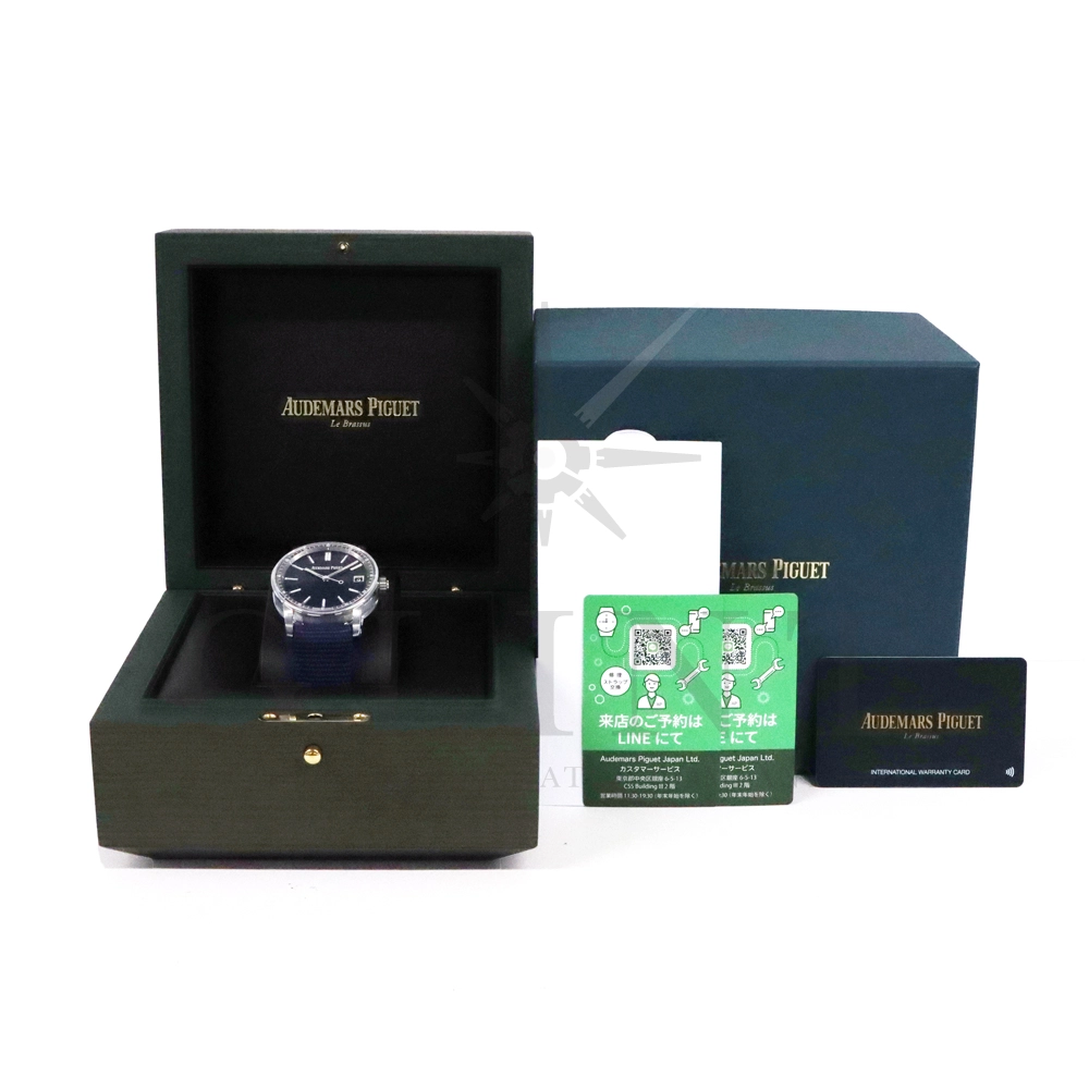 こちらはCODE 11.59 バイ オーデマ ピゲ オートマティック 15210ST.OO.A348KB.01です。コレクションとして5年目を迎え、待望のステンレススティールモデルが登場。スイスのギヨシェ職人ヤン・フォン・ケーネルと共同制作したという文字盤の百以上に及ぶ微小な凹凸が生み出す輝きと陰影はもはや芸術的で、波目模様のスタンプ加工を施し、その上からブルーのPVDで着色しております。CODE 11.59の特徴である風防のダブルカーブサファイアクリスタルガラスが生み出す視覚効果と相まって、これまでのモデルとはまったく違う世界観を演出してくれるでしょう。頑丈な素材の特徴をデザインに落とし込んだ新たなCODE 11.59は貴金属モデルと遜色ない完成度の高い一本です。