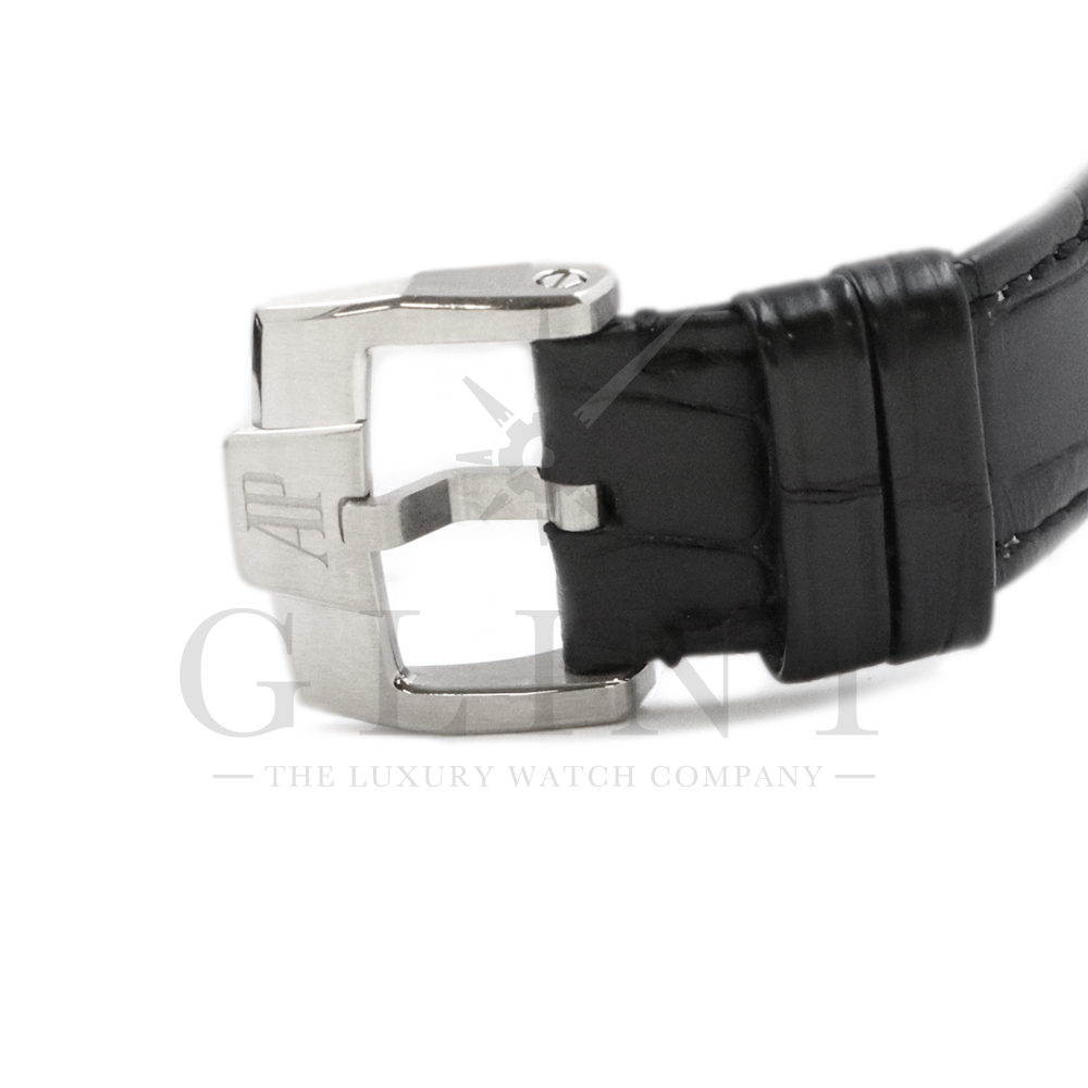 ベルト:ハンドステッチの「大きな竹斑入り」ブラックアリゲーターストラップ、18Kホワイトゴールド製ピンバックル