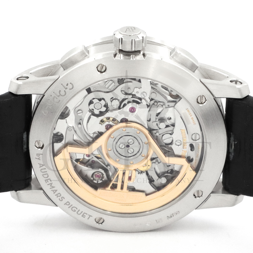 こちらはCODE 11.59 バイ オーデマ ピゲ クロノグラフ 26393BC.OO.A002CR.01です。素材に18Kホワイトゴールドを使用。8層塗りのブラックラッカーダイヤルには3つのインダイアルが配置されており、秒を知らせるスモールセコンドが積算計に比べて、やや小さく、カレンダーの配置位置など視認性を考えられた仕上がりとなっております。また、タキメーターがインナーベゼルに配置される事で風防を最大化に出来、すっきりとした印象を与えてくれるでしょう。そして新開発されたフライバッククロノグラフムーブメントCal.4401を搭載しており、シースルーバックからは外観が非常に美しいムーブメントをご覧いただく事ができます。一見、オーソドックスなドレスモデルながらも、徹底的にこだわり抜いた作りが男心をくすぐらせてくれるでしょう。世界三大時計ブランドの本気度が感じ取れる極上のタイムピースをぜひこの機会にお試しください。