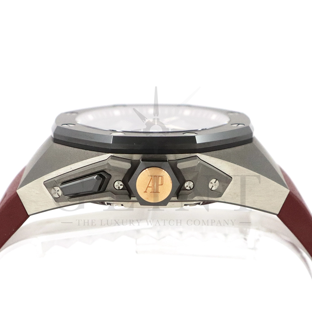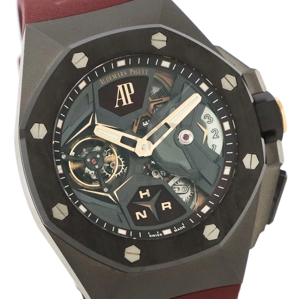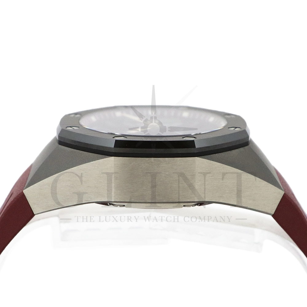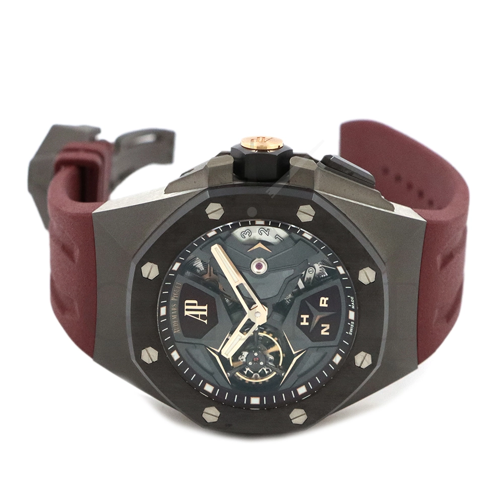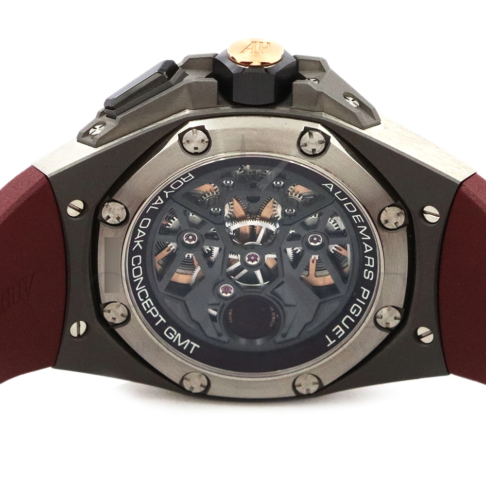 こちらはロイヤル オーク コンセプト フライングトゥールビヨン GMTです。新デザインによるブリッジと9時位置にフライングトゥールビヨンを備え、現代建築を想わせる左右非対称な外観が特徴的な、新世代のロイヤルオーク コンセプトモデル。素材にはサンドブラスト加工が施されたチタンとヘアライン仕上げのブラックセラミックを組み合わせた力強いスタイルで、ローズゴールドがアクセントになって高級感を演出してくれます。フライングトゥールビヨン機能を搭載した自社製手巻きキャリバー 2954は、時計を裏返すと見える2つの大きな香箱を介して、1回巻き上げると約10日間(237時間)のパワーリザーブを発揮。ディスク式のファンクションセレクターにGMT機能を備え、合計348個もの部品でムーブメントが構成されております。ストラップと色を合わせたバーガンディのオープンワークが独特の雰囲気を与えてくれるでしょう。職人の手によって生み出される至高の逸品は、時計コレクターの心を掴む魅力が満載です。