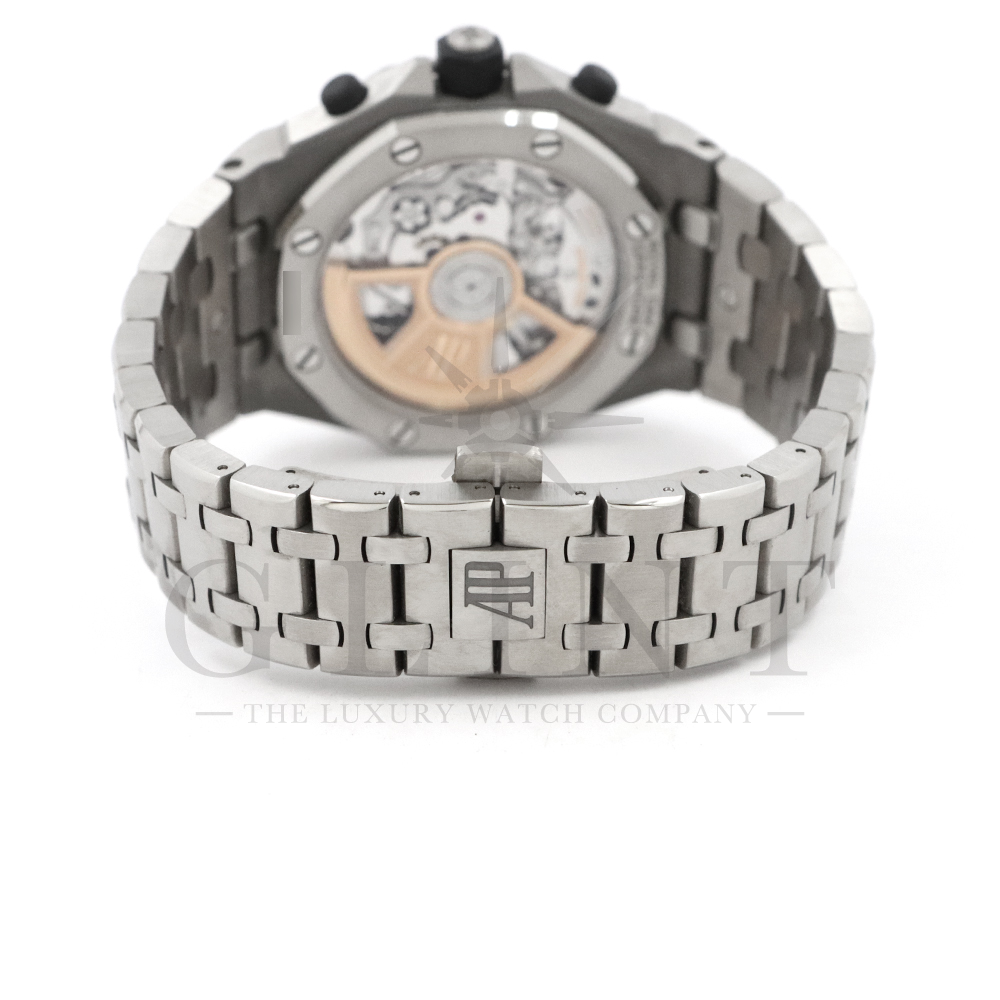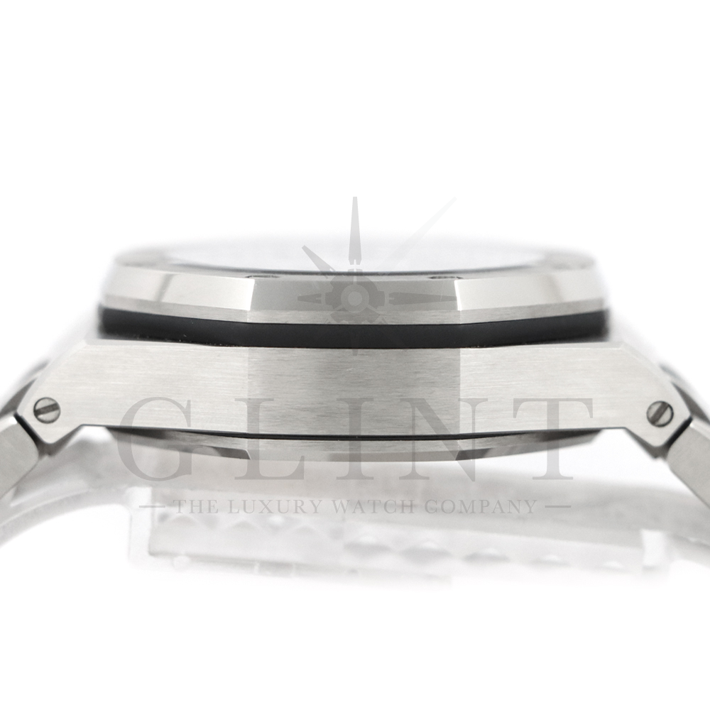 文字盤:「プチタペストリー」模様のグレーダイヤル、ブラックのカウンター、蓄光処理を施したホワイトゴールドのアプライドアワーマーカーとロイヤルオーク針、ブラックインナーベゼル
