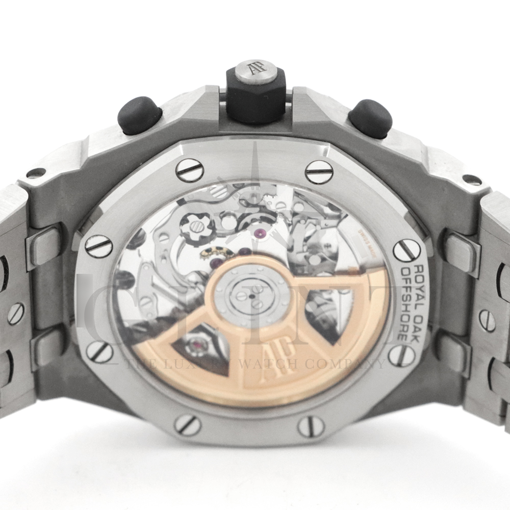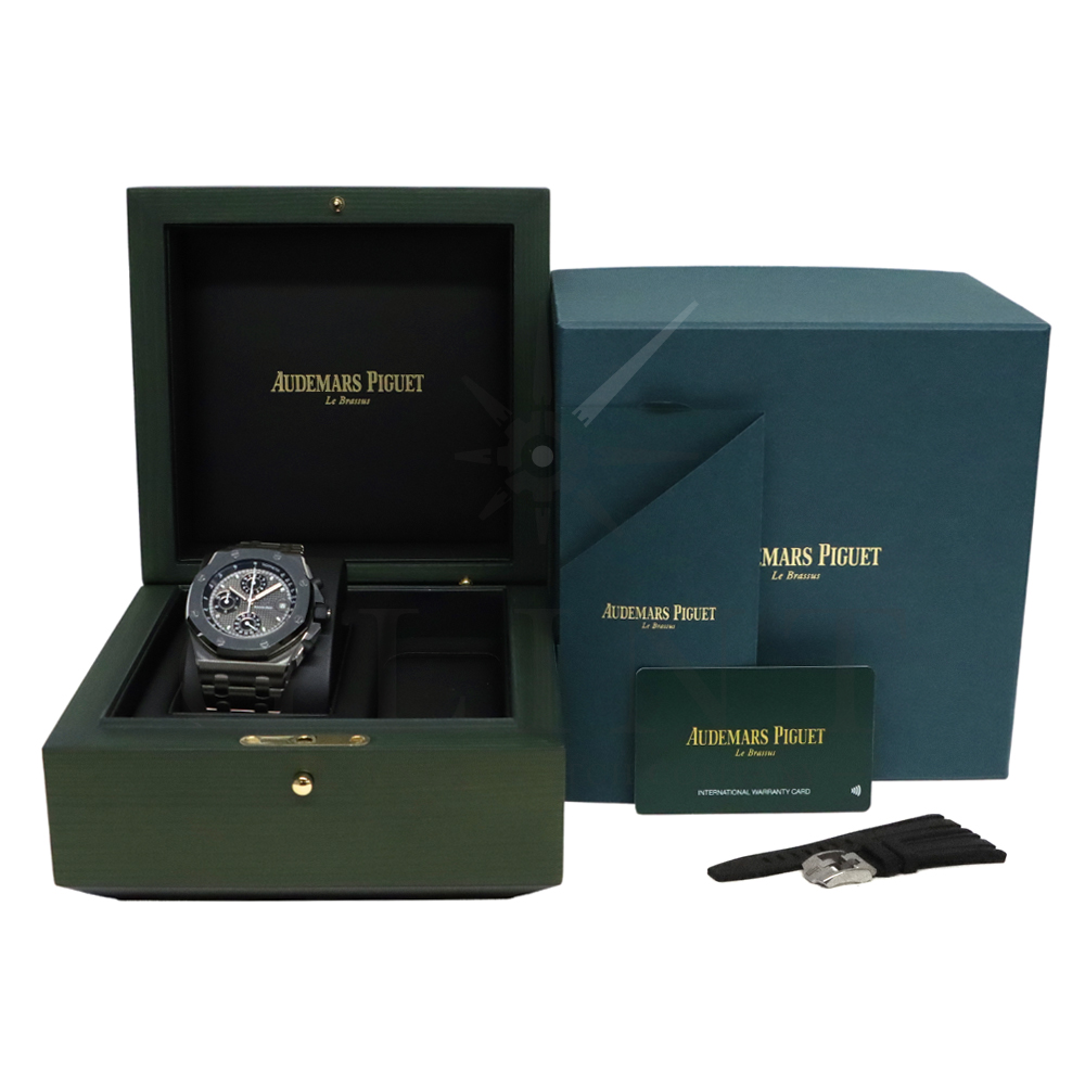 こちらはオーデマピゲ ロイヤルオークオフショアです。1993年に誕生した「ロイヤルオーク オフショア」のDNAを受け継ぎながら、現代的な技術と素材でアップデートされたクロノグラフモデル。チタン素材を採用した42mmケースは軽量で耐久性に優れ、存在感のあるサイズながら快適な装着感を実現しています。グレーを基調とした文字盤には、ブランドを象徴する「プチ・タペストリー」模様を採用。ブラックカウンターとのコントラストにより視認性とスポーティな印象を高めています。ホワイトゴールドのインデックスと夜光付き針が、力強いデザインの中に高級感を演出してくれるでしょう。ムーブメントには、マニュファクチュール製自動巻きクロノグラフ Cal.4404を搭載。フライバッククロノグラフ機構と約70時間のパワーリザーブを備え、サファイアクリスタルのシースルーバックから精緻な仕上げを鑑賞することができます。さらに、工具を使わずに交換できるストラップシステムを採用し、シーンやスタイルに合わせたアレンジも可能。スポーティさとラグジュアリーを兼ね備えた、オフショアシリーズを代表する一本です。