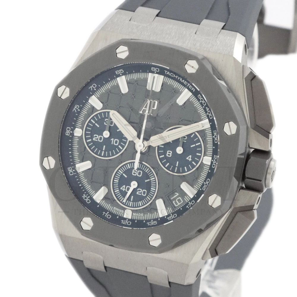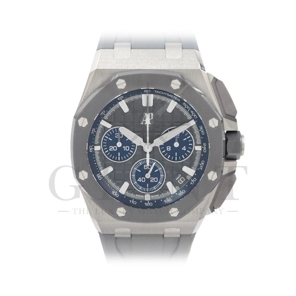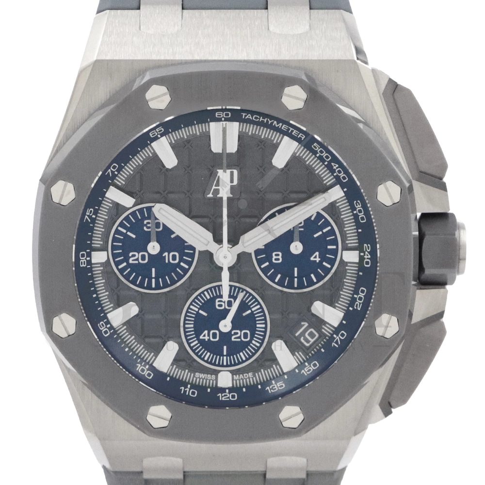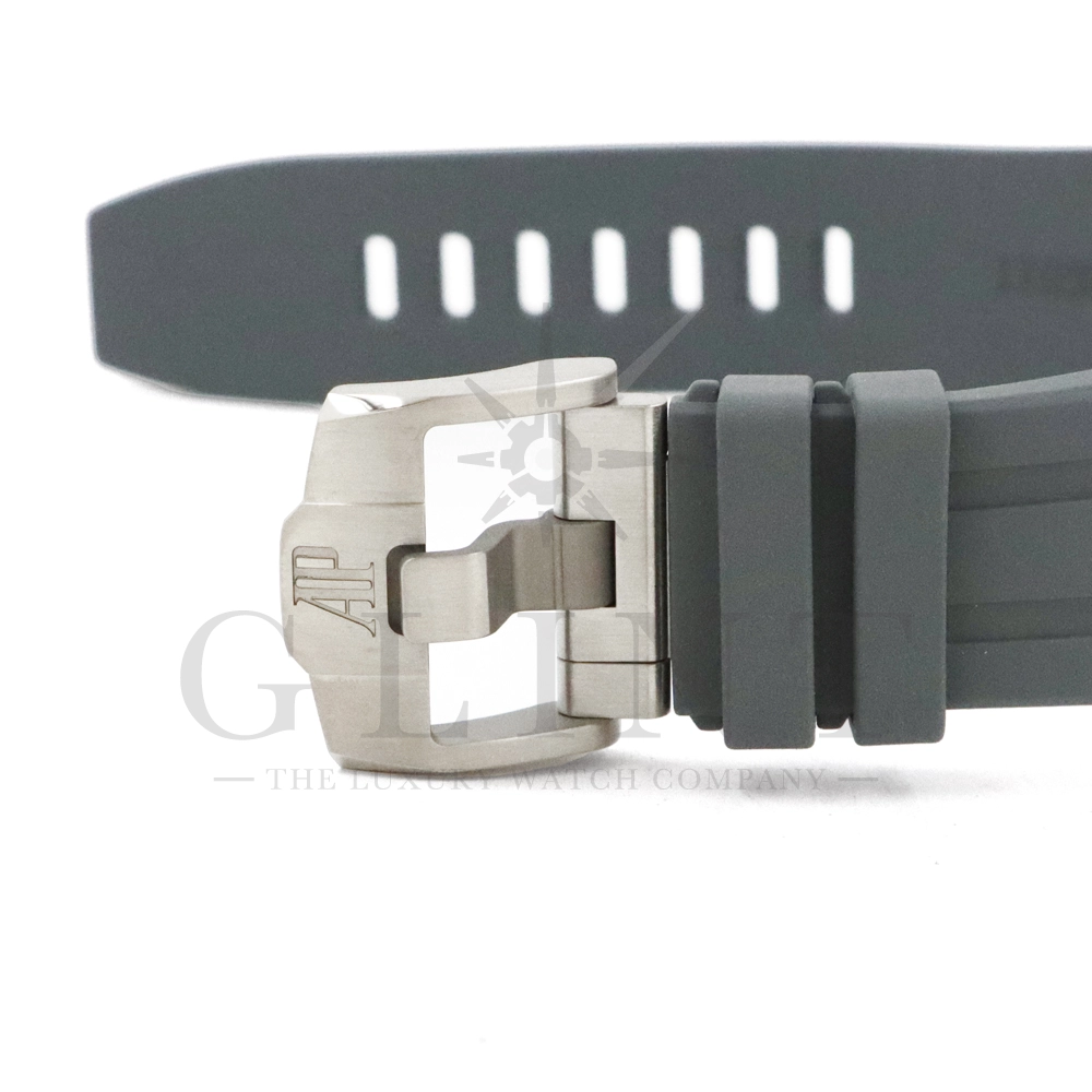 こちらは2021年に発表されたロイヤル オーク オフショア クロノグラフです。ケース素材にチタン、ベゼルやリューズ、プッシュボタンにグレーセラミックを使用したケースサイズ43mmの新デザインモデル。グレーで統一感がある中、インナーベゼルとインダイヤルはブルーが使用され、クールなルックスを演出しております。ムーブメントはCODE 11.59でも使用されているフライバッククロノグラフキャリバー4401を搭載しており、特徴である22Kピンクゴールドの回転錘や、コート・ド・ジュネーブ、ライン仕上げ、サーキュラーグレインなどの洗練された仕上げの部品を、サファイアケースバックを通して見ることができます。そして新たに設計されたストラップは簡単にお客様ご自身で交換が可能なシステムとなっており、ご気分に合わせてお楽しみいただけるでしょう。新たに誕生したロイヤル オーク オフショアはより実用性に特化した素晴らしい仕上がりとなっております。