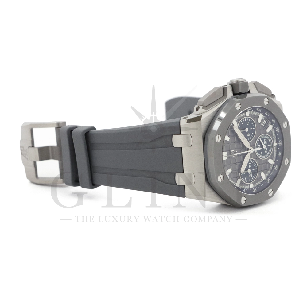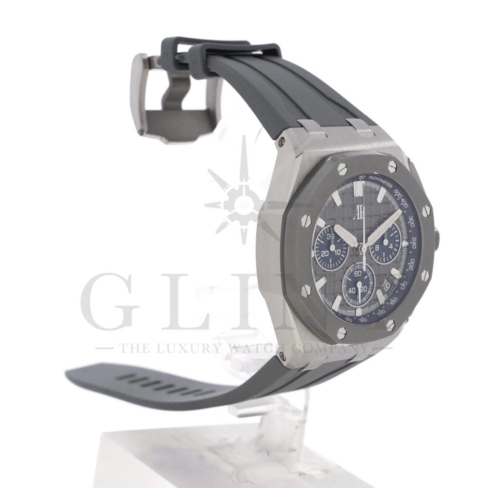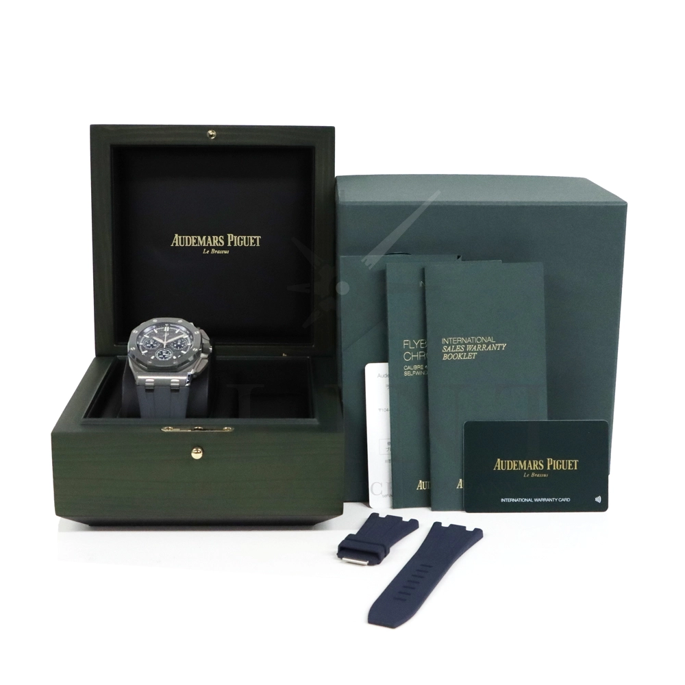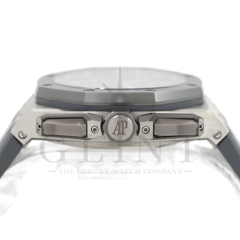 こちらは2021年に発表されたロイヤル オーク オフショア クロノグラフです。ケース素材にチタン、ベゼルやリューズ、プッシュボタンにグレーセラミックを使用したケースサイズ43mmの新デザインモデル。グレーで統一感がある中、インナーベゼルとインダイヤルはブルーが使用され、クールなルックスを演出しております。ムーブメントはCODE 11.59でも使用されているフライバッククロノグラフキャリバー4401を搭載しており、特徴である22Kピンクゴールドの回転錘や、コート・ド・ジュネーブ、ライン仕上げ、サーキュラーグレインなどの洗練された仕上げの部品を、サファイアケースバックを通して見ることができます。そして新たに設計されたストラップは簡単にお客様ご自身で交換が可能なシステムとなっており、ご気分に合わせてお楽しみいただけるでしょう。新たに誕生したロイヤル オーク オフショアはより実用性に特化した素晴らしい仕上がりとなっております。