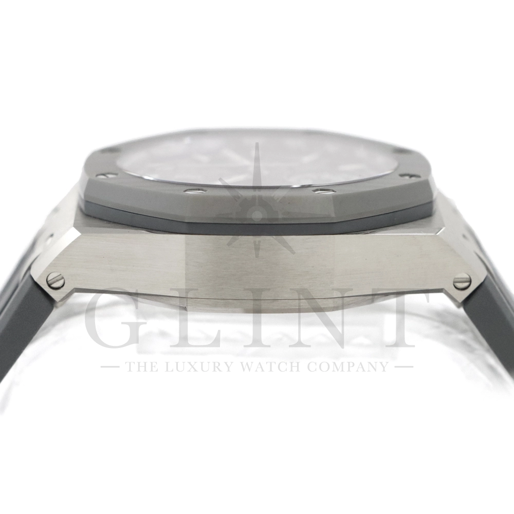 文字盤:「メガタペストリー」模様のグレーダイヤル、ブルーのカウンターと外周ゾーン、蓄光処理を施したホワイトゴールドのアプライドアワーマーカーとロイヤルオーク針、ブルーのインナーベゼル