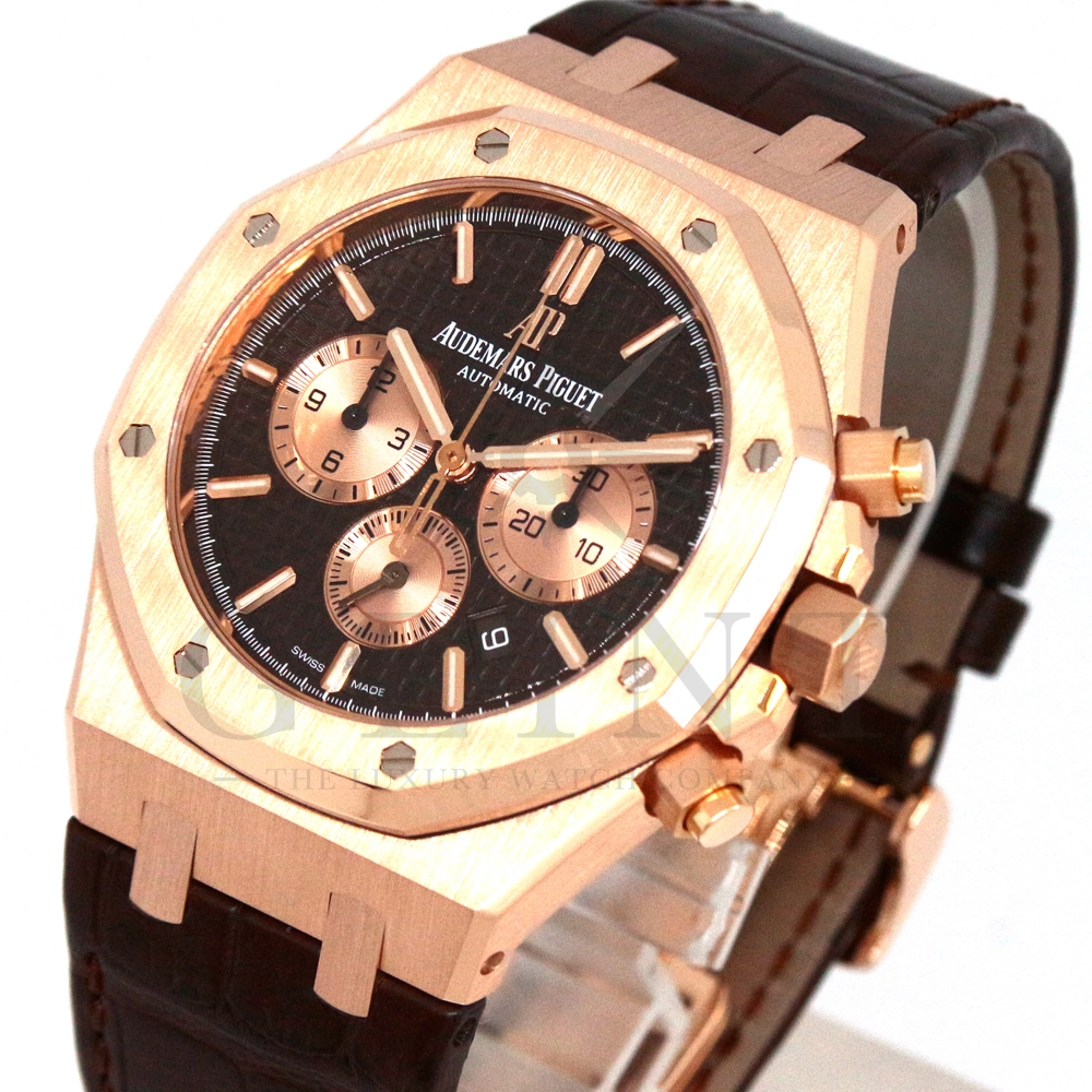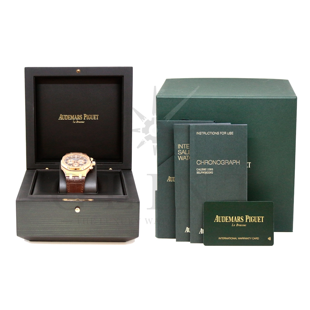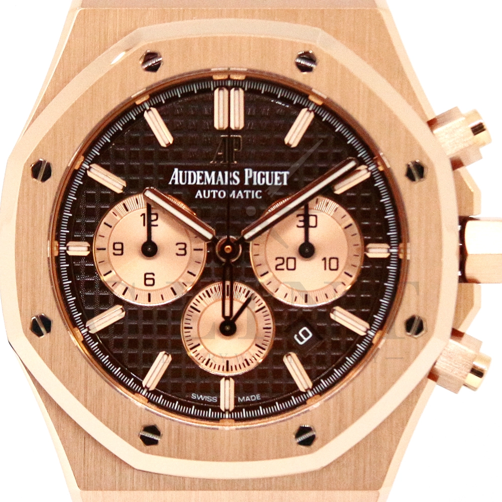 こちらはロイヤル オーク クロノグラフです。SIHH(ジュネーヴサロン)2017にてロイヤル オーク クロノグラフ20周年記念モデルとして発表されたモデル。ケース素材には18Kピンクゴールドを使用しており、洗練された上質な高級感を堪能できるでしょう。装い新たになったコンビカラーのダイヤルには落ち着いた印象のブラウンカラーの「グランド・タペストリー」模様を採用。3時位置・9時位置のサイズが大きくなったカウンターや短く幅が広くなったインデックス、蓄光処理箇所を増やすなど、高い視認性を確保する為の新しい要素が取り入れた仕上がりとなっております。スポーツラインという位置付けのロイヤルオークですが、18Kピンクゴールドとブラウンのアリゲーターストラップの組み合わせによって、落ち着きのある大人のドレスウォッチとしても活躍してくれるでしょう。世界三大時計ブランドが誇る人気のロイヤル オーク クロノグラフは所有者を格別な気持ちにさせてくれる事は間違いないステータス性にも富んだ極上の一本です。