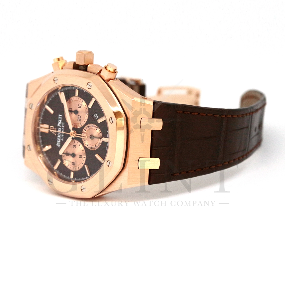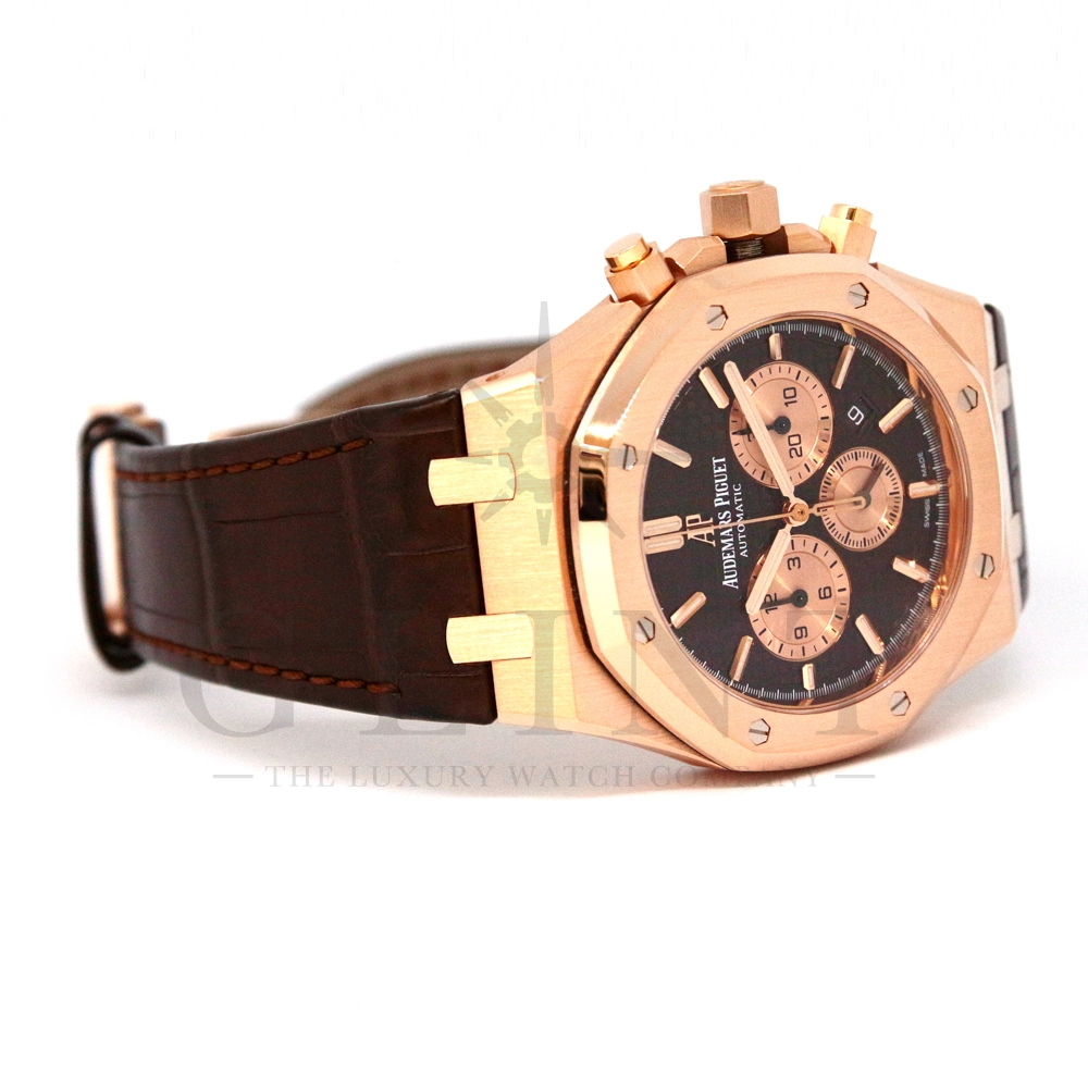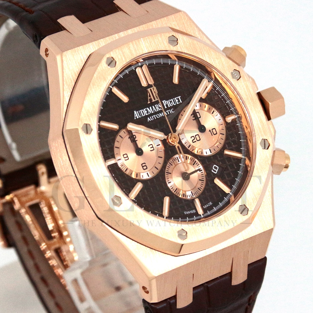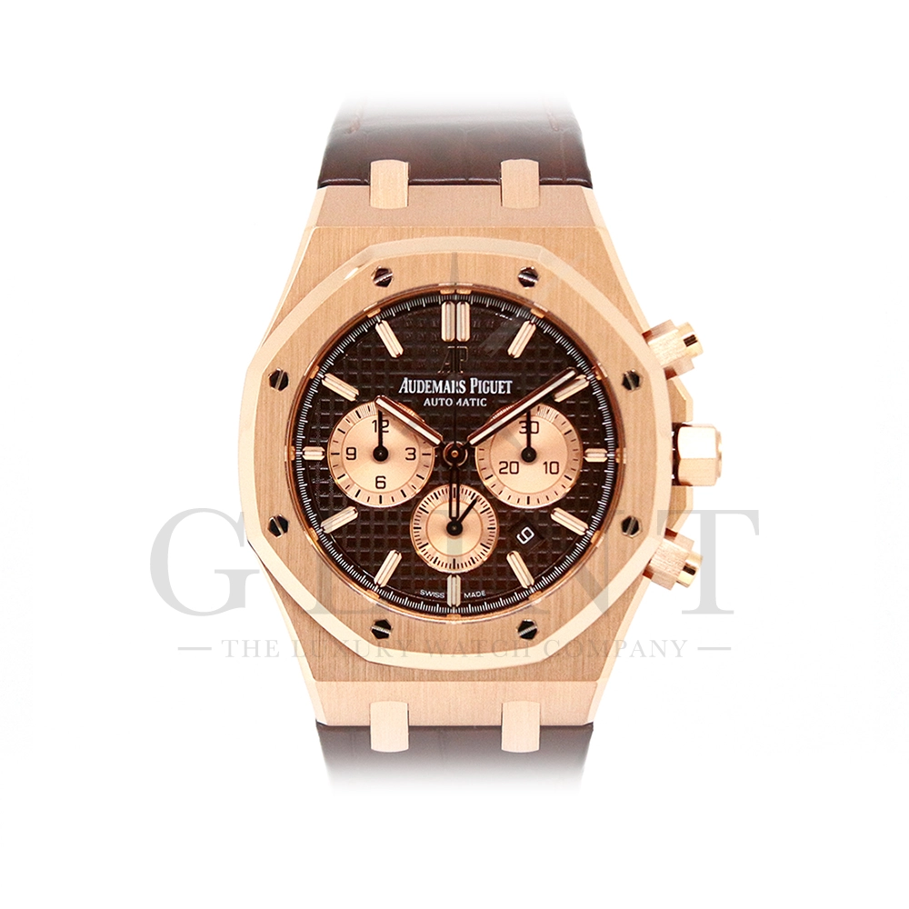 こちらはロイヤル オーク クロノグラフです。SIHH(ジュネーヴサロン)2017にてロイヤル オーク クロノグラフ20周年記念モデルとして発表されたモデル。ケース素材には18Kピンクゴールドを使用しており、洗練された上質な高級感を堪能できるでしょう。装い新たになったコンビカラーのダイヤルには落ち着いた印象のブラウンカラーの「グランド・タペストリー」模様を採用。3時位置・9時位置のサイズが大きくなったカウンターや短く幅が広くなったインデックス、蓄光処理箇所を増やすなど、高い視認性を確保する為の新しい要素が取り入れた仕上がりとなっております。スポーツラインという位置付けのロイヤルオークですが、18Kピンクゴールドとブラウンのアリゲーターストラップの組み合わせによって、落ち着きのある大人のドレスウォッチとしても活躍してくれるでしょう。世界三大時計ブランドが誇る人気のロイヤル オーク クロノグラフは所有者を格別な気持ちにさせてくれる事は間違いないステータス性にも富んだ極上の一本です。