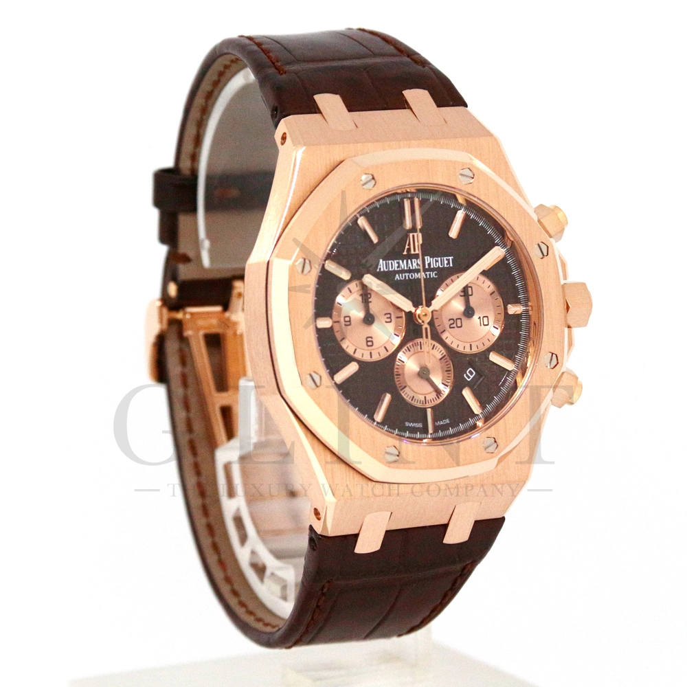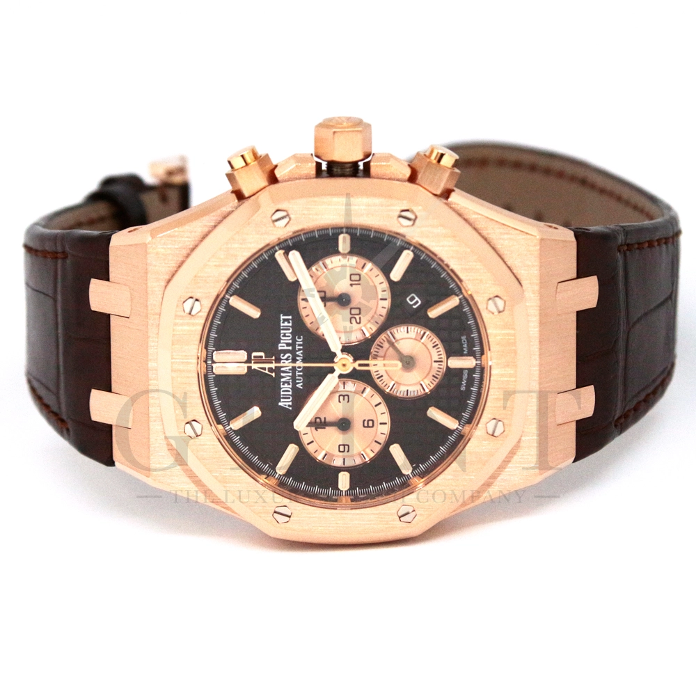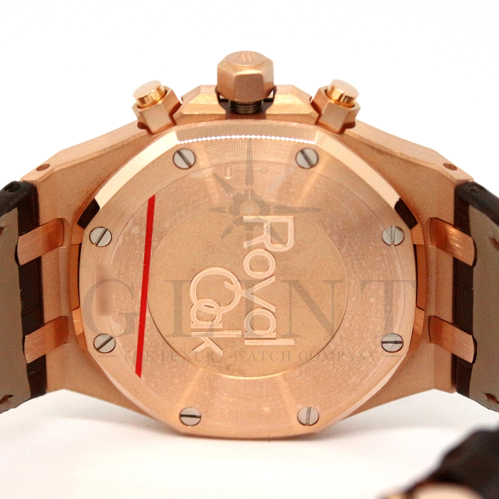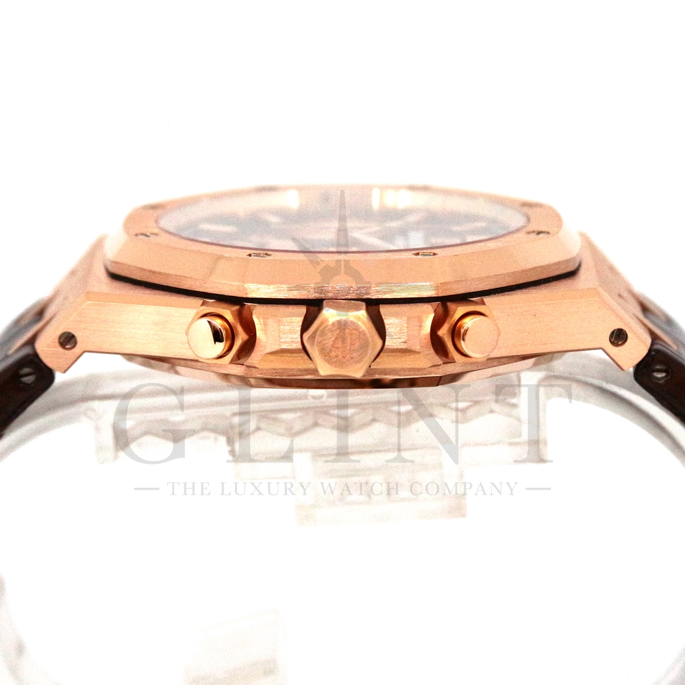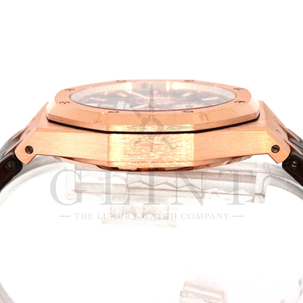 文字盤:「グランド・タペストリー」模様のブラウンダイヤル、ピンクゴールドカラーのカウンター、ピンクゴールド製アプライドアワーマーカーと蓄光処理を施したロイヤルオーク針