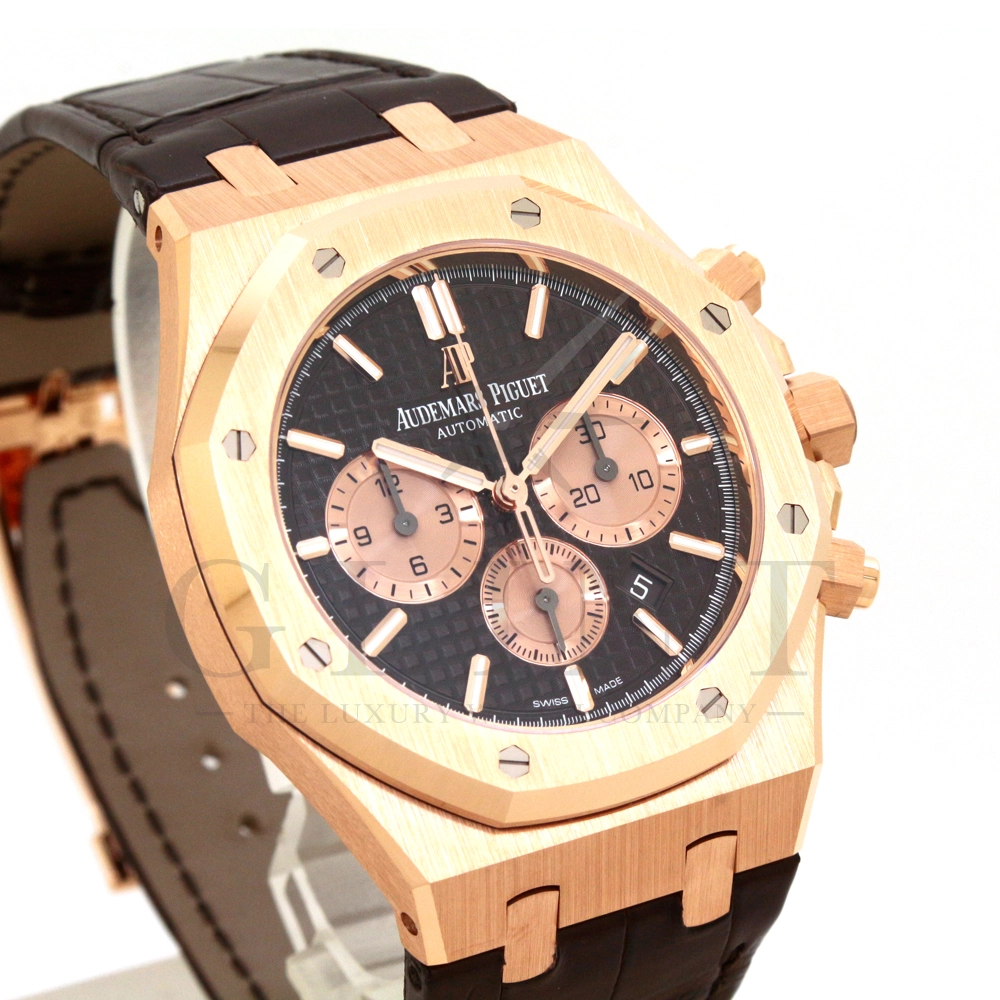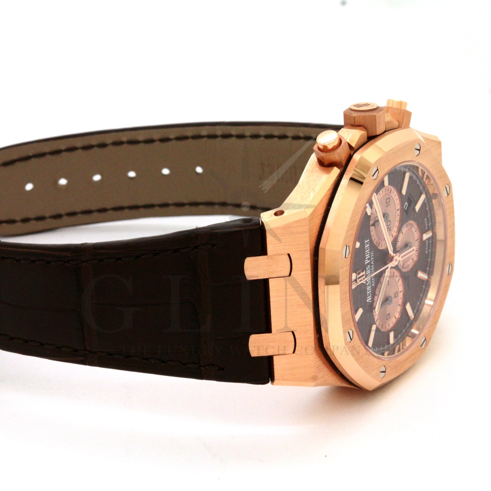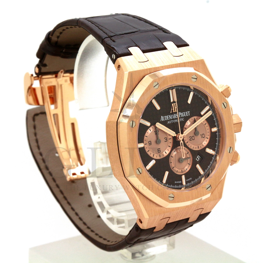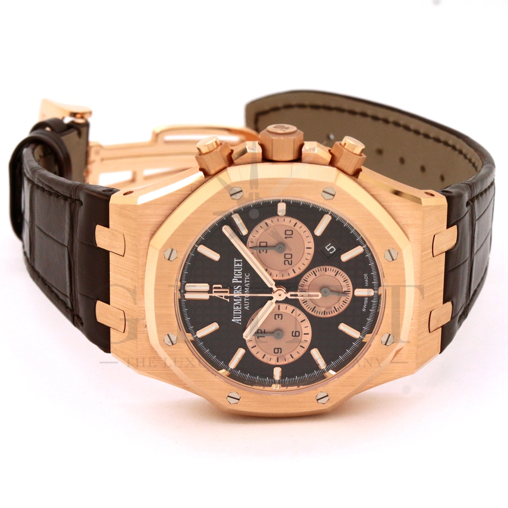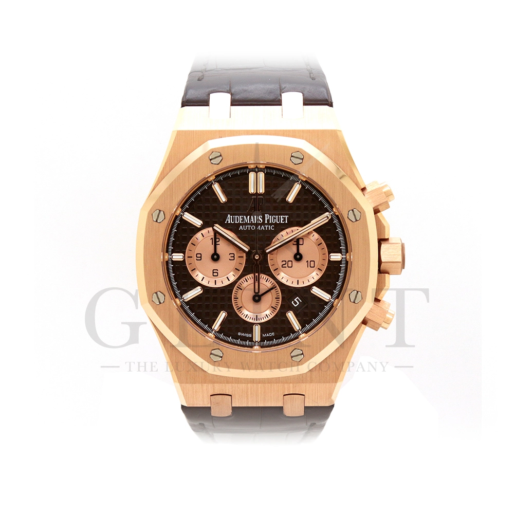 こちらはロイヤル オーク クロノグラフです。SIHH(ジュネーヴサロン)2017にてロイヤル オーク クロノグラフ20周年記念モデルとして発表されたモデル。ケース素材には18Kピンクゴールドを使用しており、洗練された上質な高級感を堪能できるでしょう。装い新たになったコンビカラーのダイヤルには落ち着いた印象のブラウンカラーの「グランド・タペストリー」模様を採用。3時位置・9時位置のサイズが大きくなったカウンターや短く幅が広くなったインデックス、蓄光処理箇所を増やすなど、高い視認性を確保する為の新しい要素が取り入れた仕上がりとなっております。スポーツラインという位置付けのロイヤルオークですが、18Kピンクゴールドとブラウンのアリゲーターストラップの組み合わせによって、落ち着きのある大人のドレスウォッチとしても活躍してくれるでしょう。世界三大時計ブランドが誇る人気のロイヤル オーク クロノグラフは所有者を格別な気持ちにさせてくれる事は間違いないステータス性にも富んだ極上の一本です。