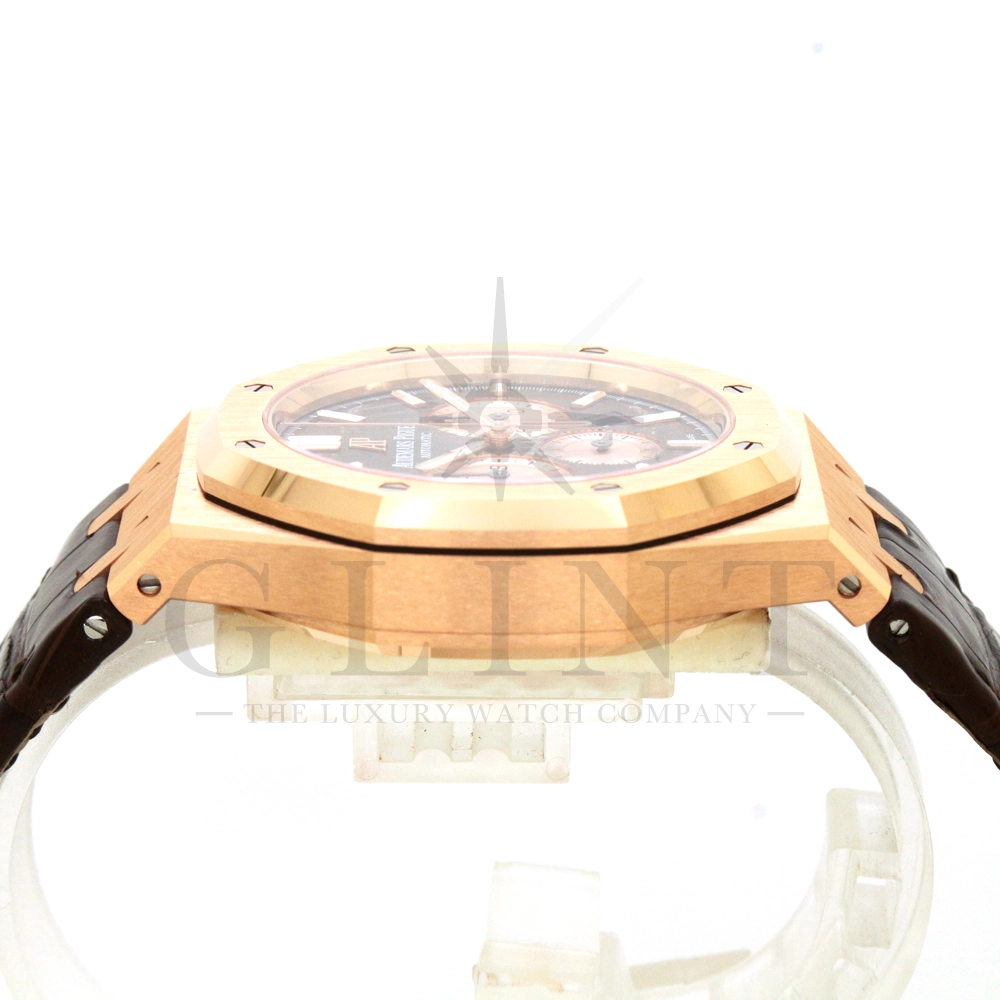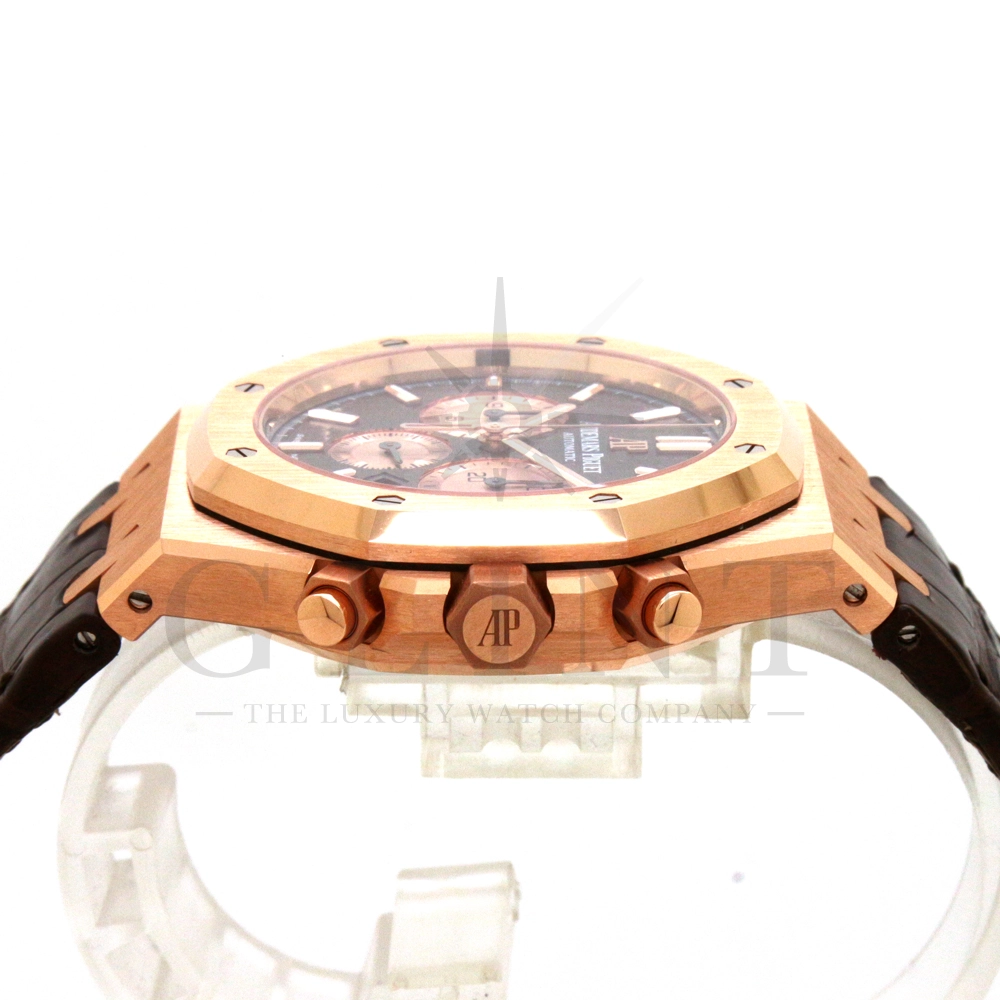 文字盤:「グランド・タペストリー」模様のブラウンダイヤル、ピンクゴールドカラーのカウンター、ピンクゴールド製アプライドアワーマーカーと蓄光処理を施したロイヤルオーク針