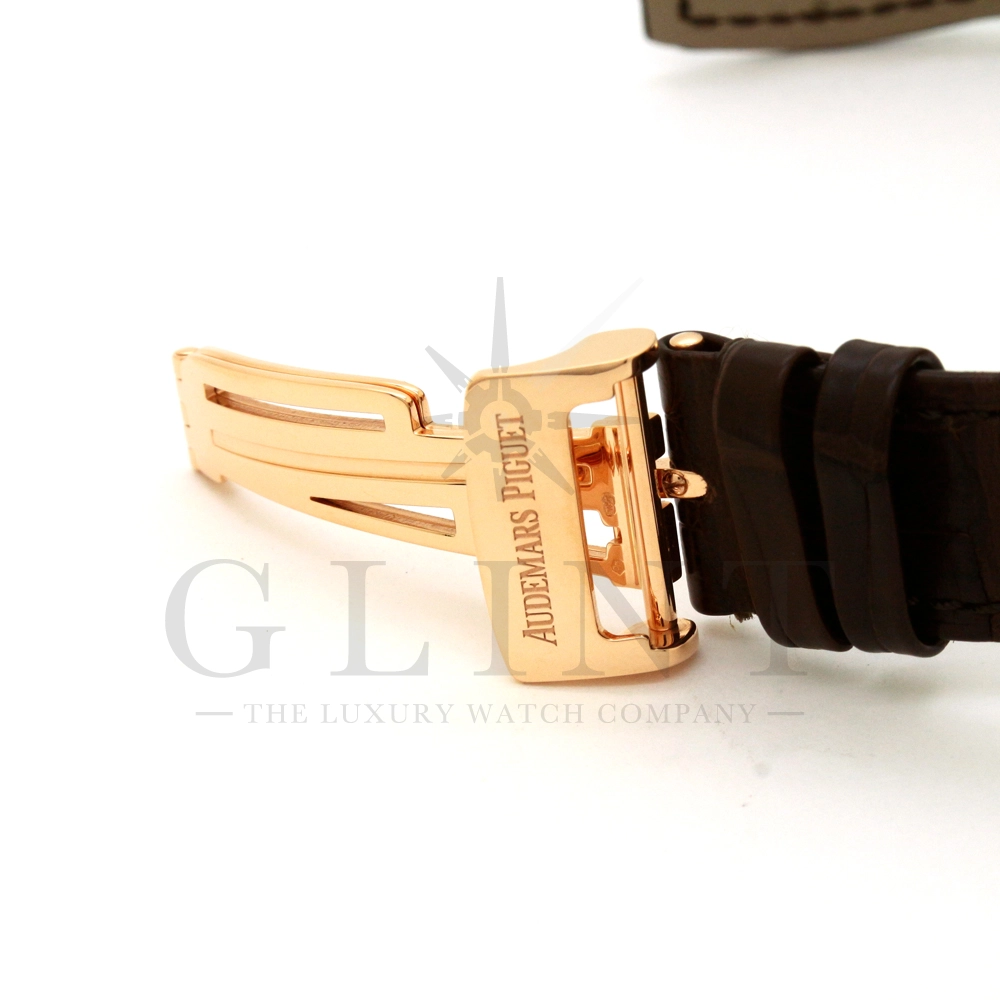 ストラップ:ハンドステッチの「大きな竹斑入り」のブラウンアリゲーターストラップ、18Kピンクゴールド製APフォールディングバックル