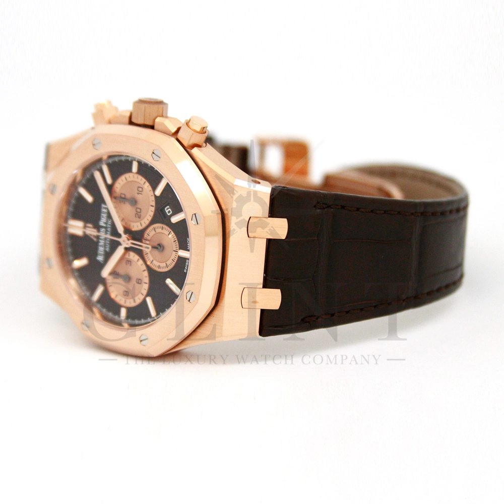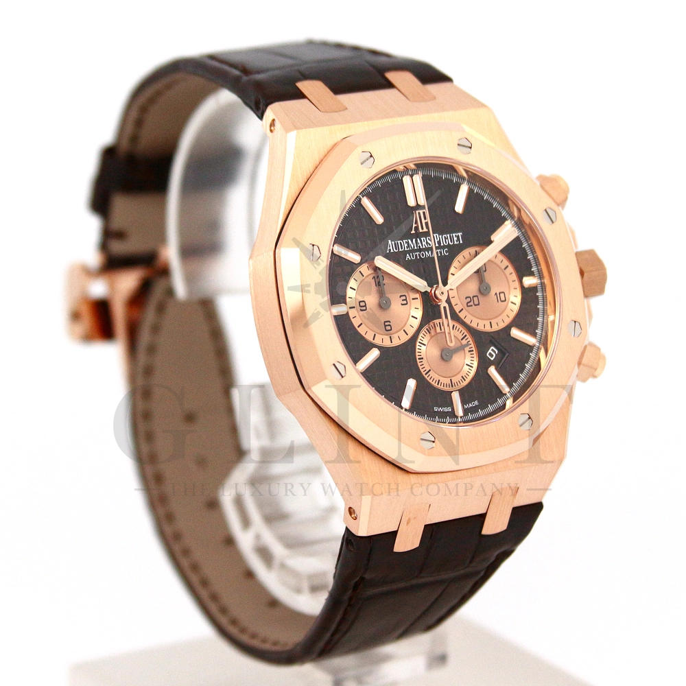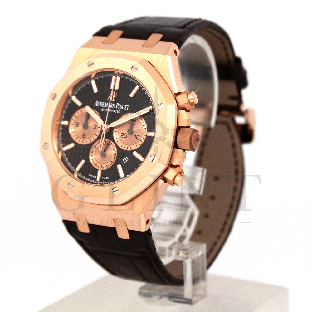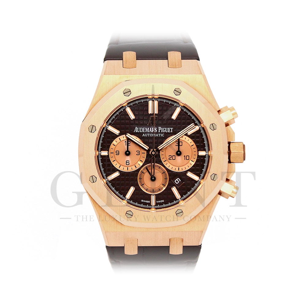 こちらはロイヤル オーク クロノグラフです。SIHH(ジュネーヴサロン)2017にてロイヤル オーク クロノグラフ20周年記念モデルとして発表されたモデル。ケース素材には18Kピンクゴールドを使用しており、洗練された上質な高級感を堪能できるでしょう。装い新たになったコンビカラーのダイヤルには落ち着いた印象のブラウンカラーの「グランド・タペストリー」模様を採用。3時位置・9時位置のサイズが大きくなったカウンターや短く幅が広くなったインデックス、蓄光処理箇所を増やすなど、高い視認性を確保する為の新しい要素が取り入れた仕上がりとなっております。スポーツラインという位置付けのロイヤルオークですが、18Kピンクゴールドとブラウンのアリゲーターストラップの組み合わせによって、落ち着きのある大人のドレスウォッチとしても活躍してくれるでしょう。世界三大時計ブランドが誇る人気のロイヤル オーク クロノグラフは所有者を格別な気持ちにさせてくれる事は間違いないステータス性にも富んだ極上の一本です。