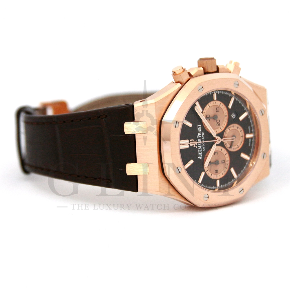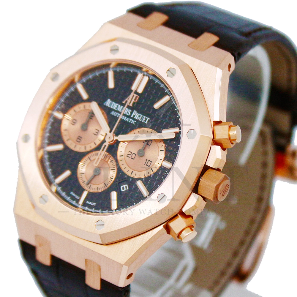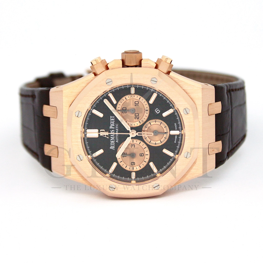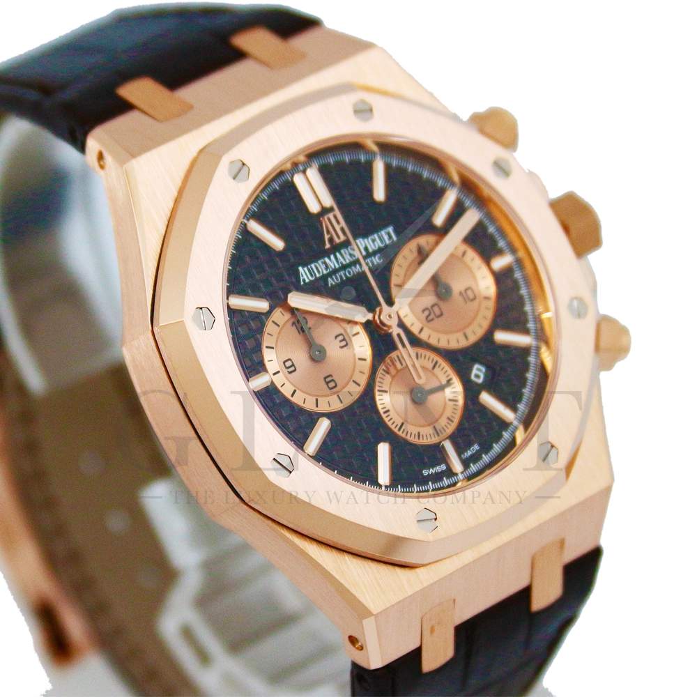 こちらはロイヤル オーク クロノグラフです。SIHH(ジュネーヴサロン)2017にてロイヤル オーク クロノグラフ20周年記念モデルとして発表されたモデル。ケース素材には18Kピンクゴールドを使用しており、洗練された上質な高級感を堪能できるでしょう。装い新たになったコンビカラーのダイヤルには落ち着いた印象のブラウンカラーの「グランド・タペストリー」模様を採用。3時位置・9時位置のサイズが大きくなったカウンターや短く幅が広くなったインデックス、蓄光処理箇所を増やすなど、高い視認性を確保する為の新しい要素が取り入れた仕上がりとなっております。スポーツラインという位置付けのロイヤルオークですが、18Kピンクゴールドとブラウンのアリゲーターストラップの組み合わせによって、落ち着きのある大人のドレスウォッチとしても活躍してくれるでしょう。世界三大時計ブランドが誇る人気のロイヤル オーク クロノグラフは所有者を格別な気持ちにさせてくれる事は間違いないステータス性にも富んだ極上の一本です。