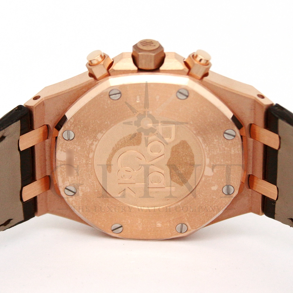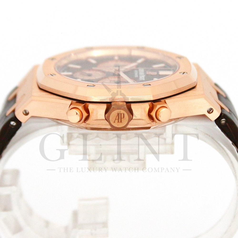 文字盤:「グランド・タペストリー」模様のブラウンダイヤル、ピンクゴールドカラーのカウンター、ピンクゴールド製アプライドアワーマーカーと蓄光処理を施したロイヤルオーク針