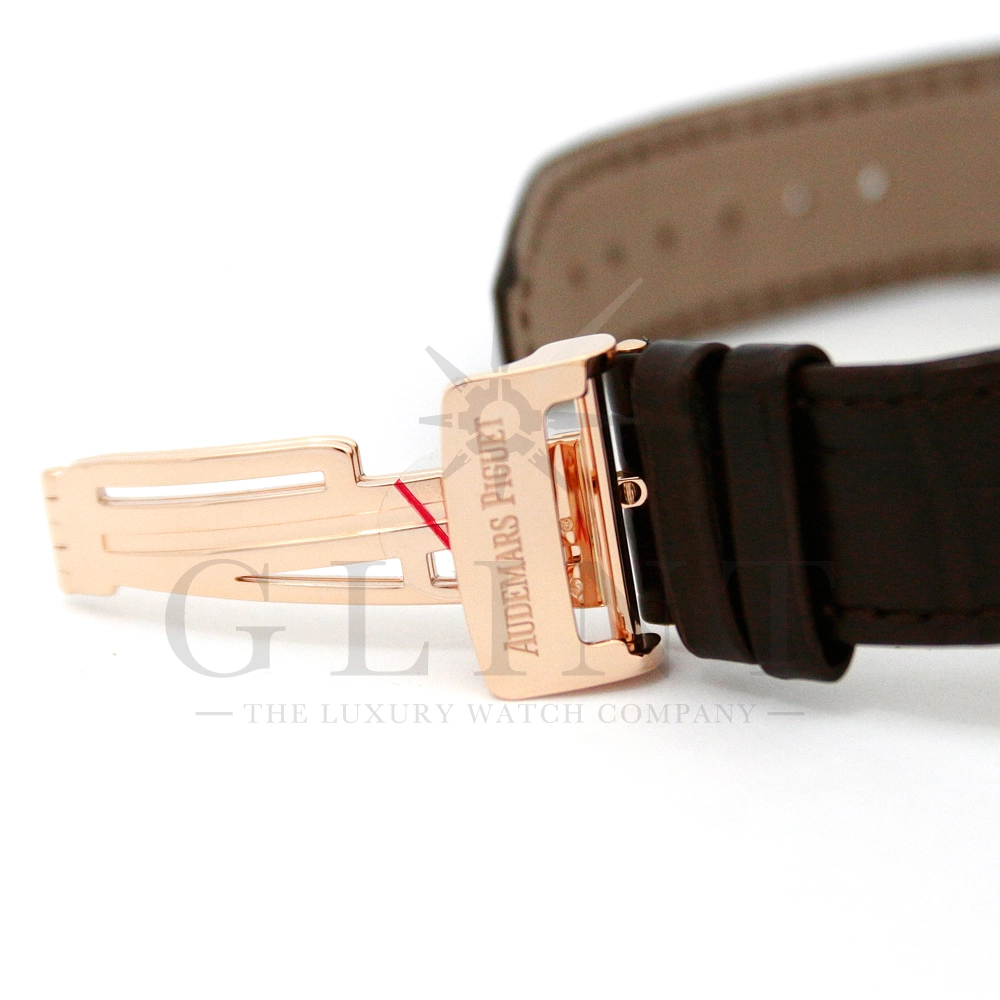 ストラップ:ハンドステッチの「大きな竹斑入り」のブラウンアリゲーターストラップ 18Kピンクゴールド製APフォールディングバックル