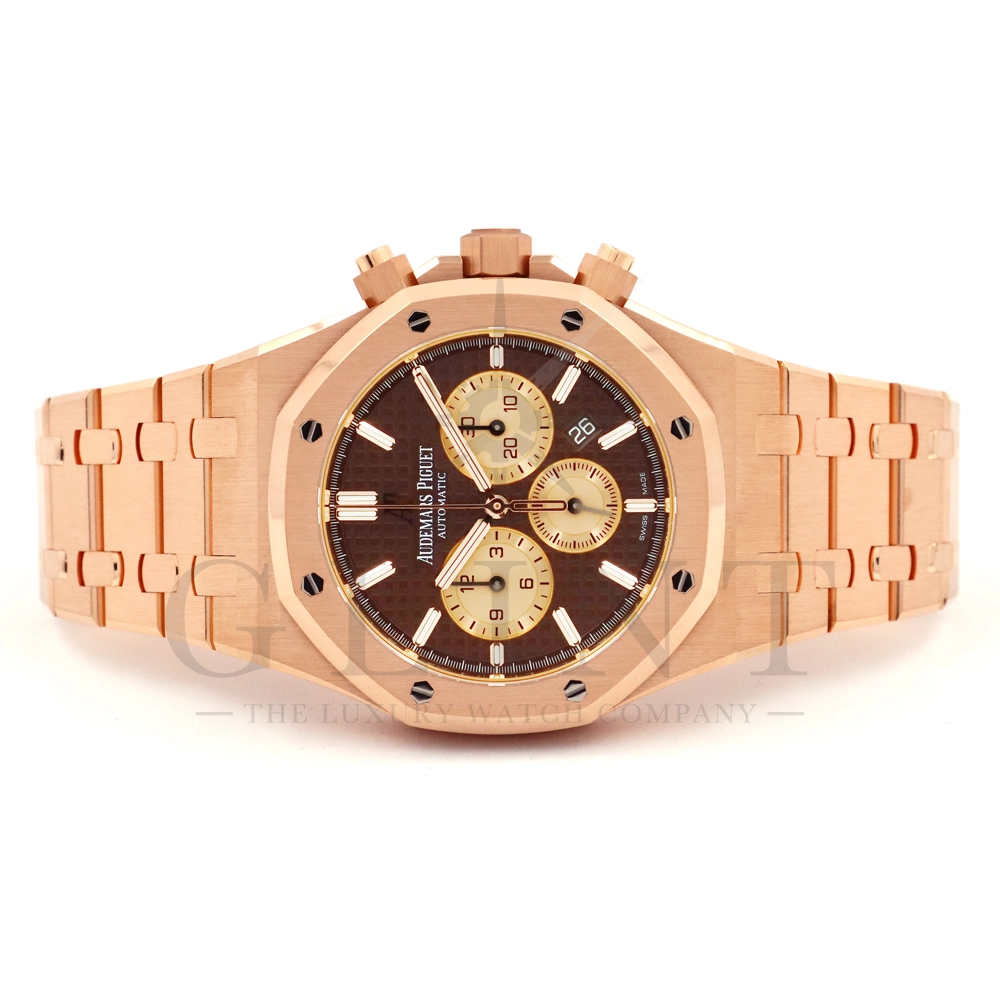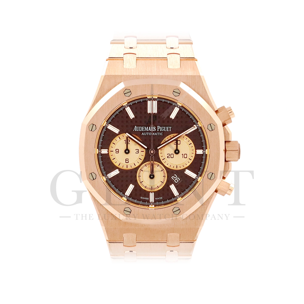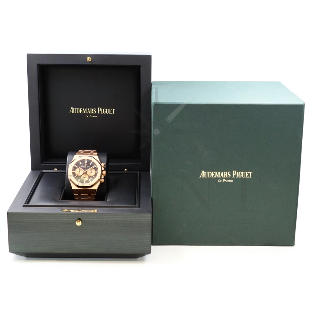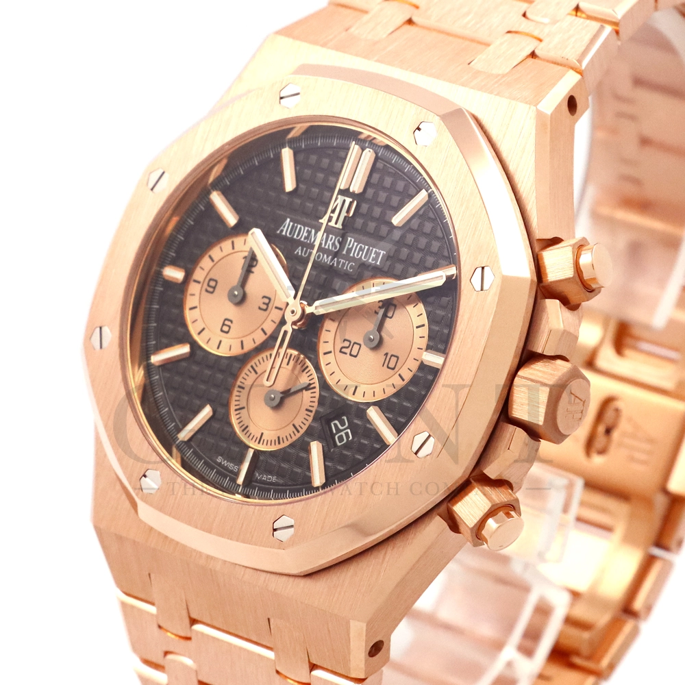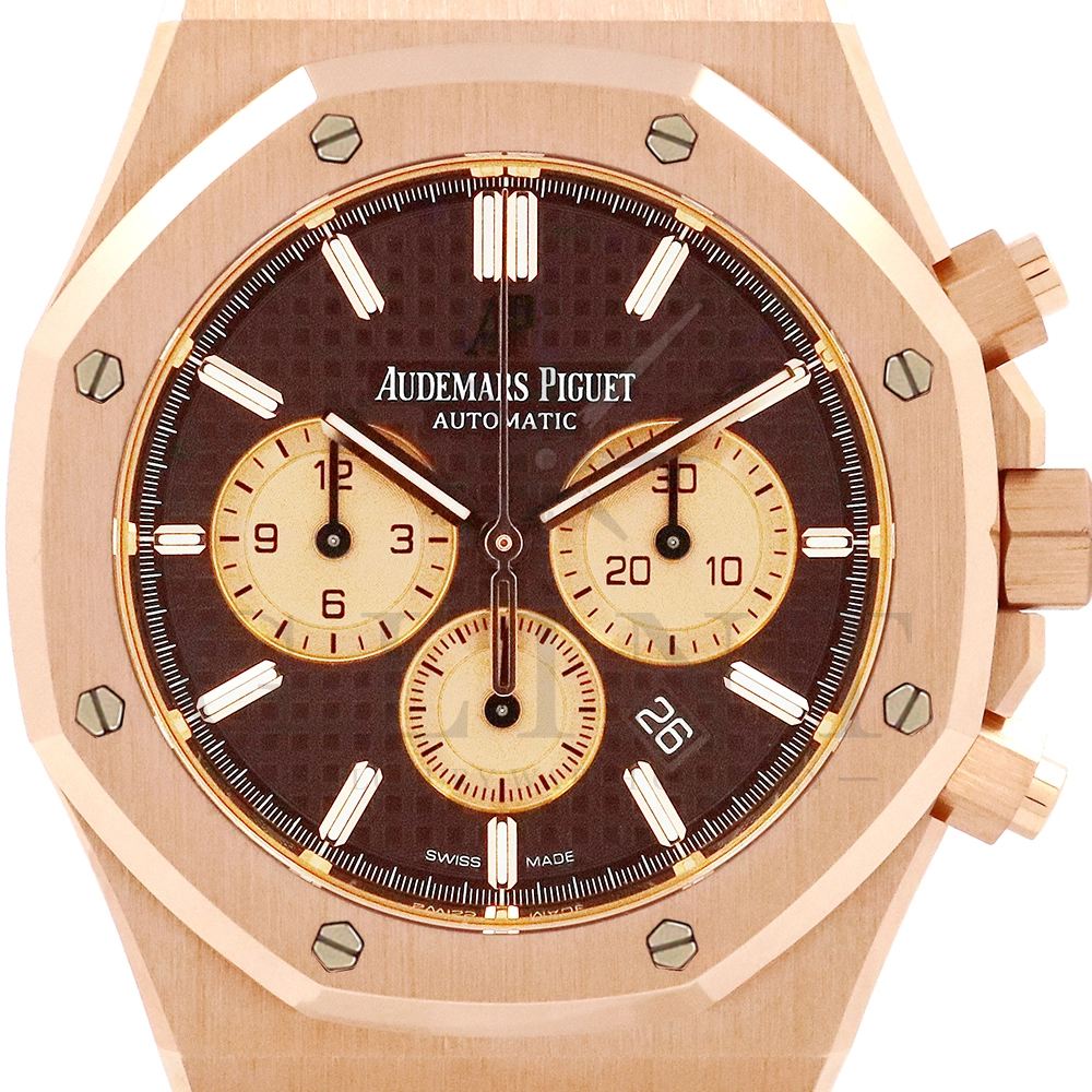 こちらはロイヤル オーク クロノグラフです。2017年にロイヤル オーク クロノグラフ20周年記念モデルとして発表されたモデル。ケースとブレスレット素材には18Kピンクゴールドを使用しており、洗練された上質な高級感を堪能できるでしょう。コンビカラーのダイヤルには落ち着いた印象のブラウンカラーの「グランド・タペストリー」模様を採用。3時位置・9時位置のサイズが大きくなったカウンターや短く幅が広くなったインデックス、蓄光処理箇所を増やすなど、高い視認性を確保する為の新しい要素が取り入れた仕上がりとなっております。世界三大時計ブランドが誇る人気のロイヤル オーク クロノグラフは所有者を格別な気持ちにさせてくれる事は間違いないステータス性にも富んだ極上の一本です。