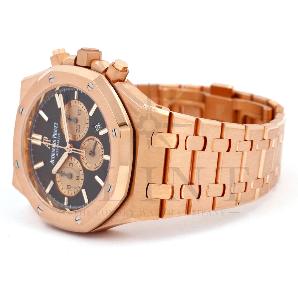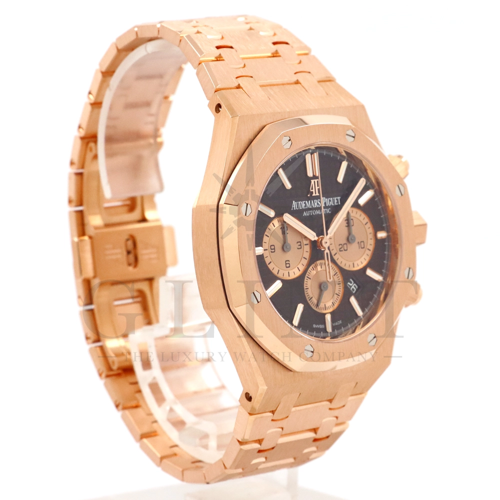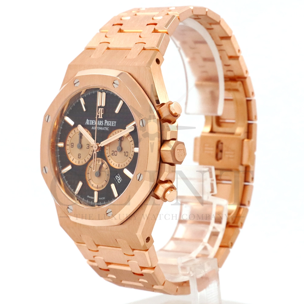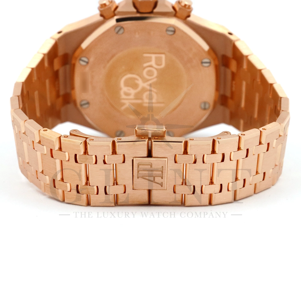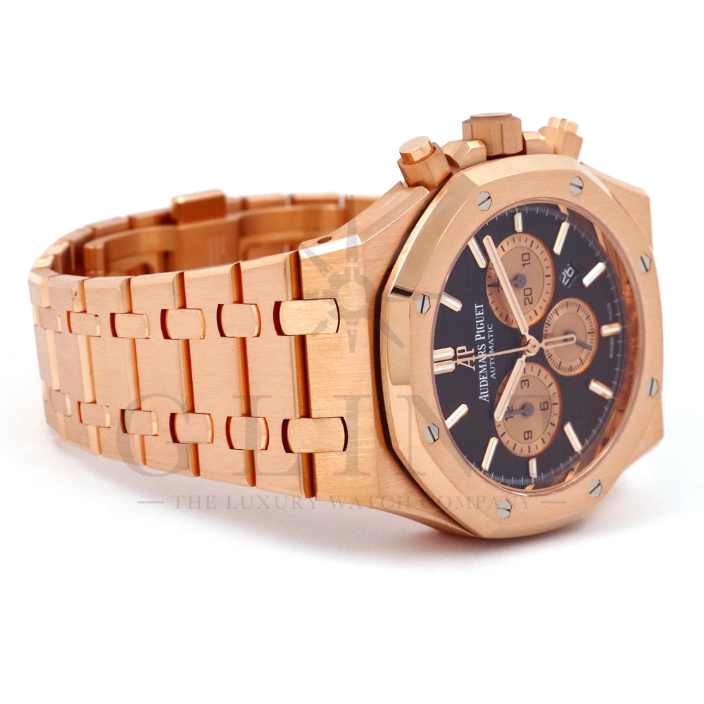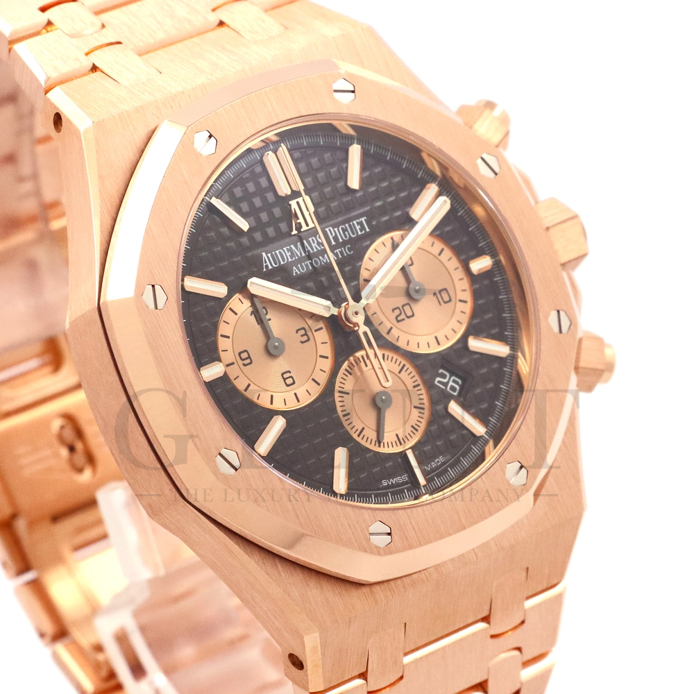 こちらはロイヤル オーク クロノグラフです。2017年にロイヤル オーク クロノグラフ20周年記念モデルとして発表されたモデル。ケースとブレスレット素材には18Kピンクゴールドを使用しており、洗練された上質な高級感を堪能できるでしょう。コンビカラーのダイヤルには落ち着いた印象のブラウンカラーの「グランド・タペストリー」模様を採用。3時位置・9時位置のサイズが大きくなったカウンターや短く幅が広くなったインデックス、蓄光処理箇所を増やすなど、高い視認性を確保する為の新しい要素が取り入れた仕上がりとなっております。世界三大時計ブランドが誇る人気のロイヤル オーク クロノグラフは所有者を格別な気持ちにさせてくれる事は間違いないステータス性にも富んだ極上の一本です。