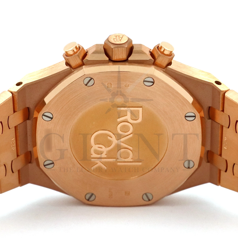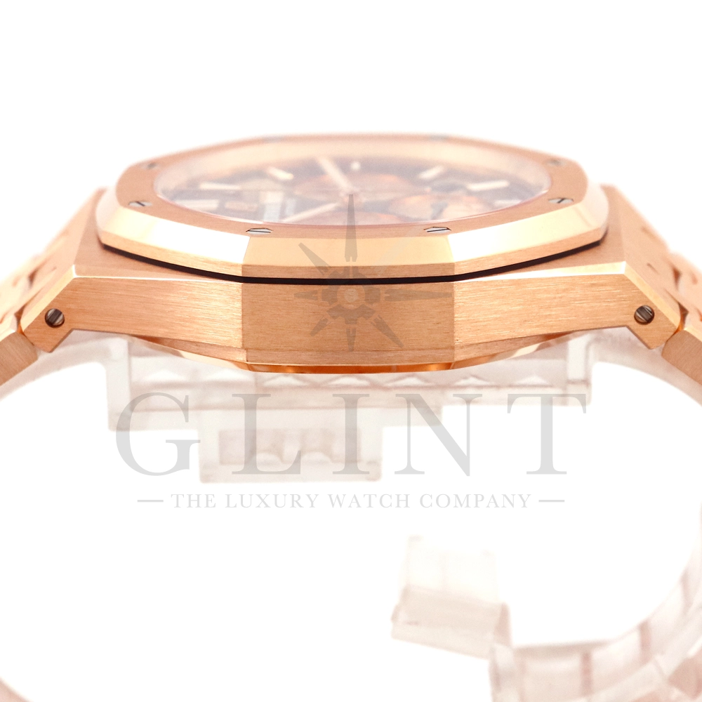 文字盤:「グランド・タペストリー」模様のブラウンダイヤル、ピンクゴールドカラーのカウンター、ピンクゴールド製アプライドアワーマーカーと蓄光処理を施したロイヤルオーク針