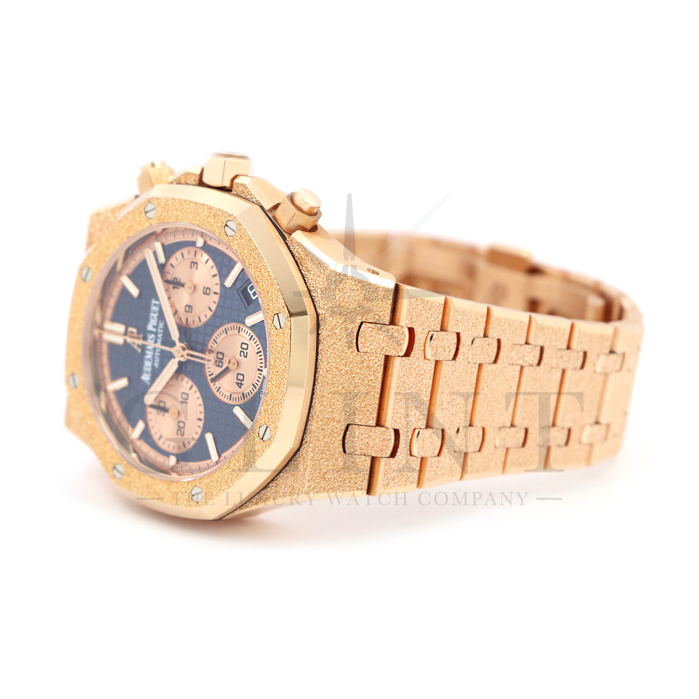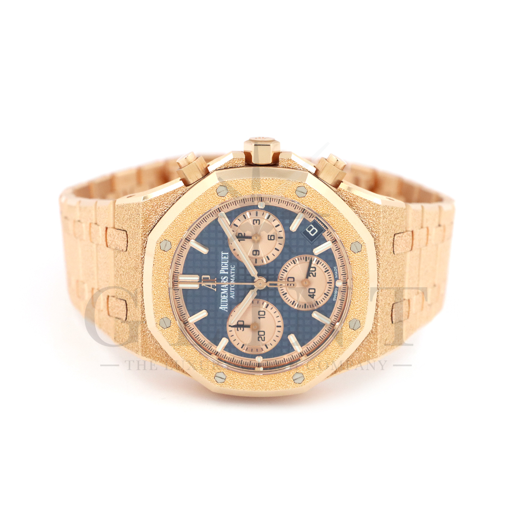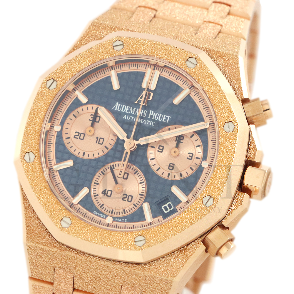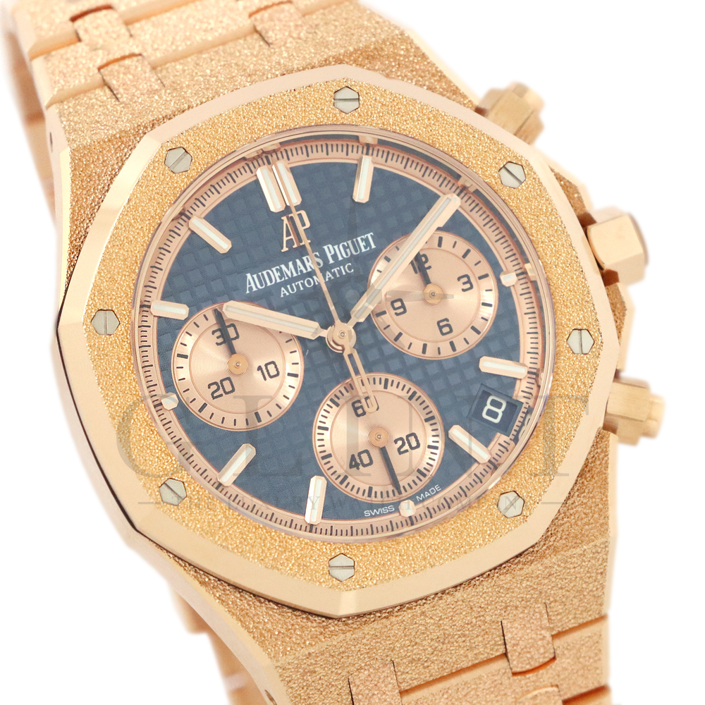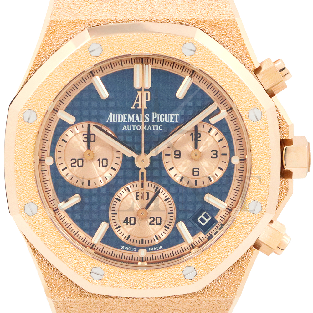 文字盤:「グランドタペストリー」模様のブルーダイヤル、ピンクゴールドカラーのカウンター、蓄光処理を施したピンクゴールドのアプライドアワーマーカーとロイヤルオーク針