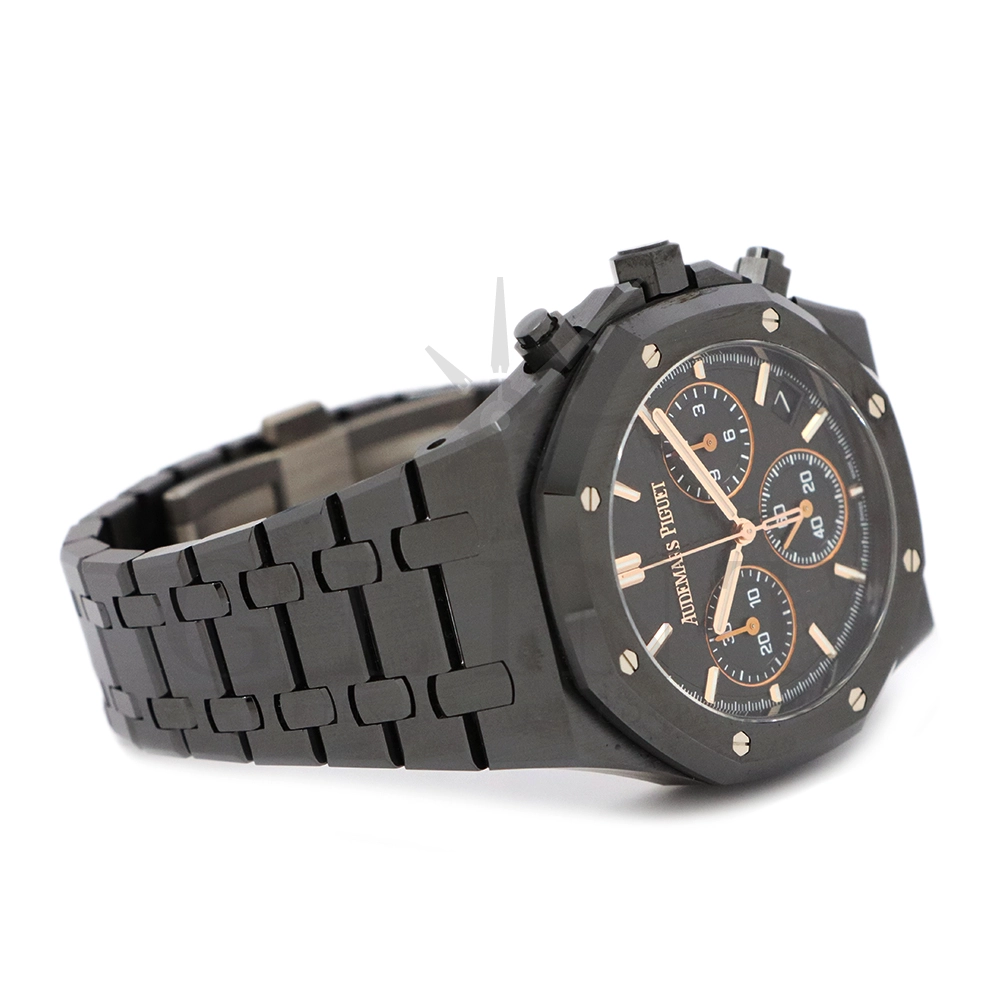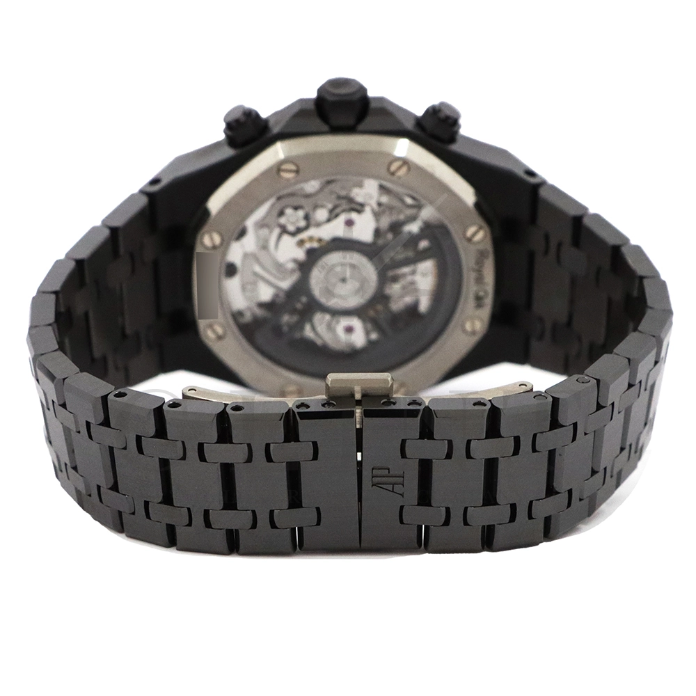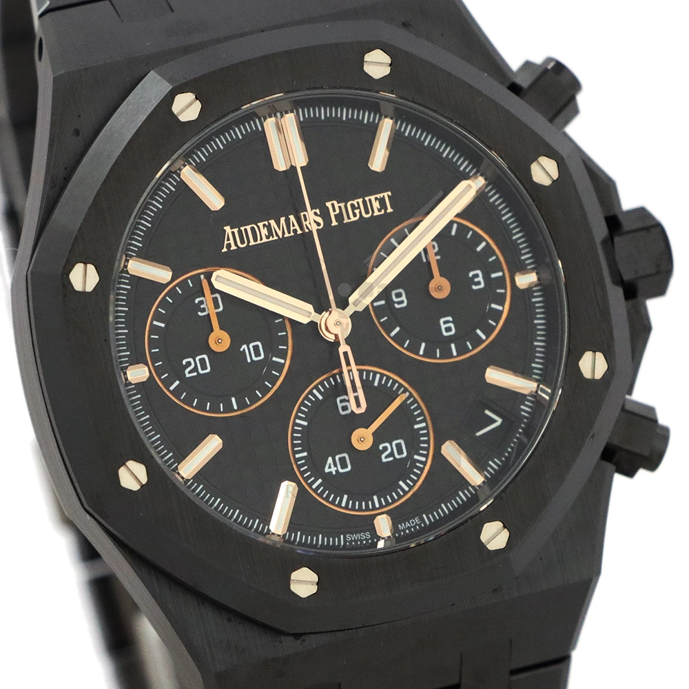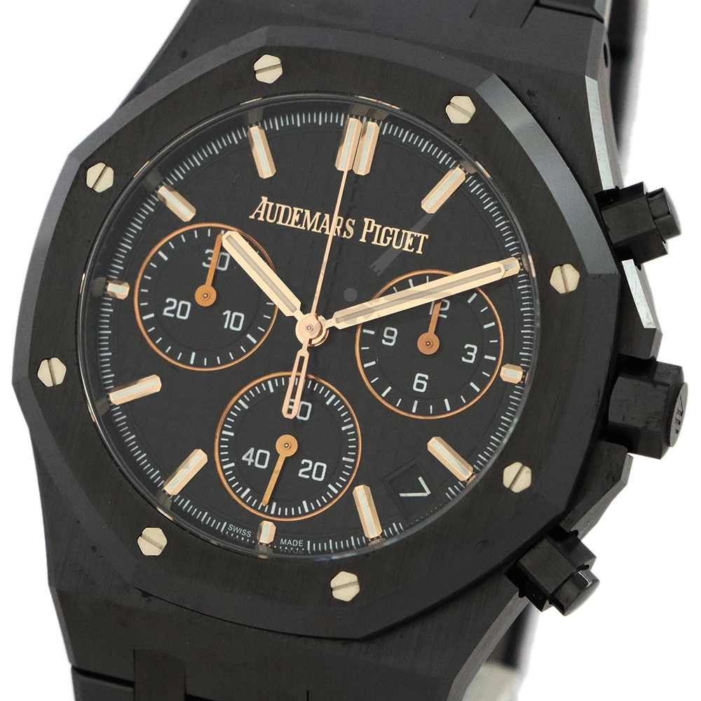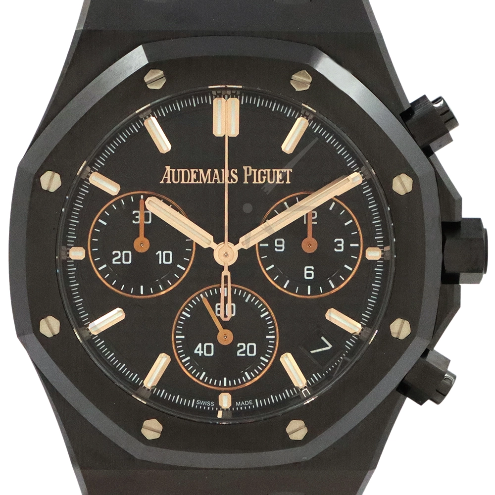 こちらは2022年に発表されたロイヤルオーク クロノグラフです。41mmのロイヤルオーク クロノグラフではオーデマピゲ初となるブラックセラミックモデル。プレポリッシュ、プレサテンブラッシュで準備された一つ一つのセラミックの部品を、手作業でポリッシュ面取りやオーデマピゲのトレードマークでもあるサテンブラッシュとポリッシュを組み合わせながら仕上げ、非常に高い耐久性と耐傷性、美しい光の反射を実現します。ブラックダイヤルにはピンクゴールドをアクセントとして組み合わせ、緻密な深みを放つブラックセラミックとのバイカラーが洗練されたコントラストを強調。ムーブメントには、CODE.11.59でも使用されている最新世代のCal.4401を搭載しており、約70時間のパワーリザーブやフライバッククロノグラフを備え、高い実用性を誇ります。シースルーバックからはコート・ド・ジュネーブなど美しい仕上げが施されたムーブメントやブラックカラーに統一されたローターを堪能いただけます。伝統の技術をコンテンポラリーなデザインで包んだタイムレスなエレガンスさを感じられる至極の一本です。