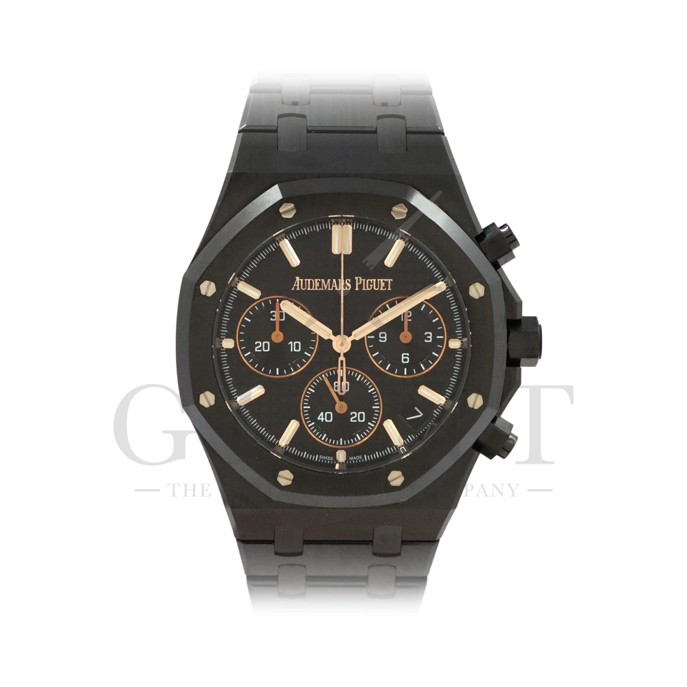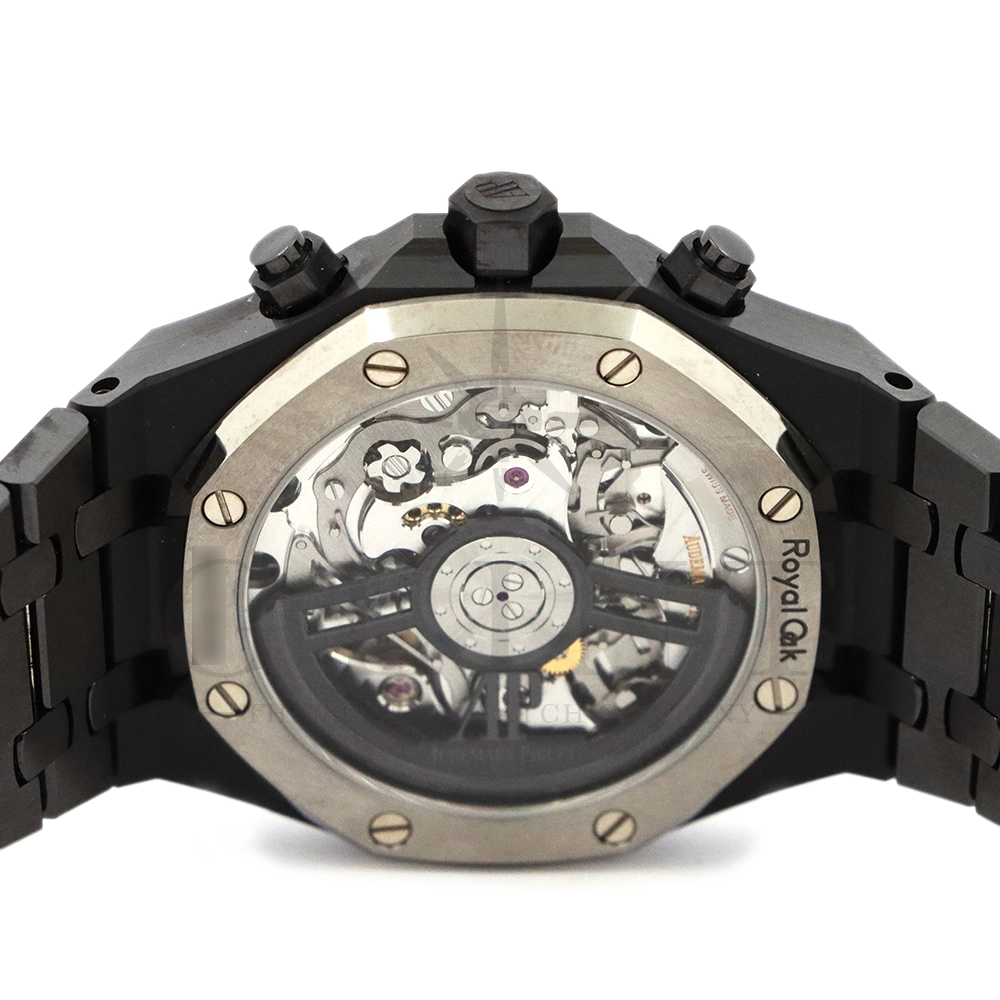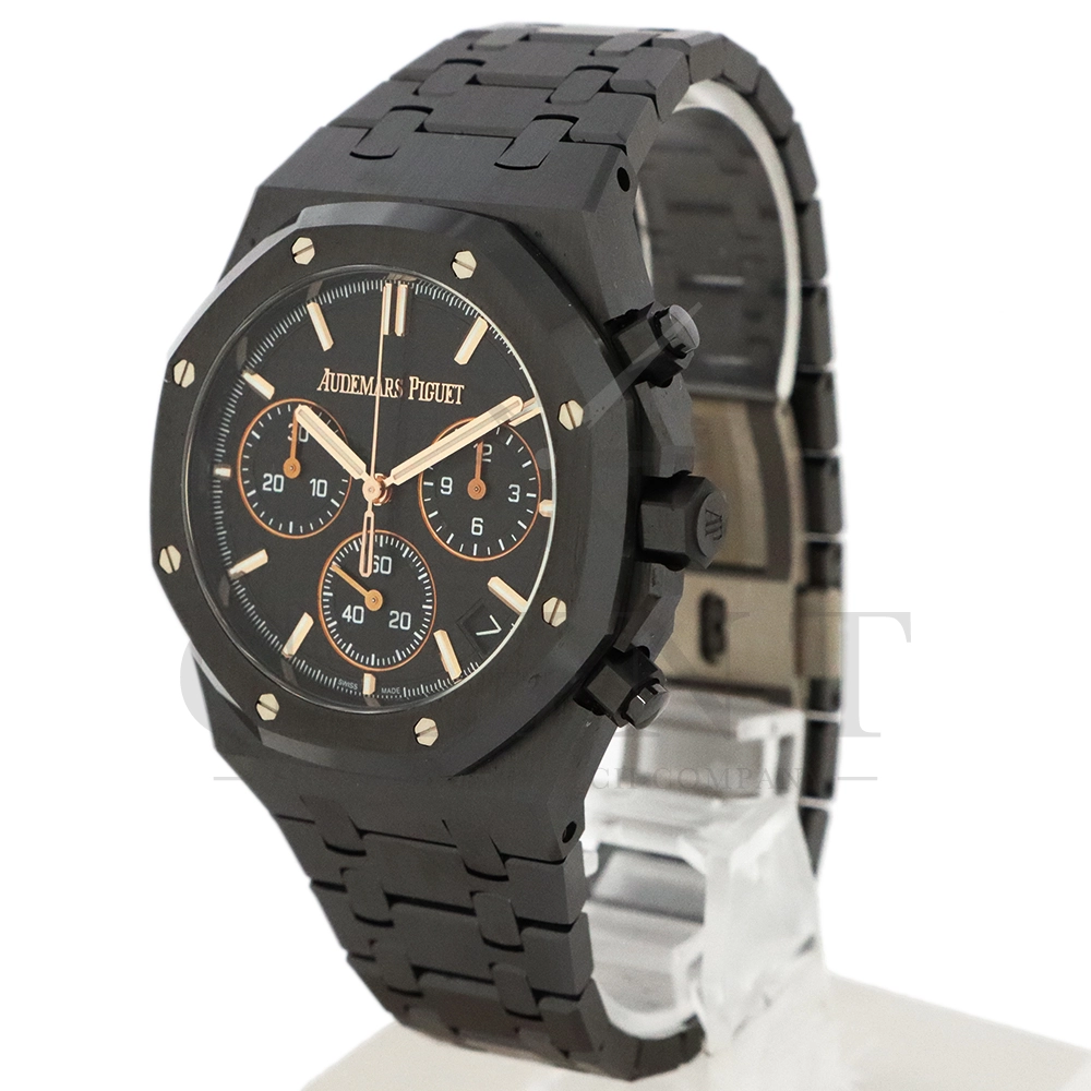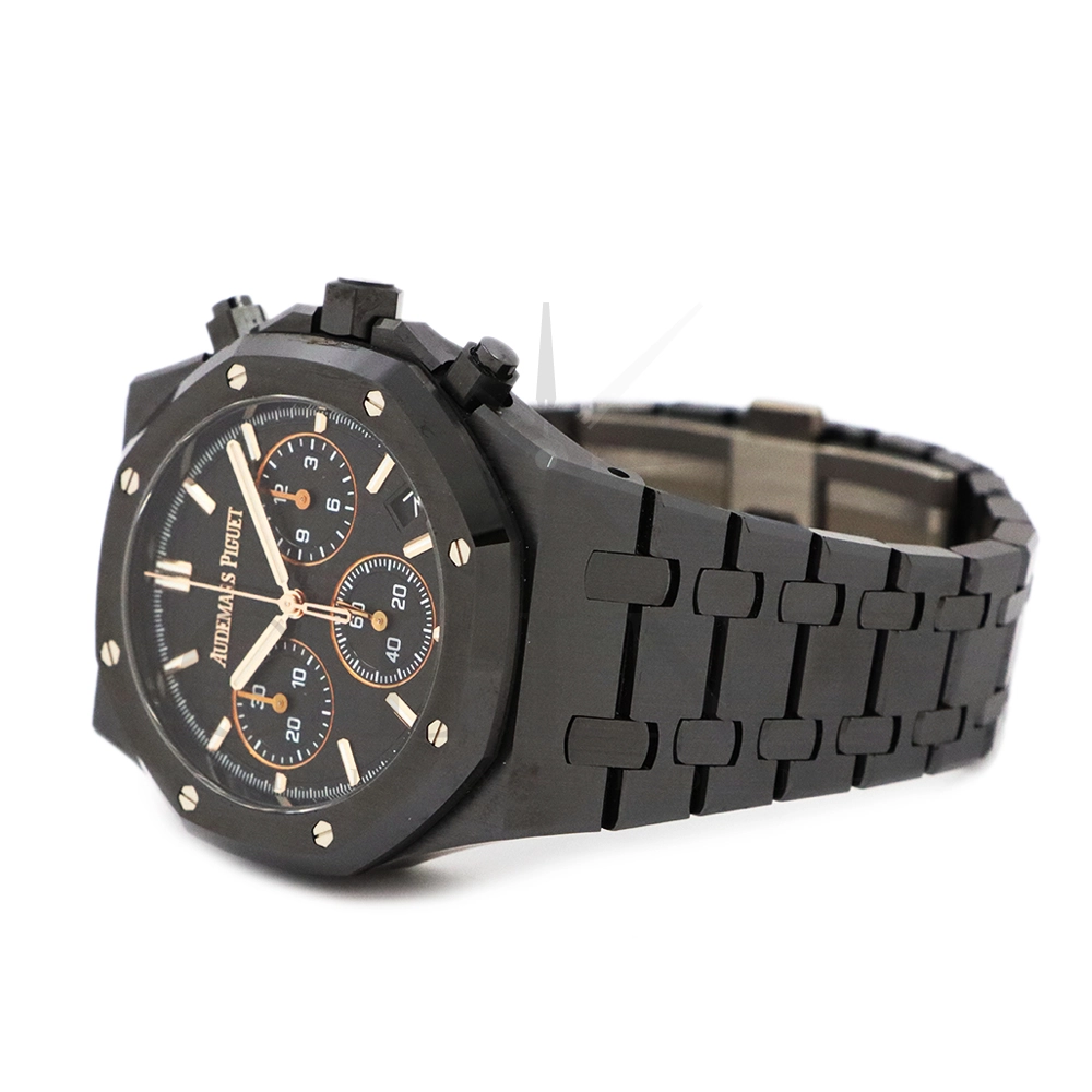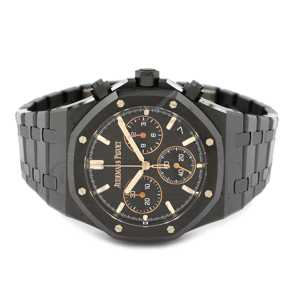 こちらは2022年に発表されたロイヤルオーク クロノグラフです。41mmのロイヤルオーク クロノグラフではオーデマピゲ初となるブラックセラミックモデル。プレポリッシュ、プレサテンブラッシュで準備された一つ一つのセラミックの部品を、手作業でポリッシュ面取りやオーデマピゲのトレードマークでもあるサテンブラッシュとポリッシュを組み合わせながら仕上げ、非常に高い耐久性と耐傷性、美しい光の反射を実現します。ブラックダイヤルにはピンクゴールドをアクセントとして組み合わせ、緻密な深みを放つブラックセラミックとのバイカラーが洗練されたコントラストを強調。ムーブメントには、CODE.11.59でも使用されている最新世代のCal.4401を搭載しており、約70時間のパワーリザーブやフライバッククロノグラフを備え、高い実用性を誇ります。シースルーバックからはコート・ド・ジュネーブなど美しい仕上げが施されたムーブメントやブラックカラーに統一されたローターを堪能いただけます。伝統の技術をコンテンポラリーなデザインで包んだタイムレスなエレガンスさを感じられる至極の一本です。
