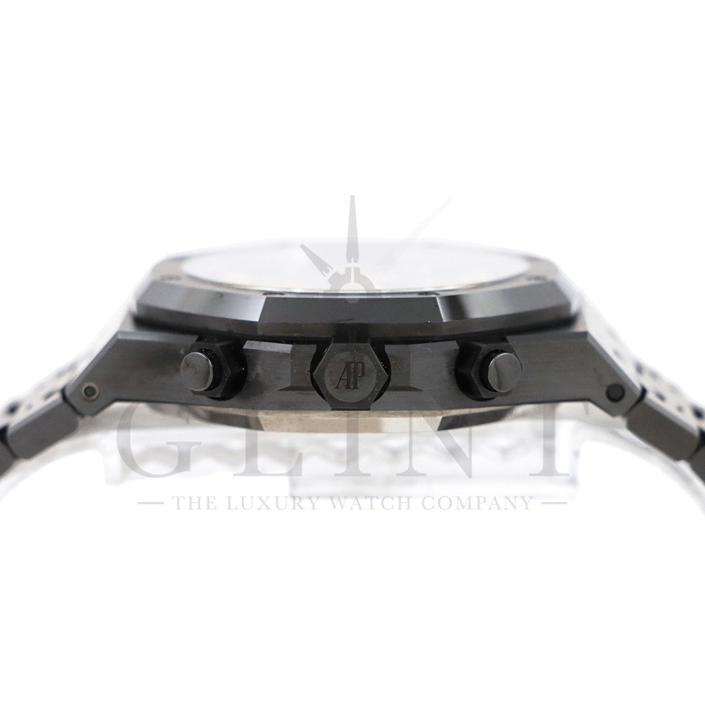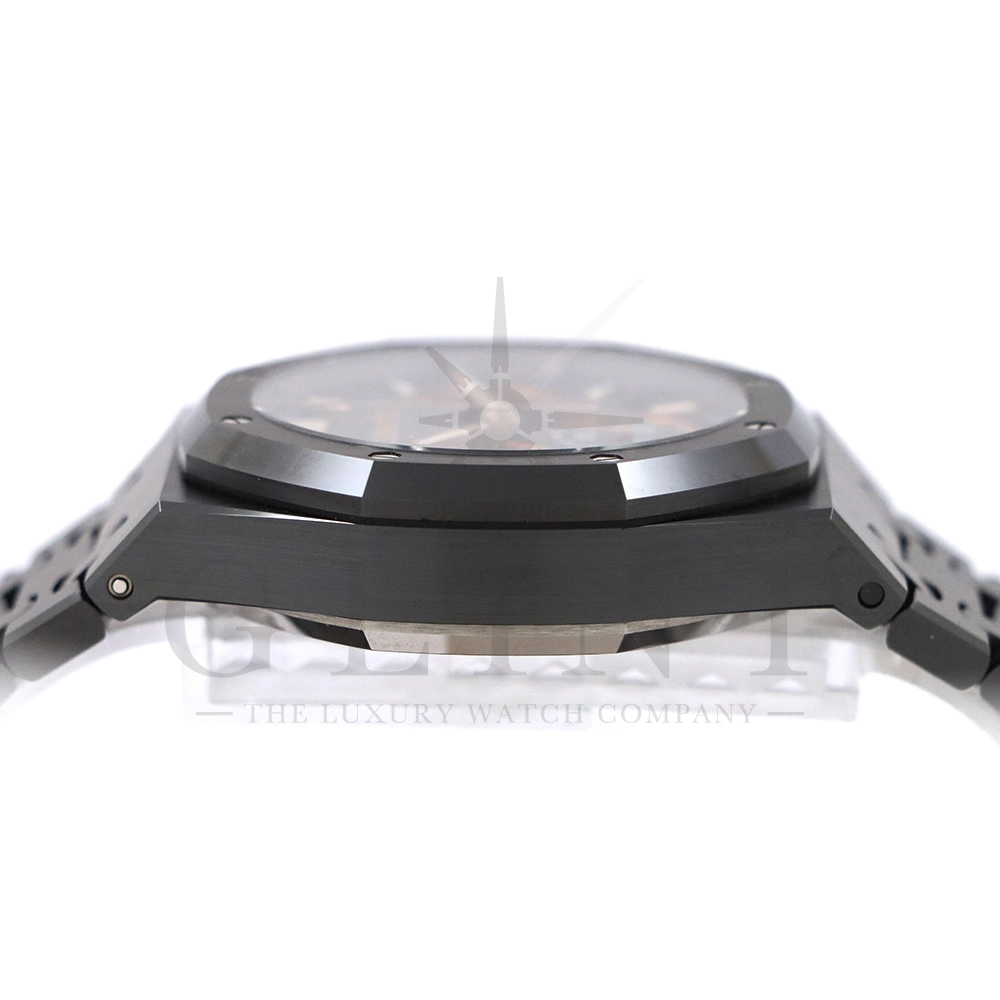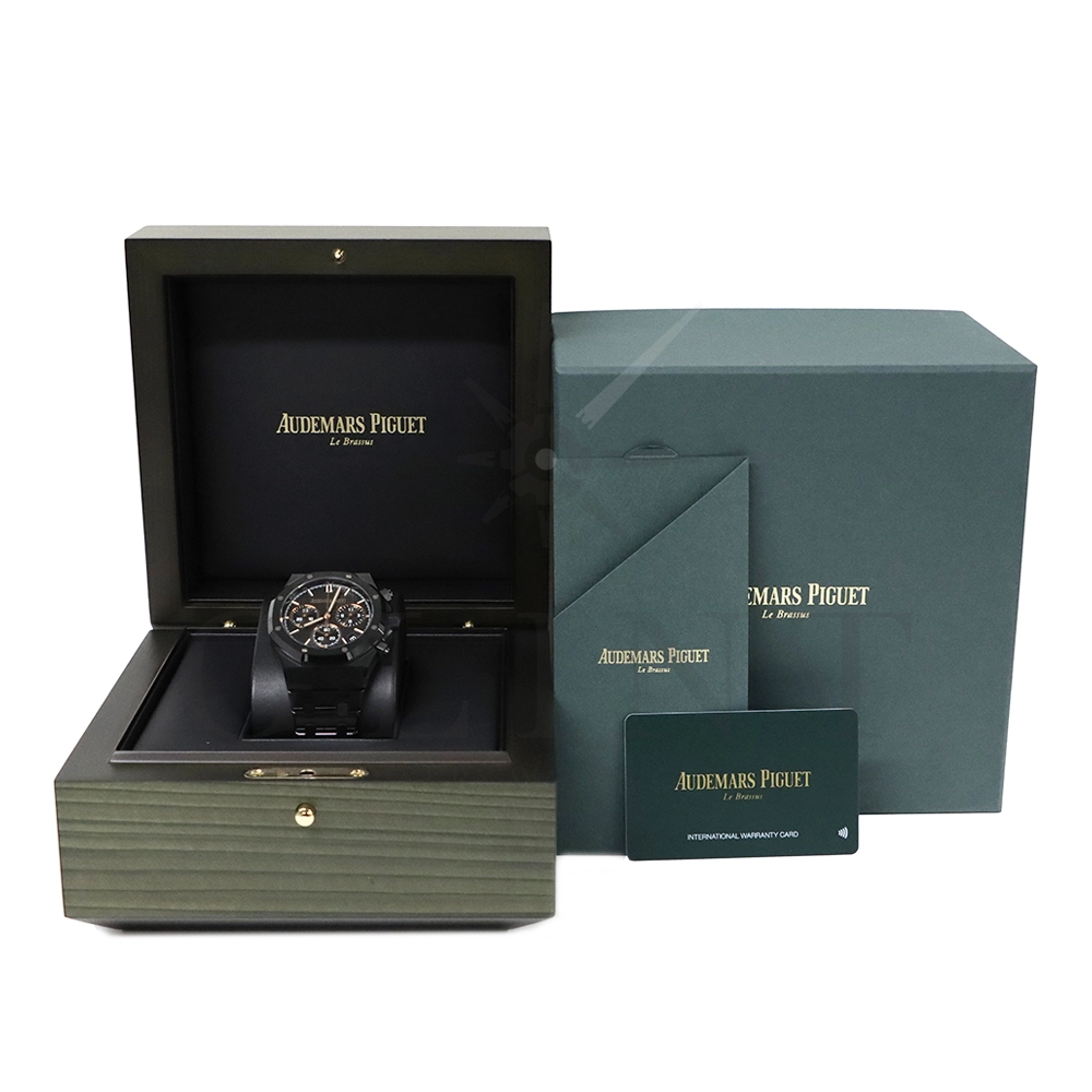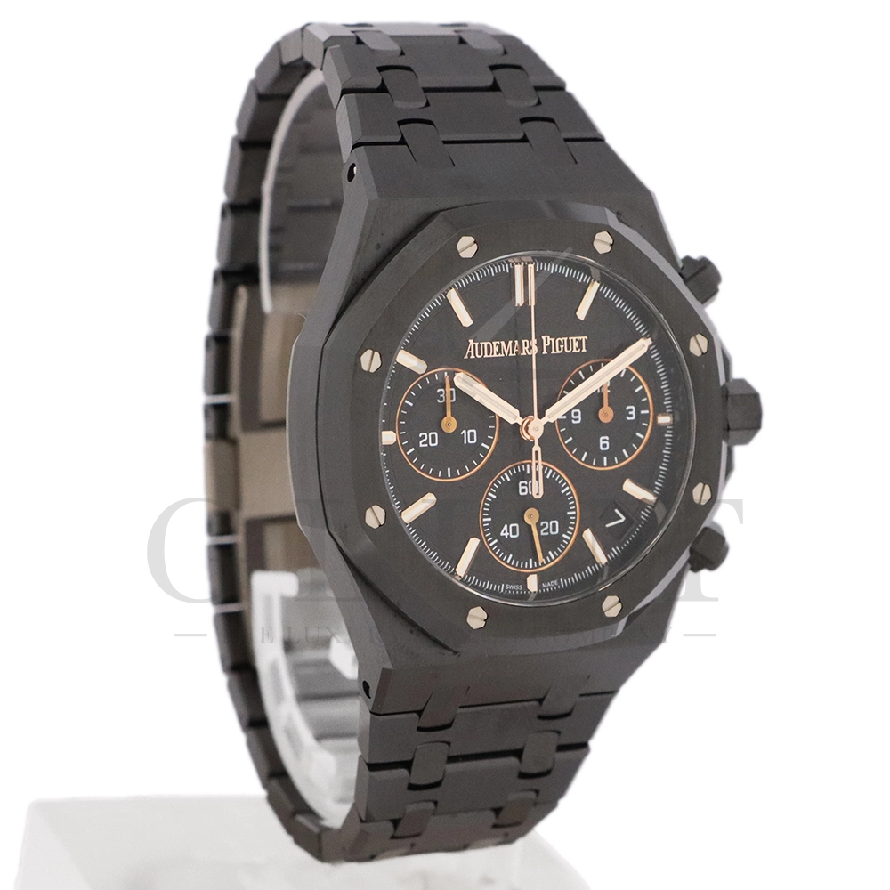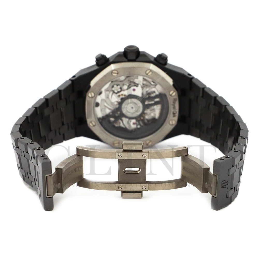 こちらは2022年に発表されたロイヤルオーク クロノグラフです。41mmのロイヤルオーク クロノグラフではオーデマピゲ初となるブラックセラミックモデル。プレポリッシュ、プレサテンブラッシュで準備された一つ一つのセラミックの部品を、手作業でポリッシュ面取りやオーデマピゲのトレードマークでもあるサテンブラッシュとポリッシュを組み合わせながら仕上げ、非常に高い耐久性と耐傷性、美しい光の反射を実現します。ブラックダイヤルにはピンクゴールドをアクセントとして組み合わせ、緻密な深みを放つブラックセラミックとのバイカラーが洗練されたコントラストを強調。ムーブメントには、CODE.11.59でも使用されている最新世代のCal.4401を搭載しており、約70時間のパワーリザーブやフライバッククロノグラフを備え、高い実用性を誇ります。シースルーバックからはコート・ド・ジュネーブなど美しい仕上げが施されたムーブメントやブラックカラーに統一されたローターを堪能いただけます。伝統の技術をコンテンポラリーなデザインで包んだタイムレスなエレガンスさを感じられる至極の一本です。