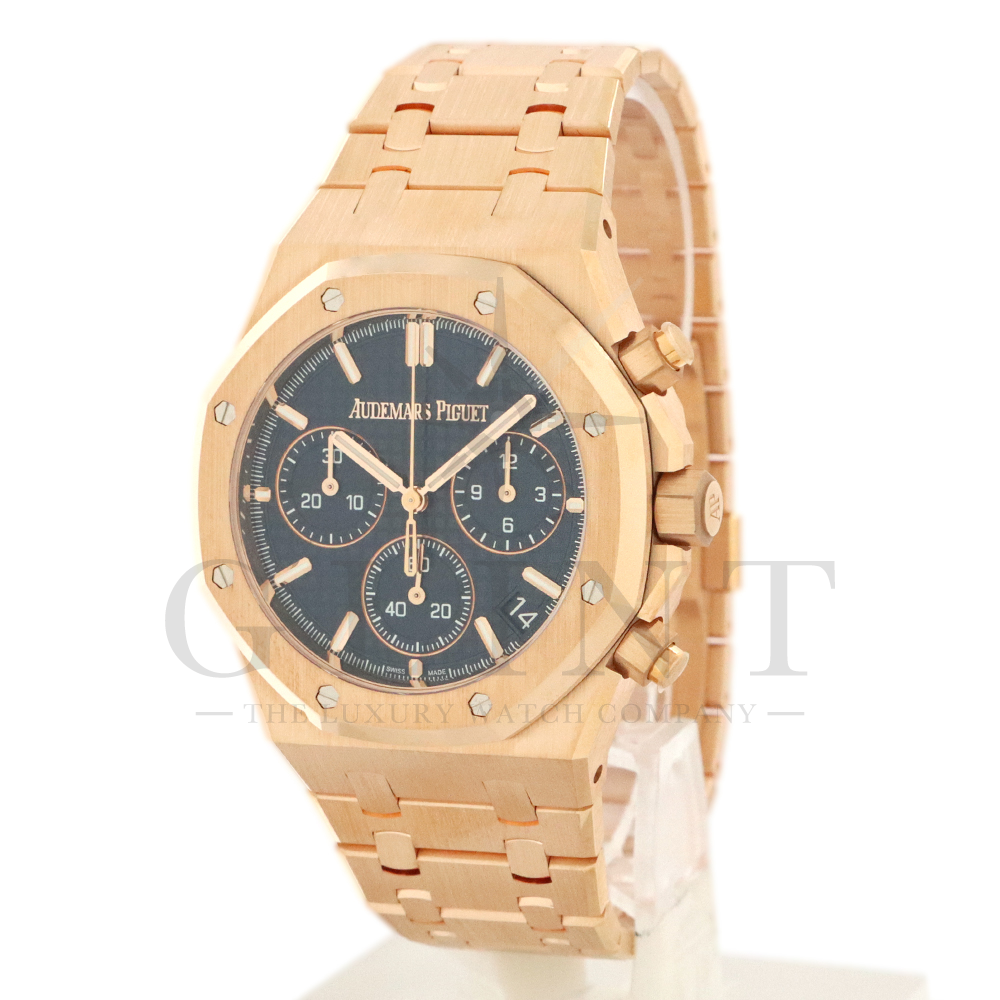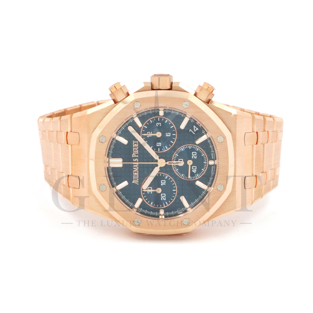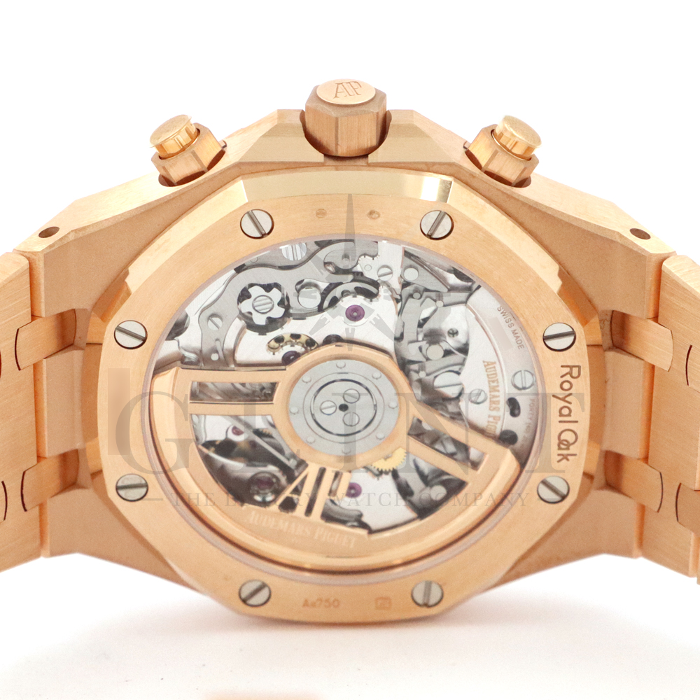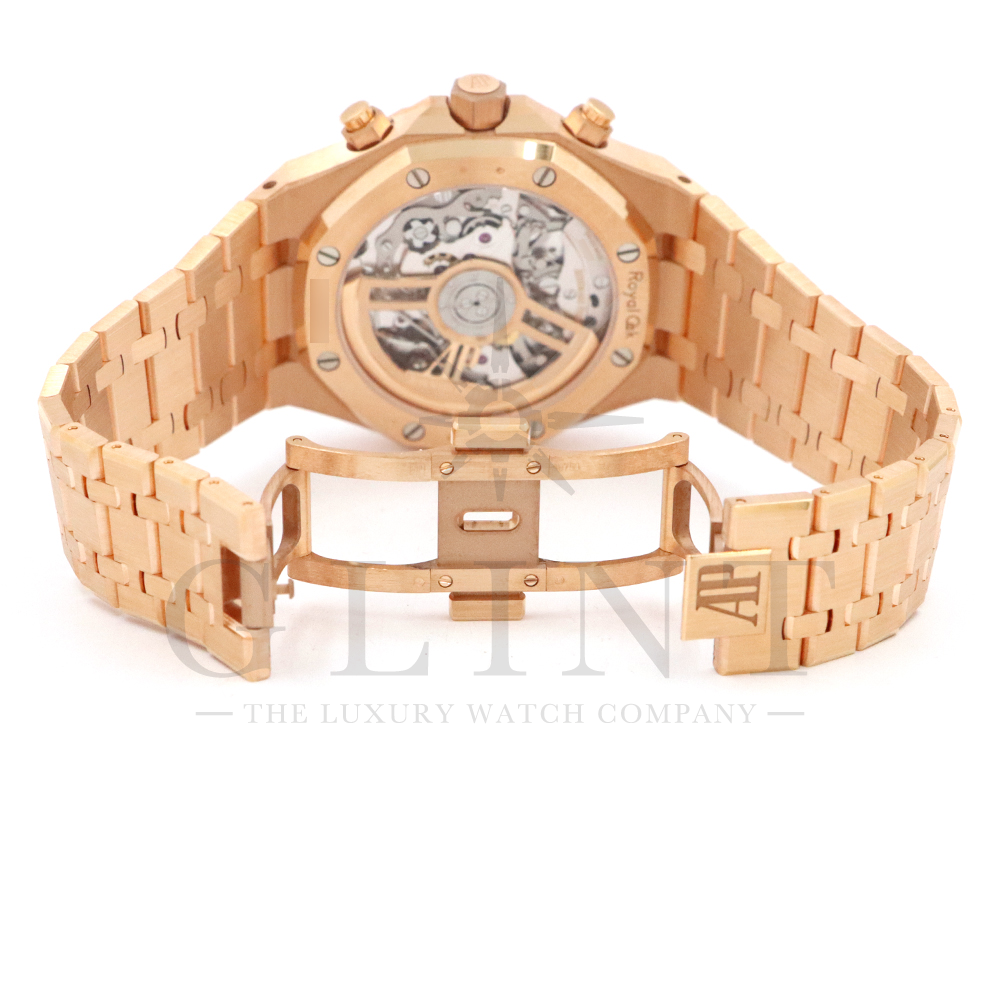文字盤:「グランドタペストリー」模様の「ナイトブルー、クラウド50」ダイヤル、「ナイトブルー、クラウド50」カウンター、蓄光処理を施したピンクゴールドのアプライドアワーマーカーとロイヤルオーク針
