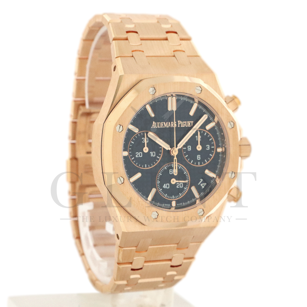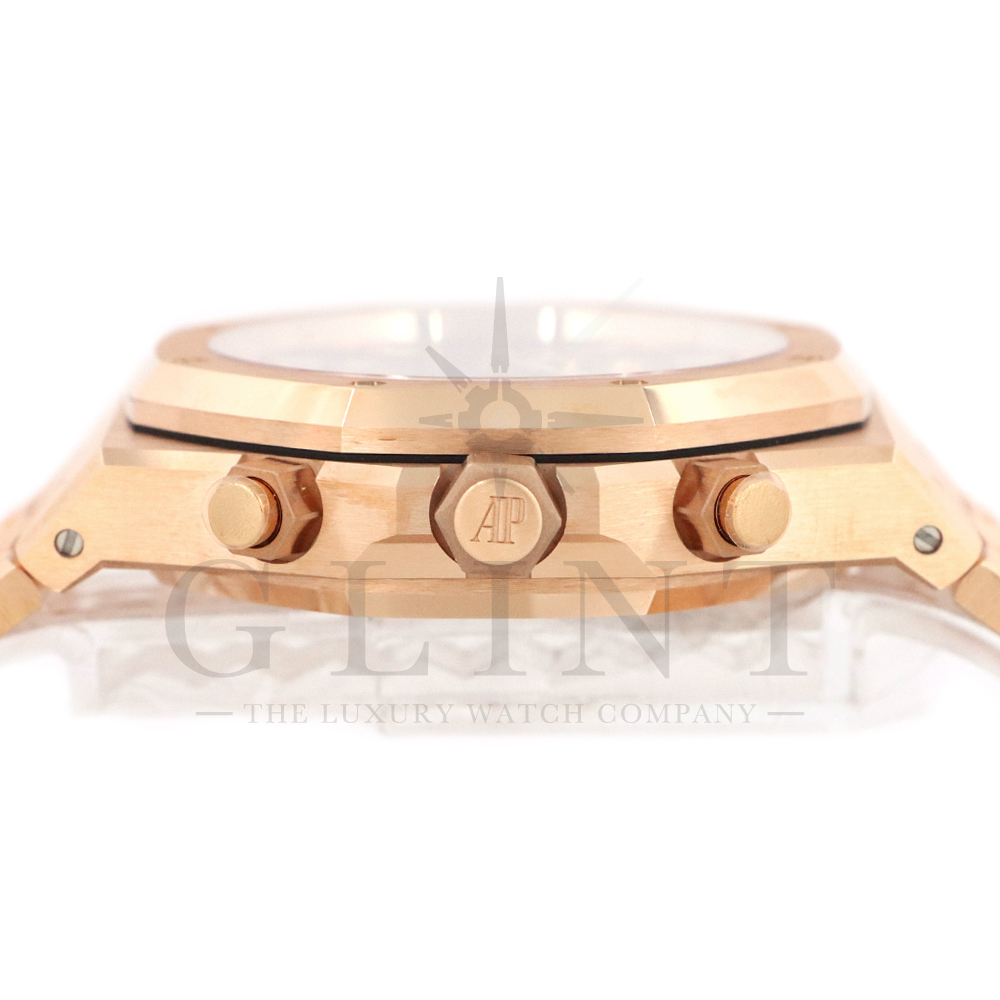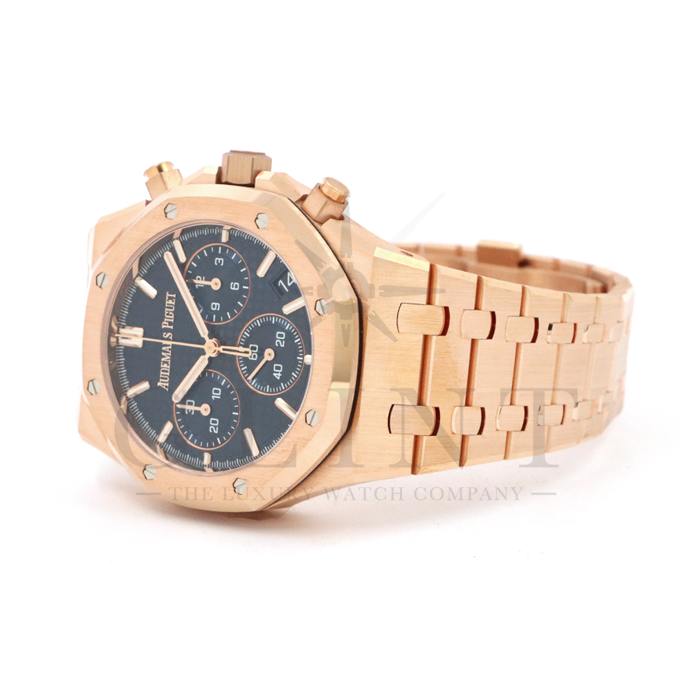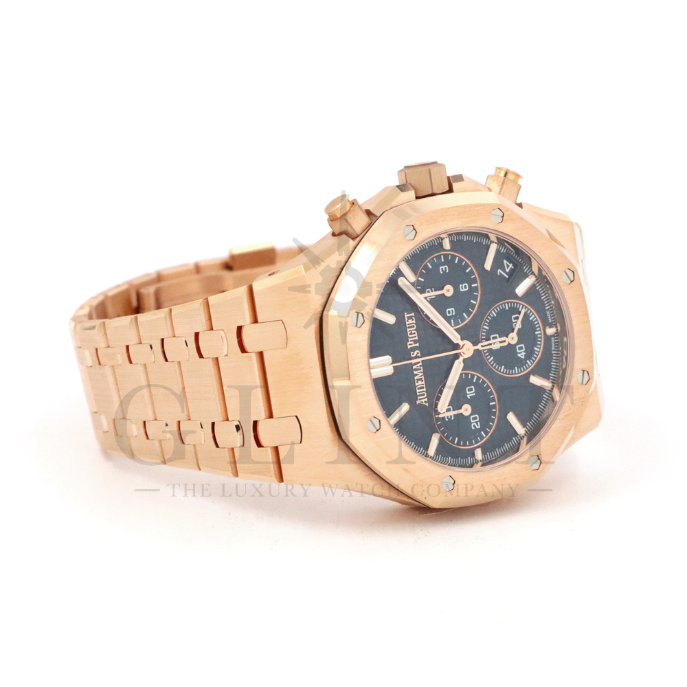 文字盤:「グランドタペストリー」模様の「ナイトブルー、クラウド50」ダイヤル、「ナイトブルー、クラウド50」カウンター、蓄光処理を施したピンクゴールドのアプライドアワーマーカーとロイヤルオーク針