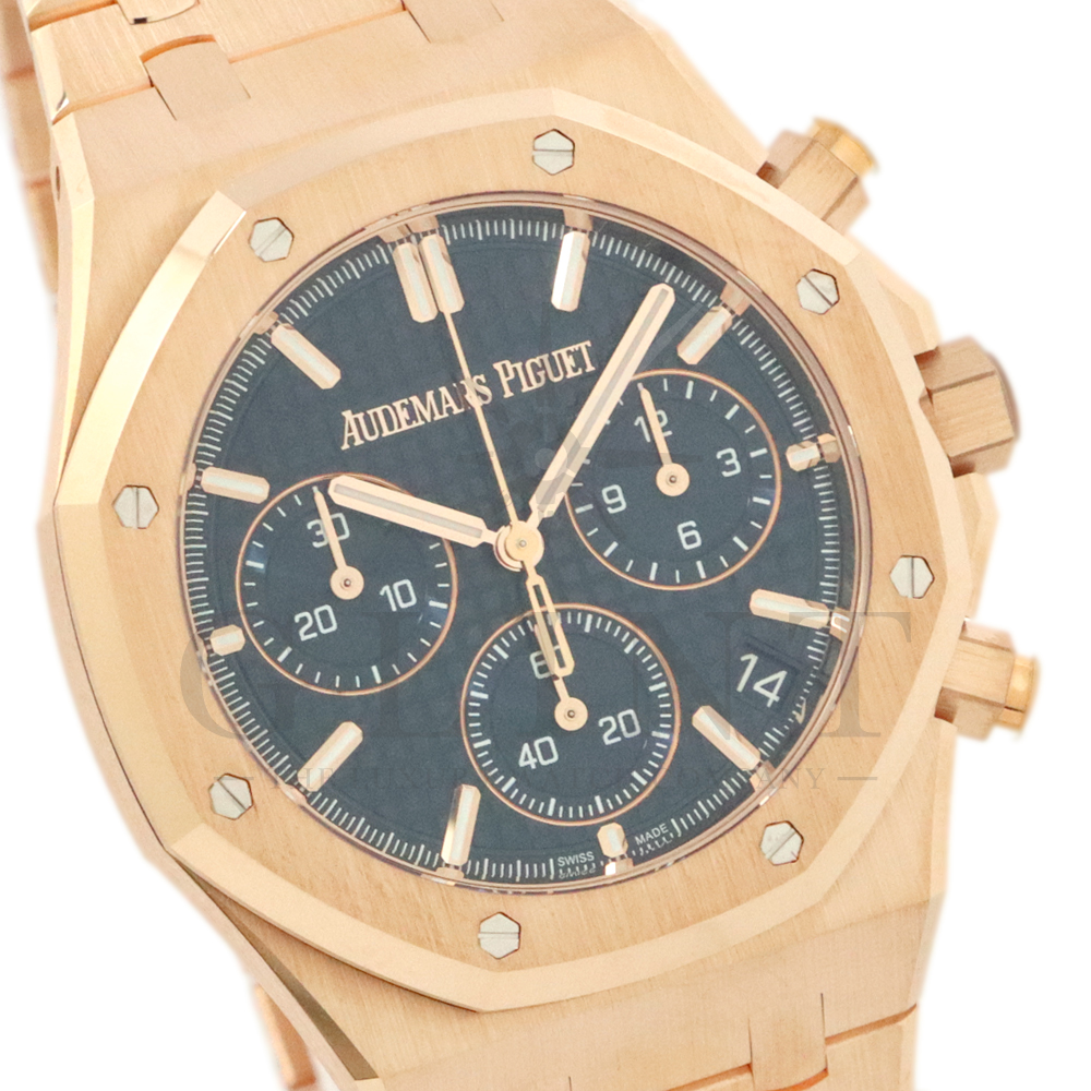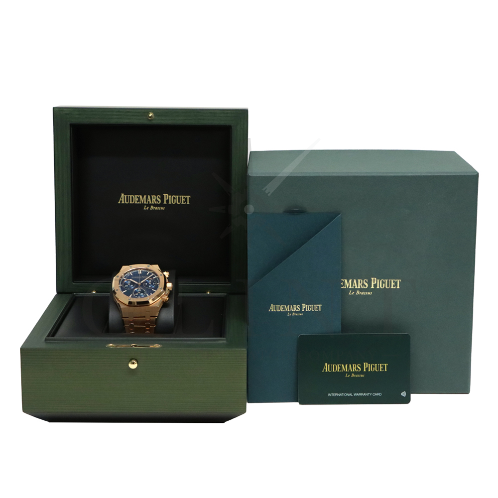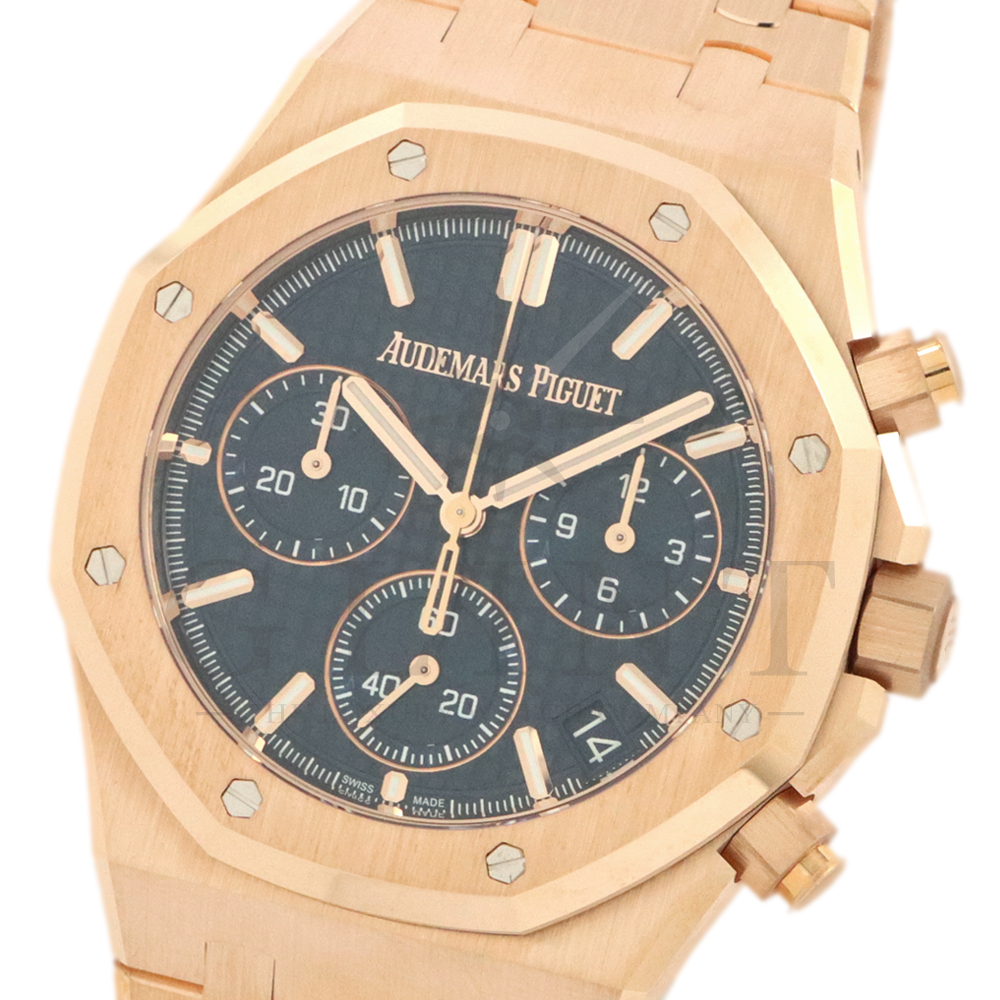 こちらはロイヤル オーク クロノグラフ 26240OR.OO.1320OR.05です。ラグジュアリースポーツウォッチの頂点として君臨するロイヤル オーク。本モデルは、18Kピンクゴールドケースと、ブランドを象徴する“ナイトブルー、クラウド50”ダイヤルを組み合わせた、極めて完成度の高いモデルです。ケース径41mmの18Kピンクゴールドケースは、八角形ベゼルとビスを備えたロイヤルオークならではの造形美を継承。サテン仕上げとポリッシュ仕上げを巧みに使い分けることで、ゴールド素材でありながらスポーティかつ洗練された表情を実現しています。ダイヤルには、グランド・タペストリーパターンが施されたナイトブルー文字盤を採用。深みのあるブルーとピンクゴールドケースとのコントラストが、圧倒的な存在感と気品を演出します。クロノグラフカウンターは視認性とデザイン性を両立し、ピンクゴールド製のアプライドインデックスとロイヤル オーク針が上質な輝きを添えてくれるでしょう。ムーブメントには、自社製自動巻きクロノグラフムーブメント キャリバー4401を搭載。コラムホイールとフライバック機能を備え、操作性と精度を高次元で実現しています。シースルーバックからは、最新世代ムーブメントならではの美しい仕上げとダイナミックな動きを堪能できるでしょう。ケースと一体化した18Kピンクゴールド製ブレスレットは、卓越した装着感と造形美を兼ね備え、手元に確かな重みと満足感をもたらします。スポーティでありながらラグジュアリーウォッチとしての品格を失わない点も、本モデルの大きな魅力。ロイヤル オークのアイコニックなデザインに、最新ムーブメントと貴金属の贅沢さを融合させた本モデルは、オーデマ ピゲの技術力と美意識を体現する、まさに現代を代表するクロノグラフです。