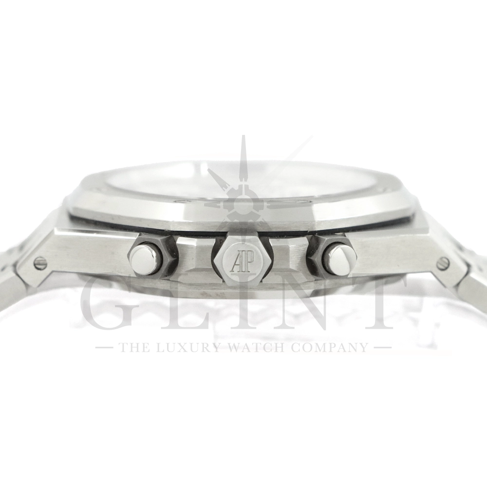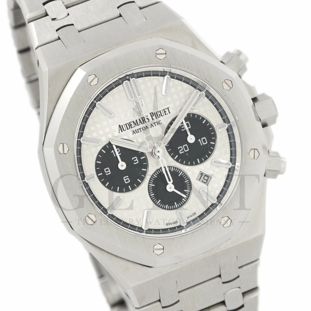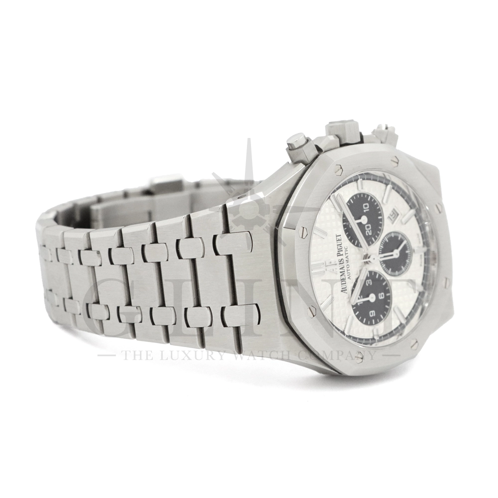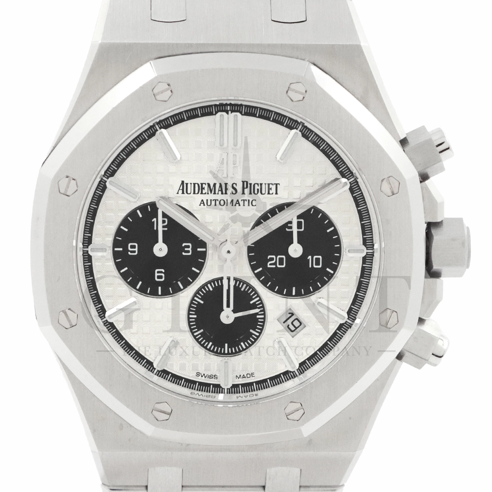 こちらはロイヤル オーク クロノグラフです。ケース径41mmのステンレススティールケースは、サテン仕上げとポリッシュ仕上げを巧みに使い分けた八角形ベゼルとビスにより、力強さと洗練を両立。人間工学に基づいたケースデザインは、確かな存在感を放ちながらも快適な装着感を実現しています。ダイヤルには、ロイヤル オークを象徴する「グランド・タペストリー」模様を採用。立体感のあるシルバーダイヤルに、ブラックのカウンターが絶妙なバランスで配置され、高い視認性とスポーティな表情を兼ね備えています。ホワイトゴールド製のアプライドインデックスとロイヤル オーク針が、上質な輝きを添えるでしょう。ムーブメントには自動巻きクロノグラフムーブメント キャリバー2385を搭載。高い信頼性と安定した精度を誇ります。一体型ステンレススティールブレスレットは、ケースから自然に流れる造形美と優れたフィット感が魅力。スポーツシーンからビジネス、フォーマルまで幅広く対応する万能性を備えています。ロイヤル オークならではのアイコニックなデザインと、クロノグラフの実用性を高次元で融合させた本モデルは、オーデマ ピゲの哲学と卓越した時計製造技術を体現する一本です。