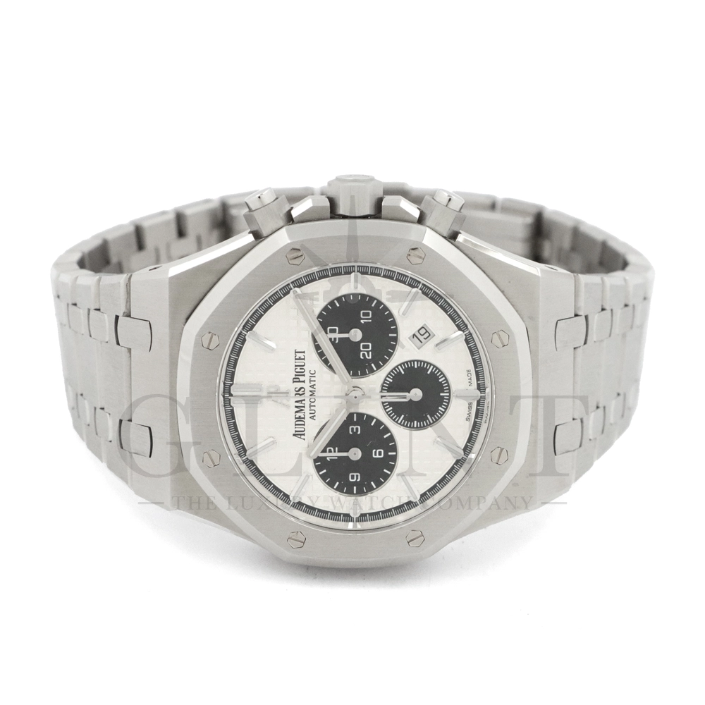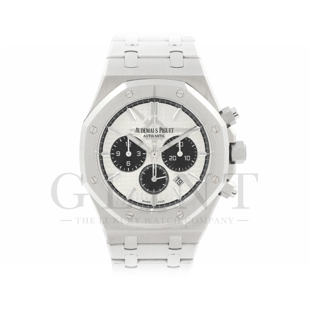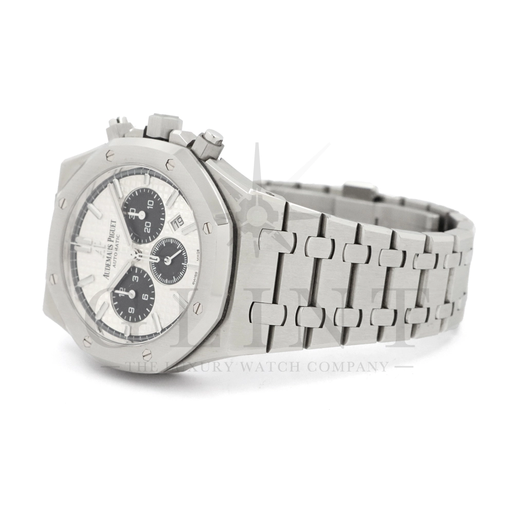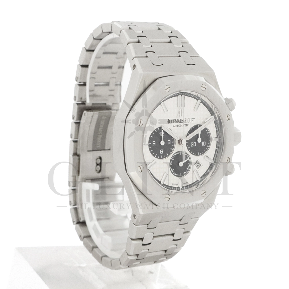 こちらはロイヤル オーク クロノグラフです。ケース径41mmのステンレススティールケースは、サテン仕上げとポリッシュ仕上げを巧みに使い分けた八角形ベゼルとビスにより、力強さと洗練を両立。人間工学に基づいたケースデザインは、確かな存在感を放ちながらも快適な装着感を実現しています。ダイヤルには、ロイヤル オークを象徴する「グランド・タペストリー」模様を採用。立体感のあるシルバーダイヤルに、ブラックのカウンターが絶妙なバランスで配置され、高い視認性とスポーティな表情を兼ね備えています。ホワイトゴールド製のアプライドインデックスとロイヤル オーク針が、上質な輝きを添えるでしょう。ムーブメントには自動巻きクロノグラフムーブメント キャリバー2385を搭載。高い信頼性と安定した精度を誇ります。一体型ステンレススティールブレスレットは、ケースから自然に流れる造形美と優れたフィット感が魅力。スポーツシーンからビジネス、フォーマルまで幅広く対応する万能性を備えています。ロイヤル オークならではのアイコニックなデザインと、クロノグラフの実用性を高次元で融合させた本モデルは、オーデマ ピゲの哲学と卓越した時計製造技術を体現する一本です。