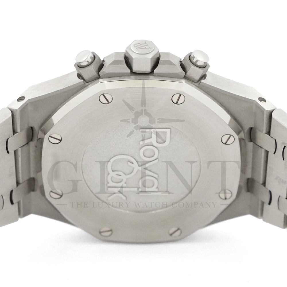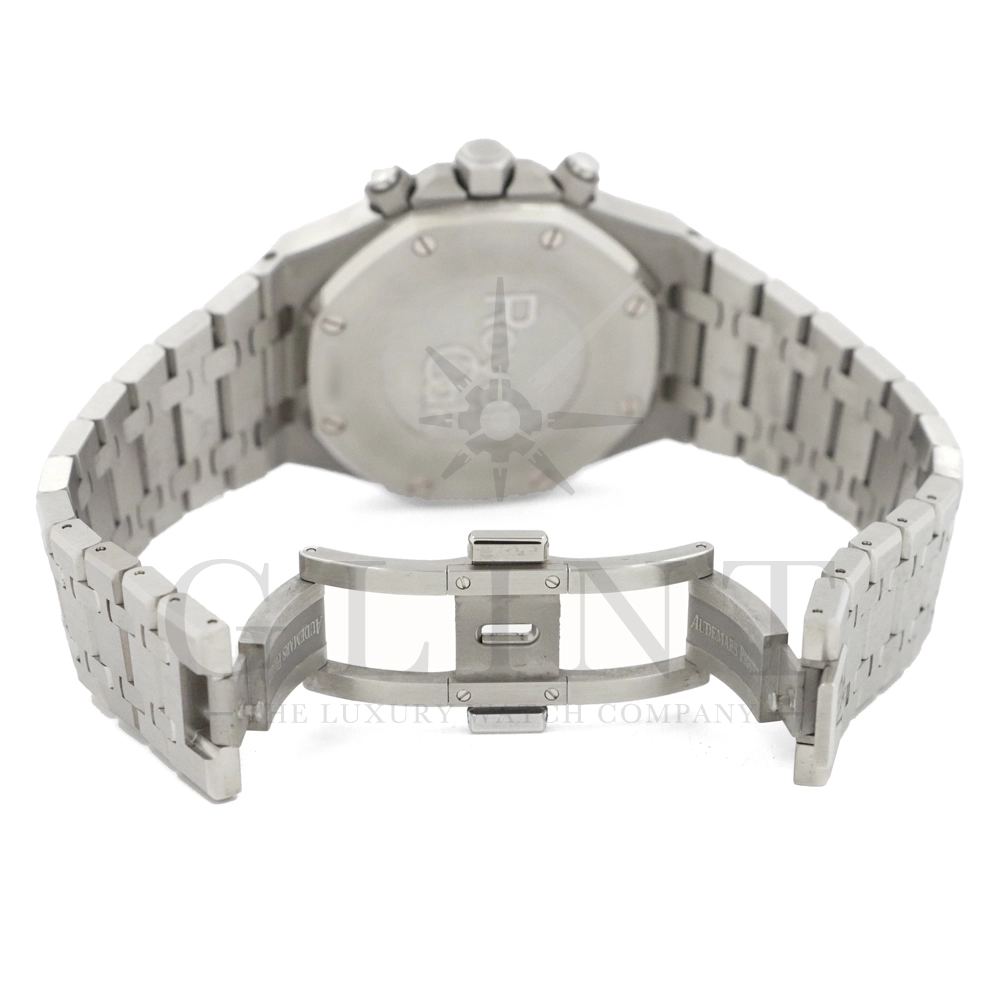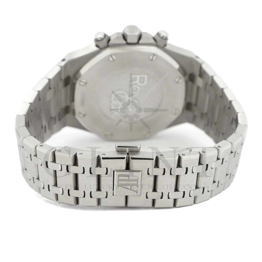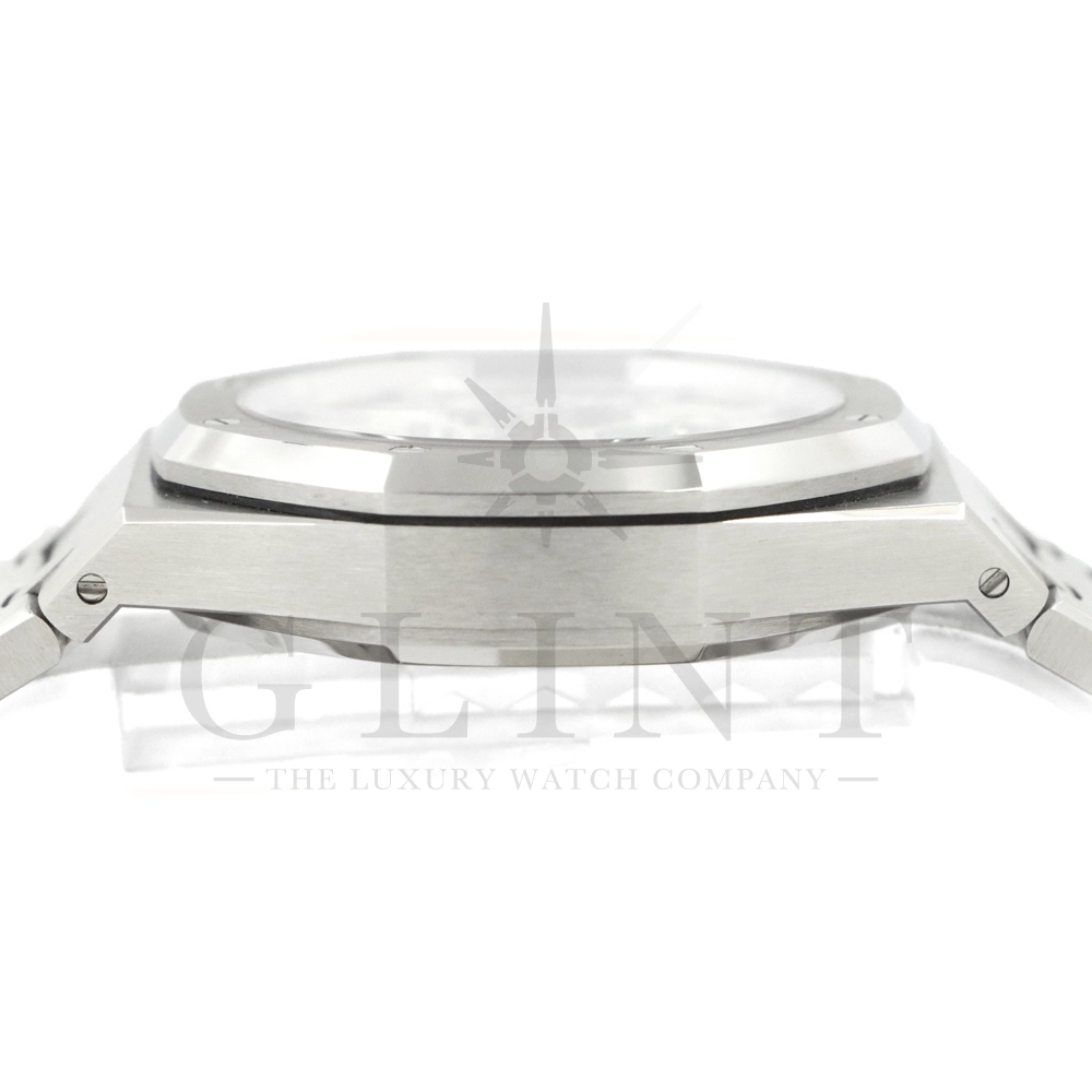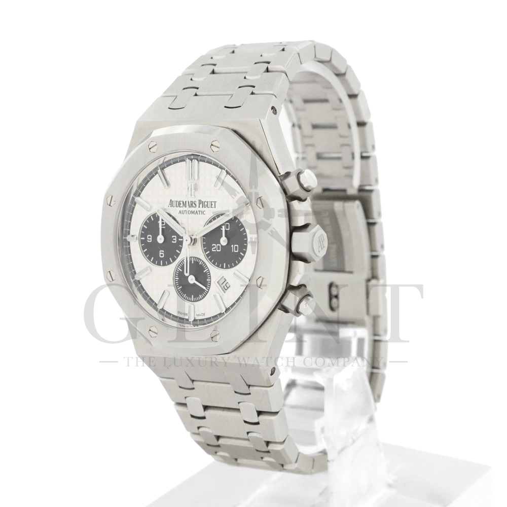 文字盤:「グランド・タペストリー」模様のシルバーダイヤル、ブラックのカウンターとインナーベゼル、ホワイトゴールド製アプライドアワーマーカーと蓄光処理を施したロイヤルオーク針