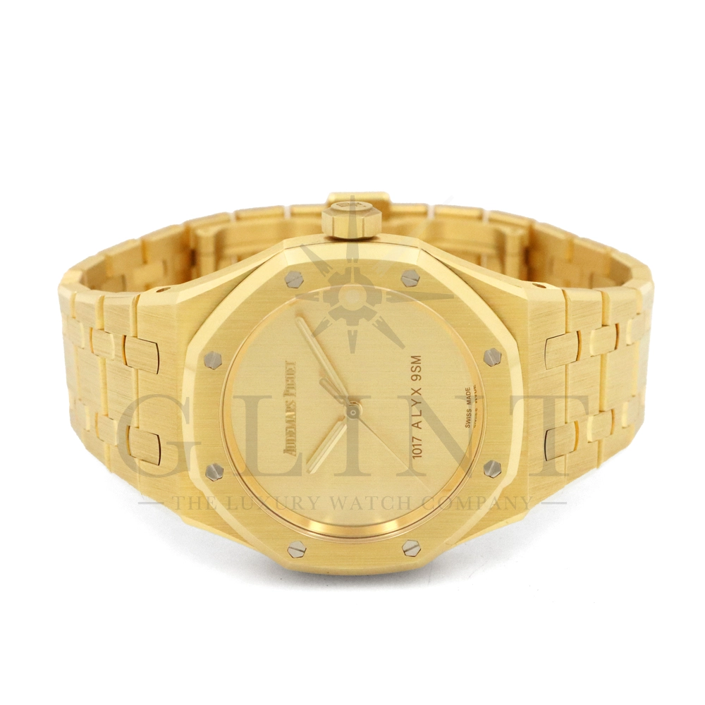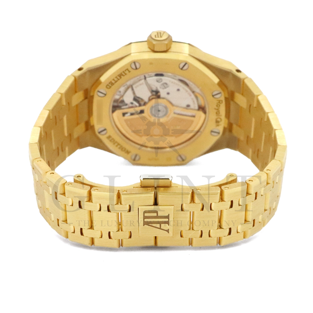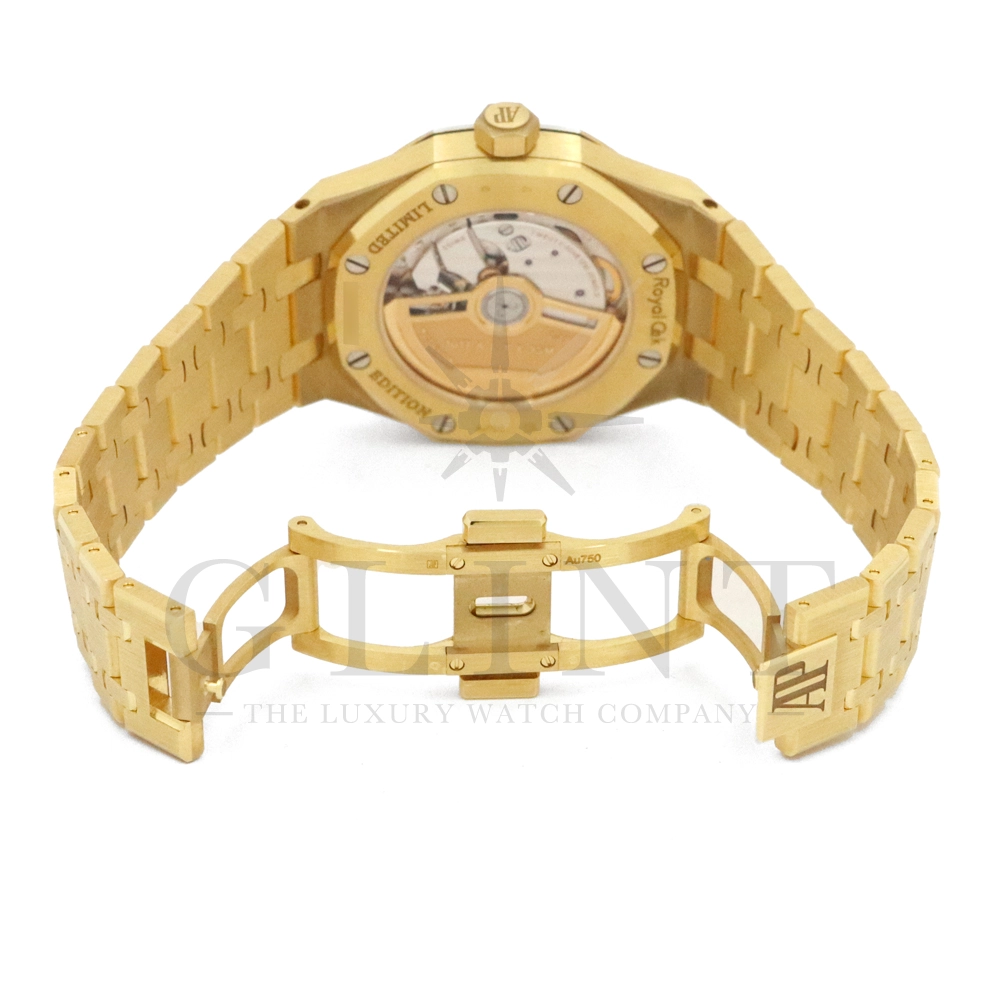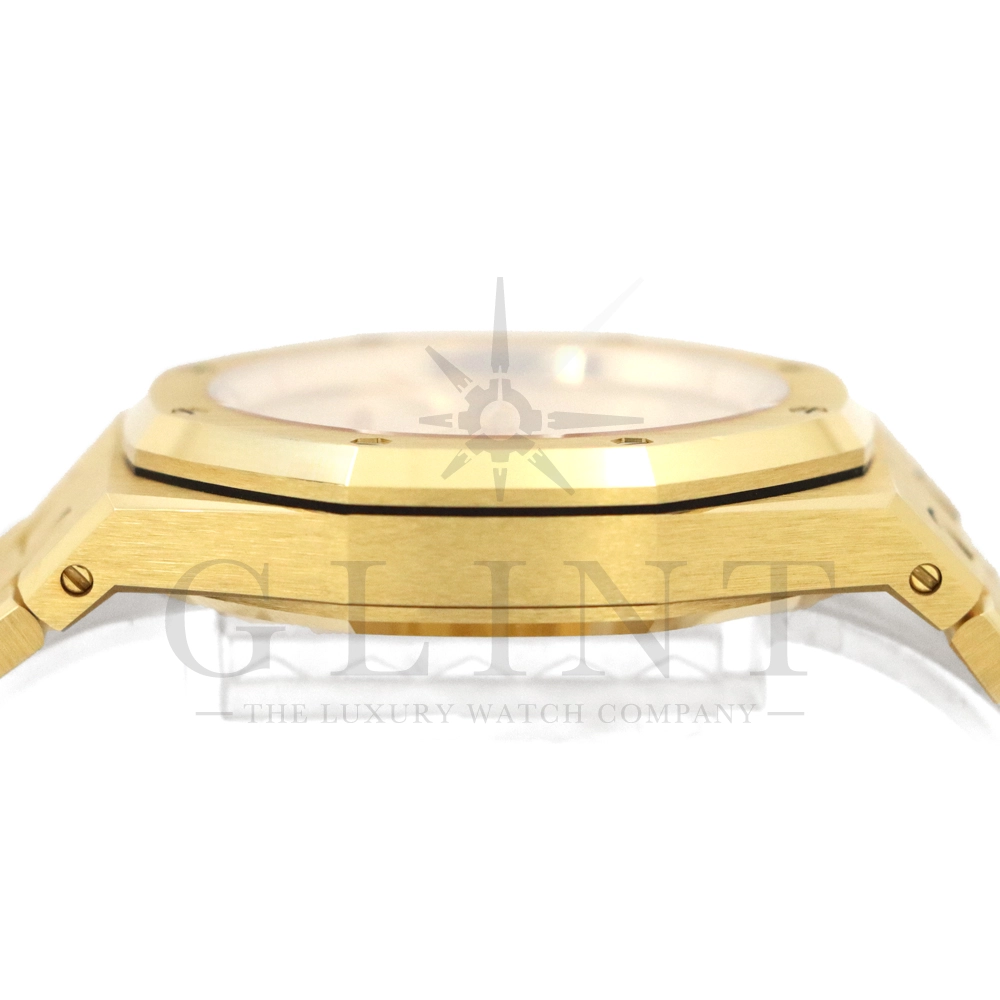 文字盤:縦方向のサテン仕上げを施したイエローゴールドのダイヤル、蓄光処理を施したイエローゴールドのロイヤルオーク針