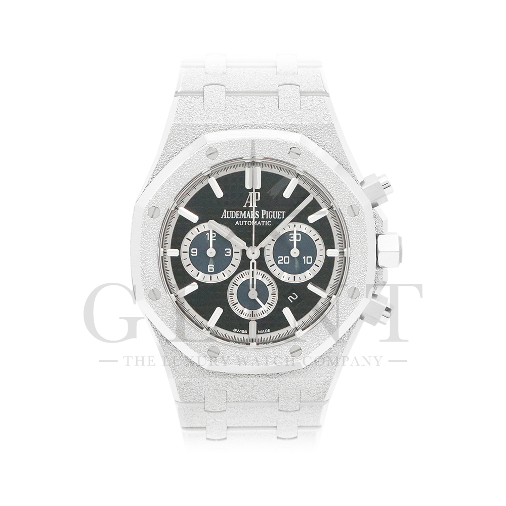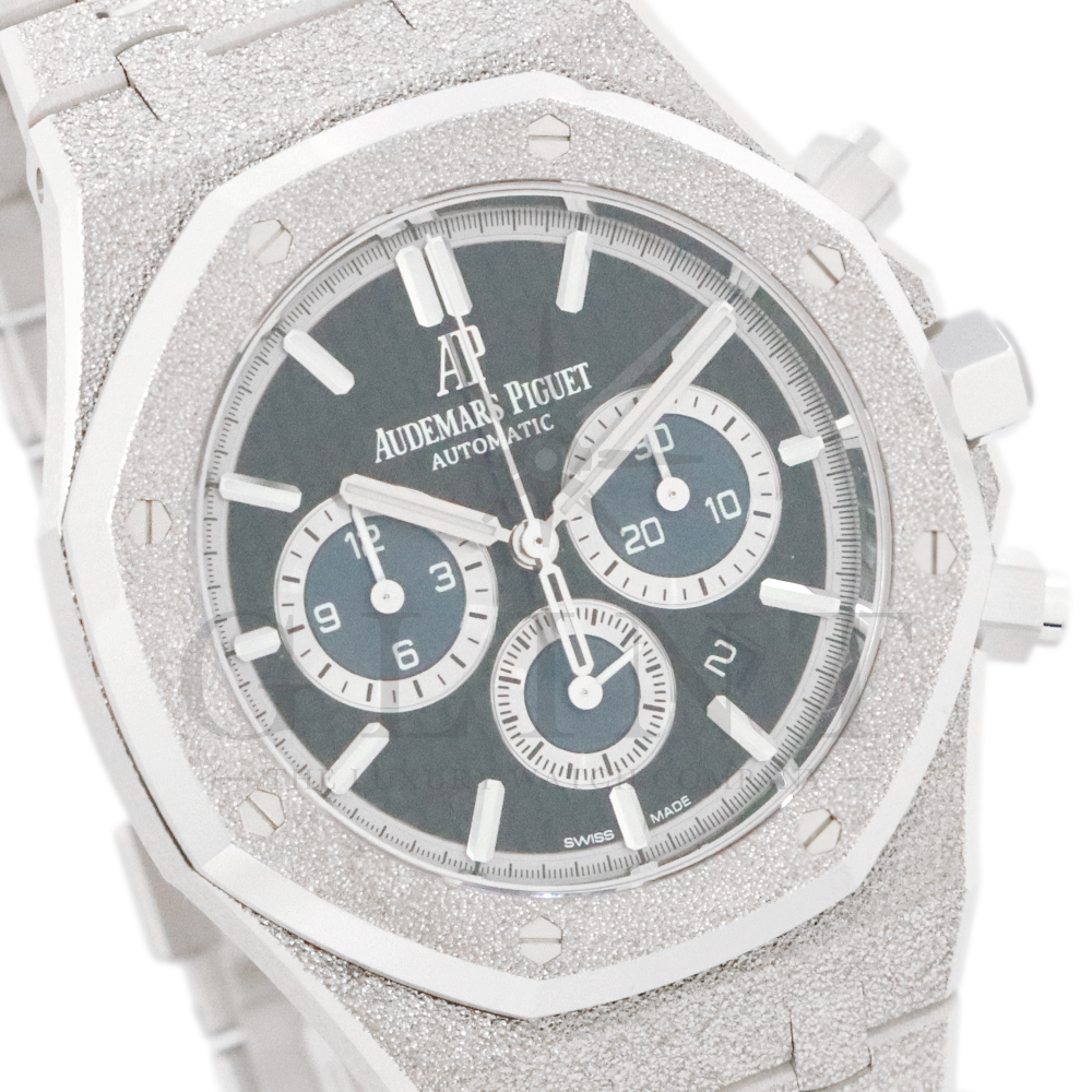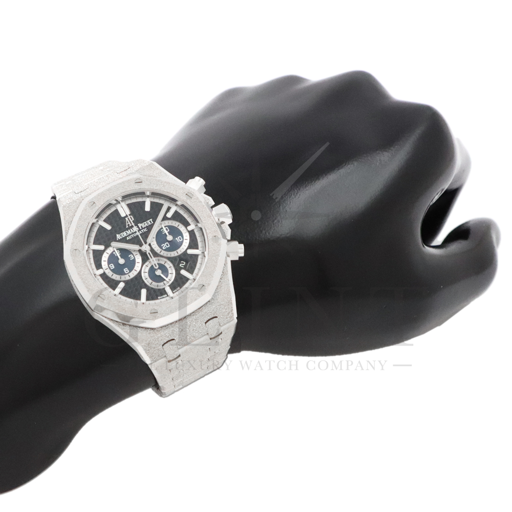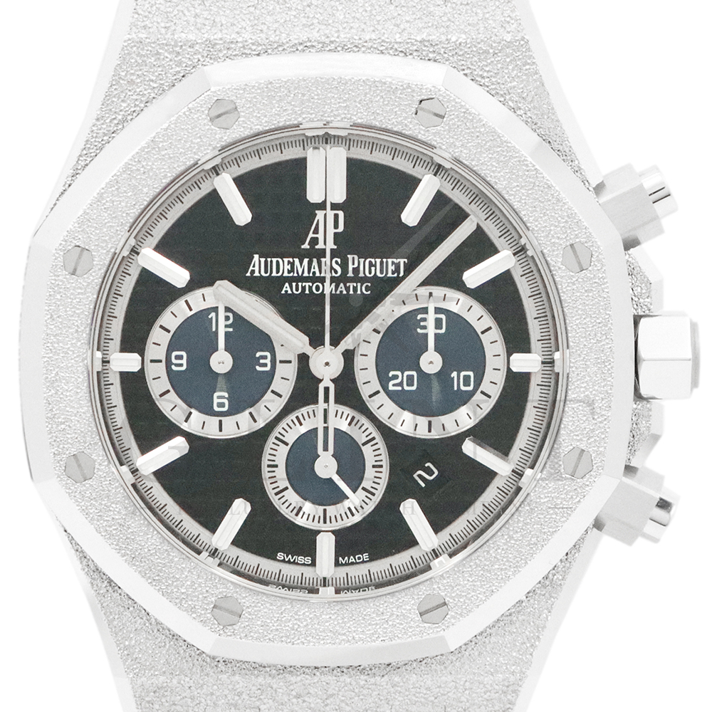 文字盤:「グランドタペストリー」模様のブラックダイヤル、グレーブルーのカウンター、蓄光処理を施した18Kホワイトゴールドのアプライドアワーマーカーとロイヤルオーク針