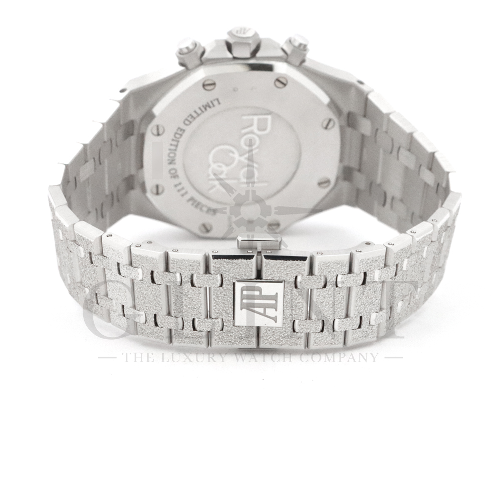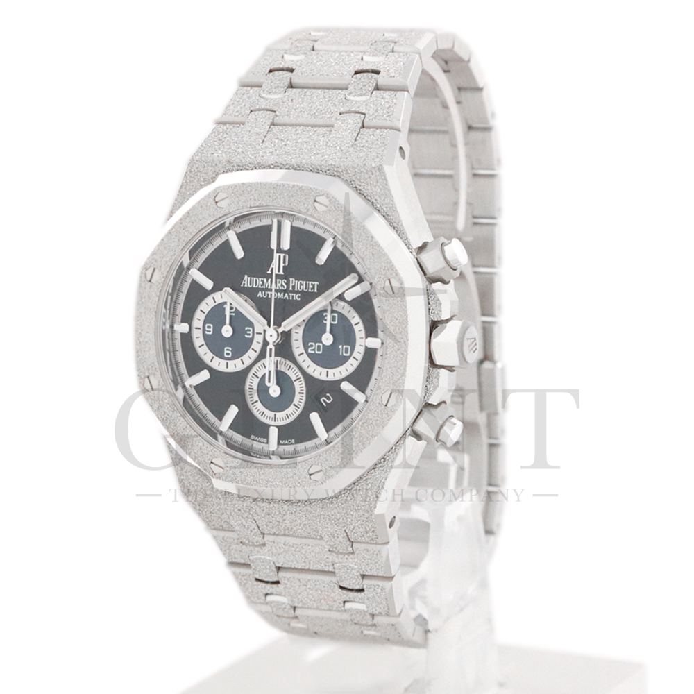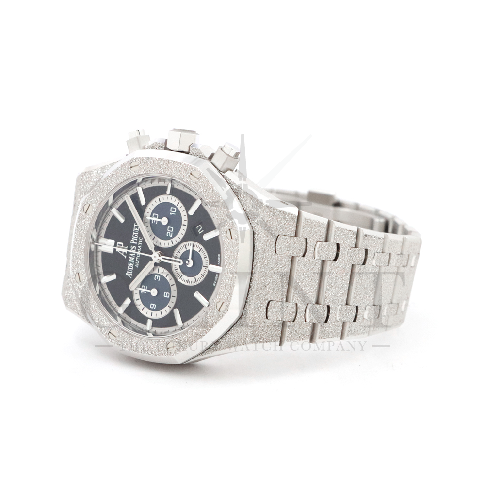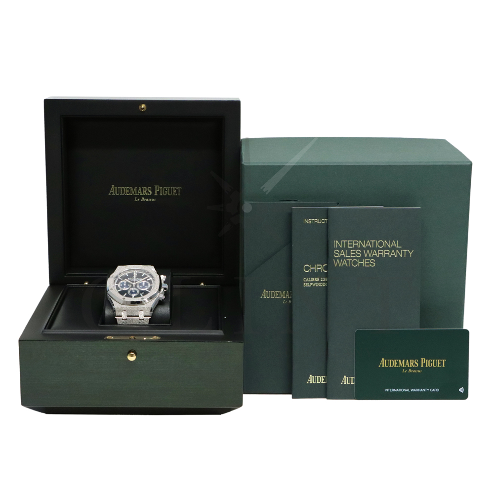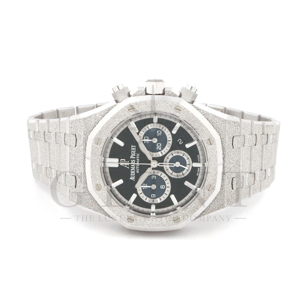 文字盤:「グランドタペストリー」模様のブラックダイヤル、グレーブルーのカウンター、蓄光処理を施した18Kホワイトゴールドのアプライドアワーマーカーとロイヤルオーク針