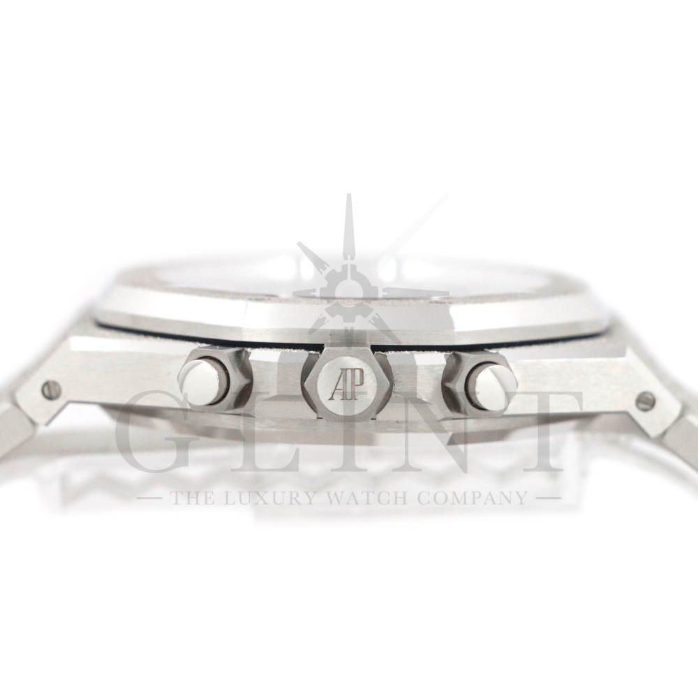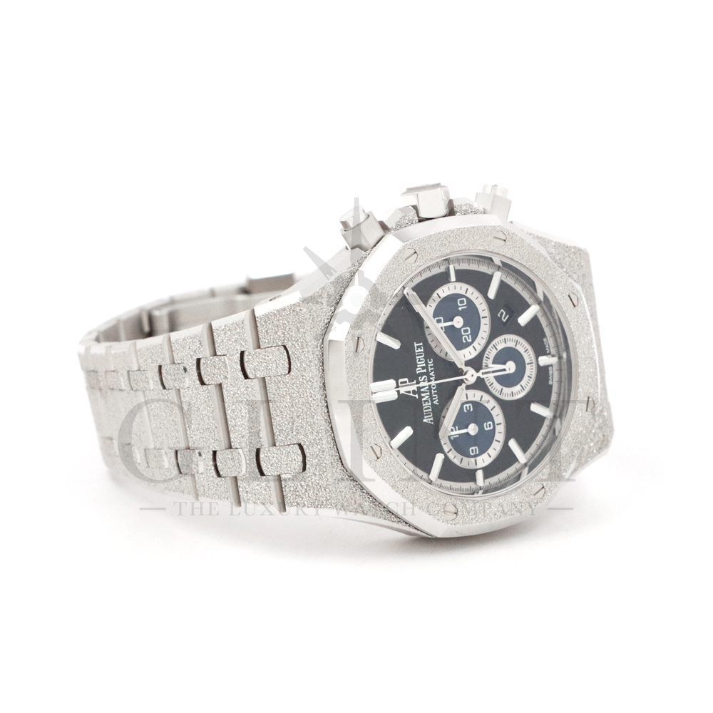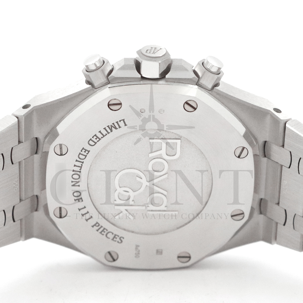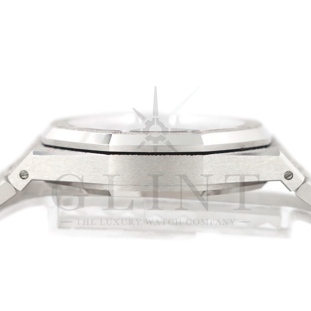文字盤:「グランドタペストリー」模様のブラックダイヤル、グレーブルーのカウンター、蓄光処理を施した18Kホワイトゴールドのアプライドアワーマーカーとロイヤルオーク針
