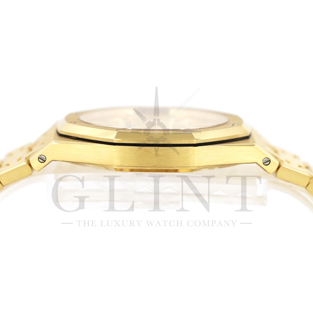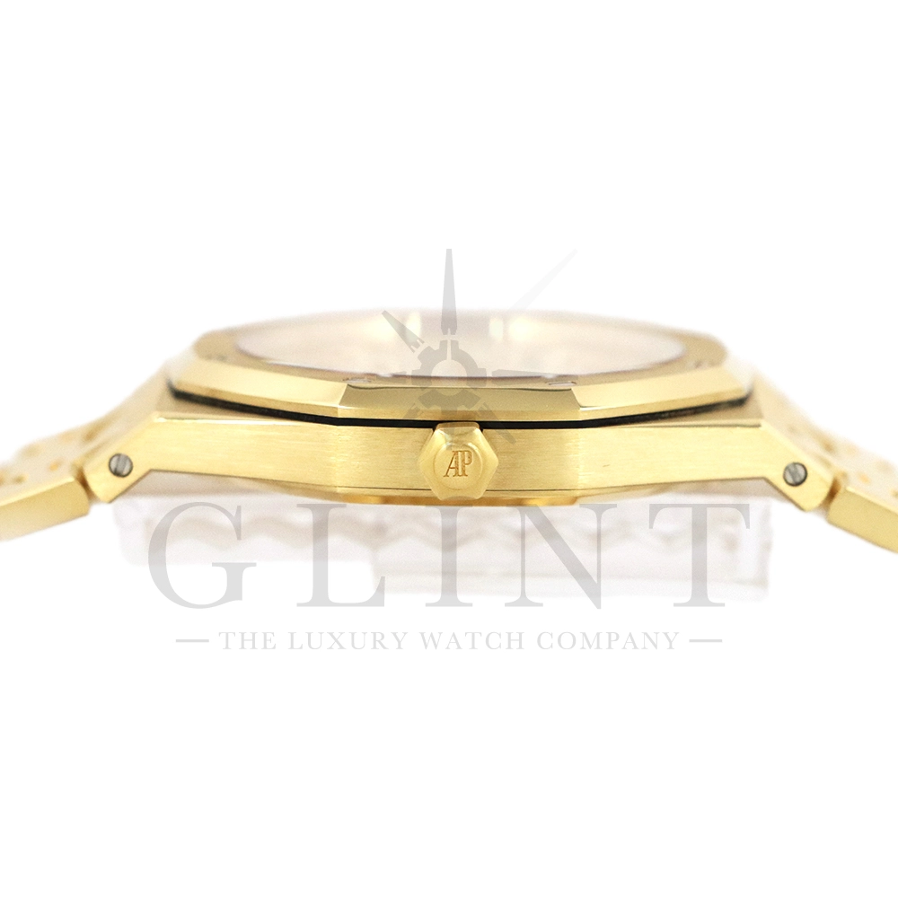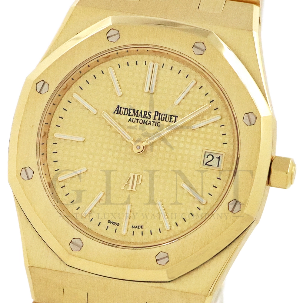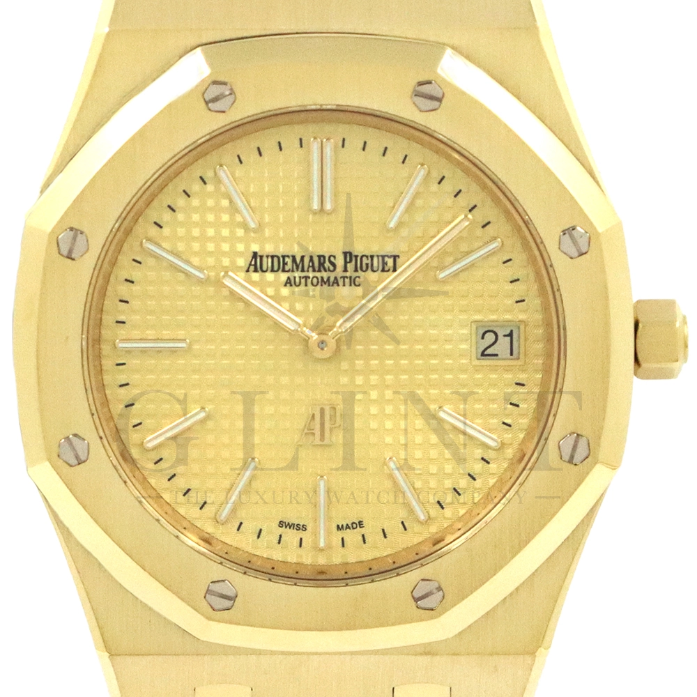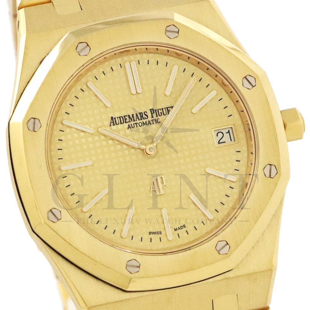 文字盤:「プチ・タペストリー」模様のシャンパンカラーダイヤル、イエローゴールド製アプライドアワーマーカーと蓄光処理を施したロイヤル オーク針