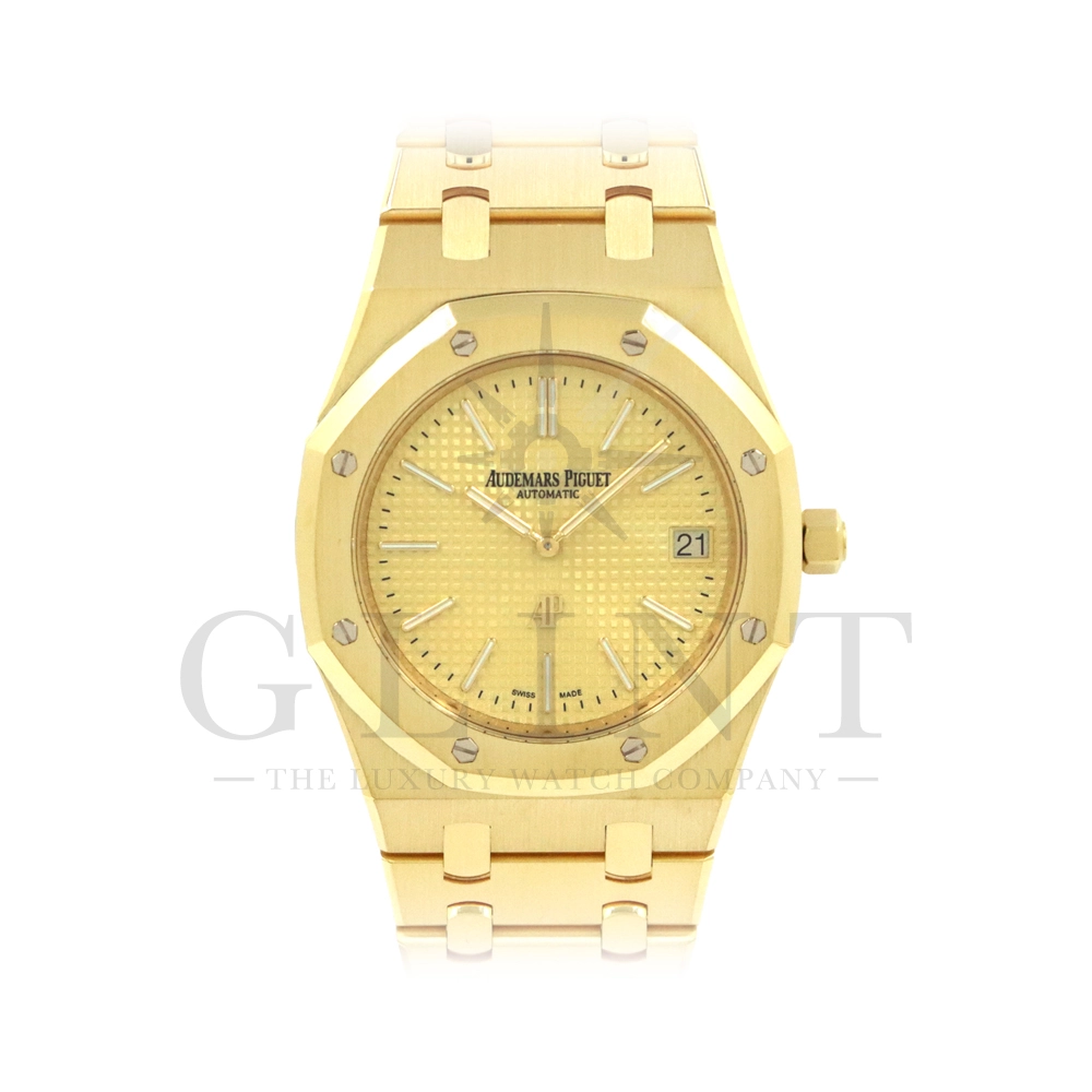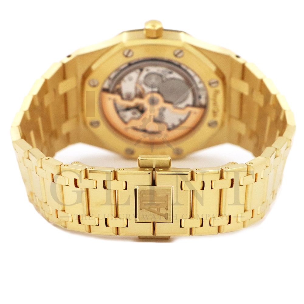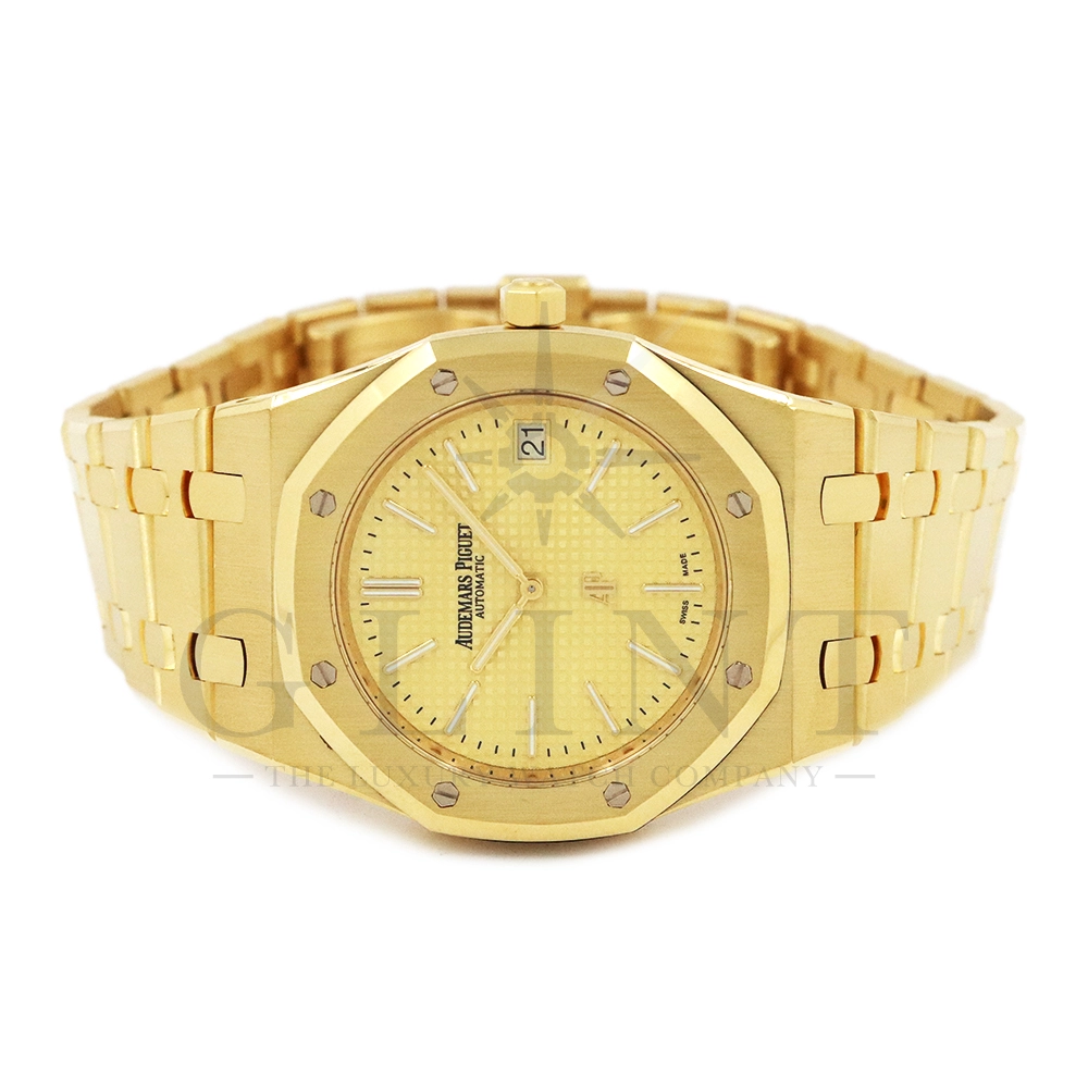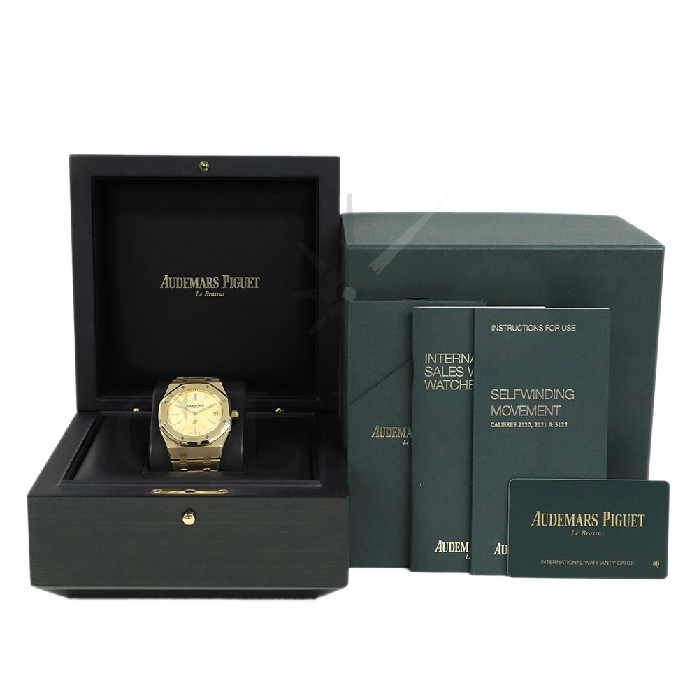 文字盤:「プチ・タペストリー」模様のシャンパンカラーダイヤル、イエローゴールド製アプライドアワーマーカーと蓄光処理を施したロイヤル オーク針