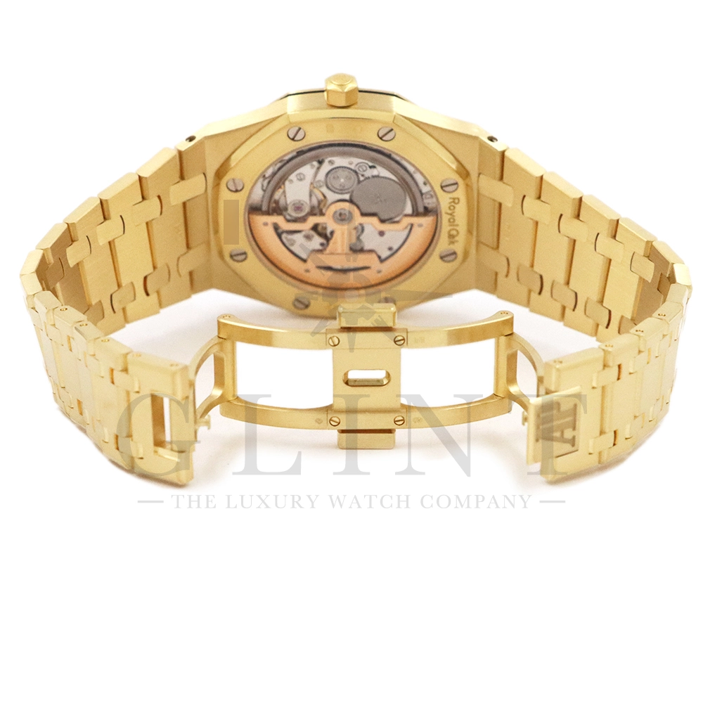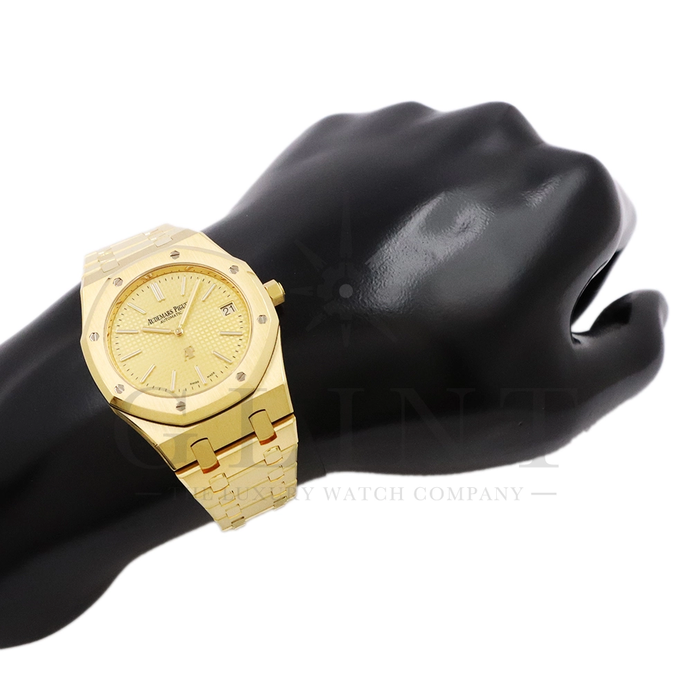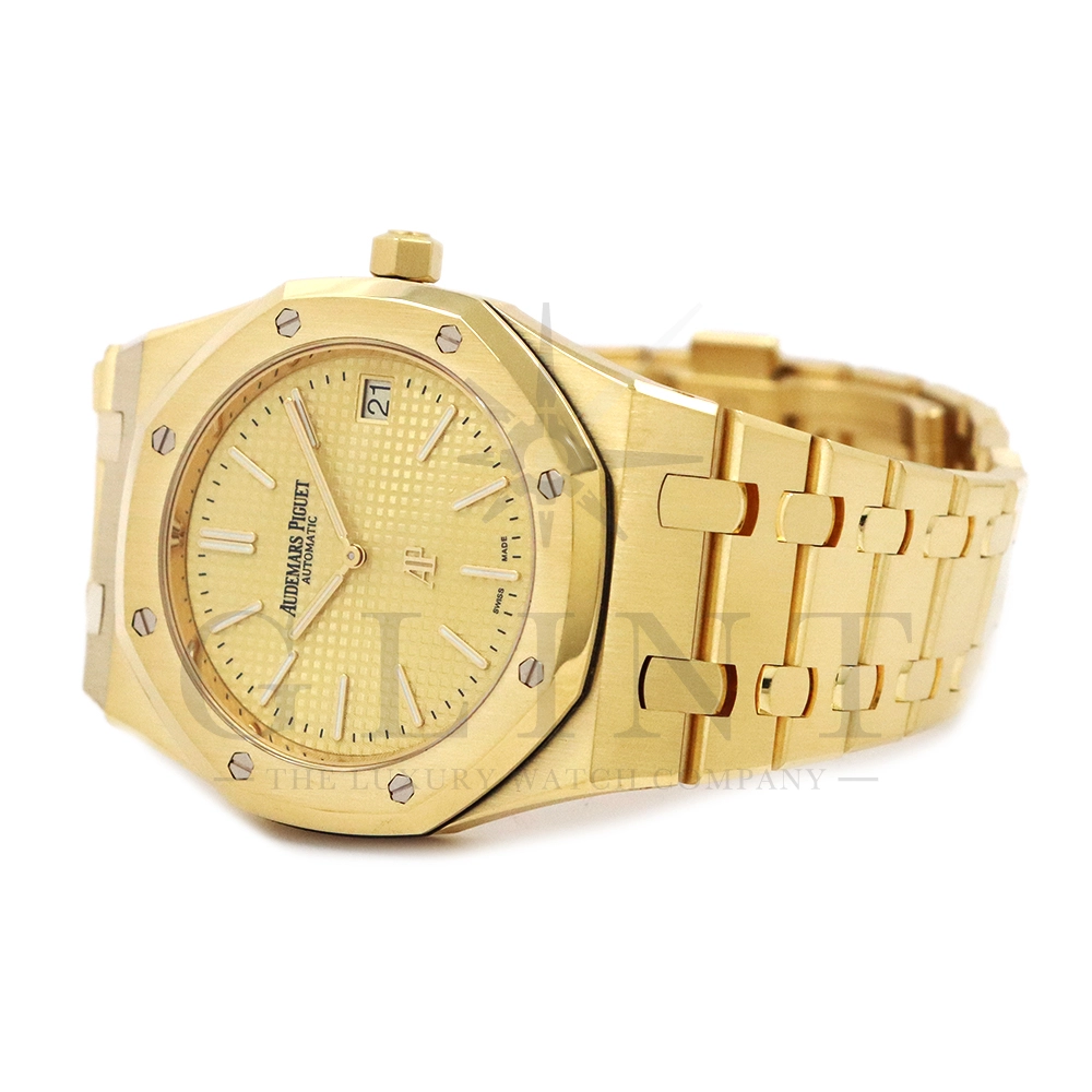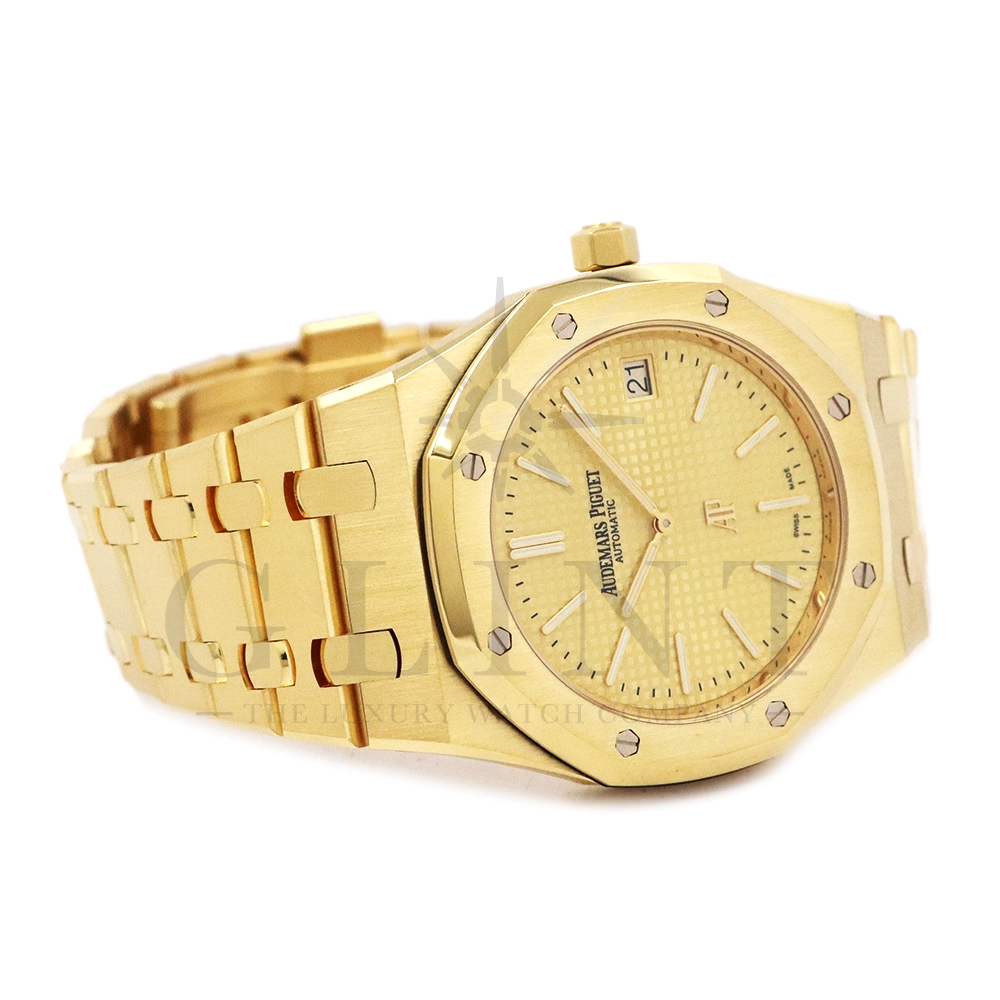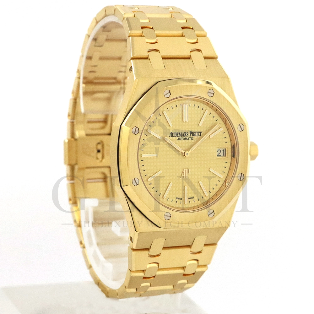 文字盤:「プチ・タペストリー」模様のシャンパンカラーダイヤル、イエローゴールド製アプライドアワーマーカーと蓄光処理を施したロイヤル オーク針