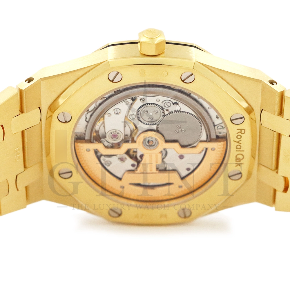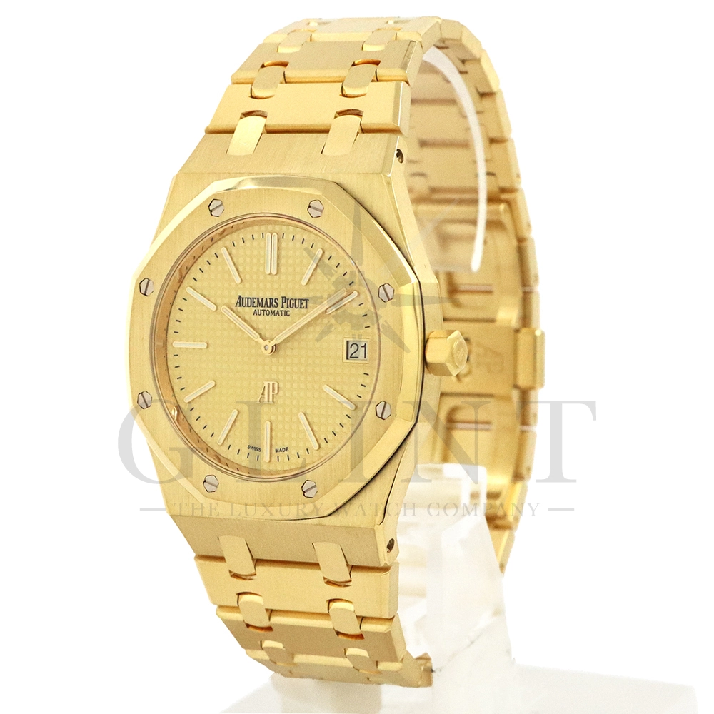 こちらはロイヤル オーク ジャンボ エクストラシンです。「ロイヤルオーク」コレクションの中でも、ひときわ特別な存在感を放つ15202BA.OO.1240BA.02は、ブランドの歴史と美意識を凝縮したラグジュアリーウォッチです。本モデルは、1972年に誕生した初代ロイヤルオークのデザインコードを色濃く受け継ぐ“ジャンボ”エクストラシン仕様であり、ケース径39mmの絶妙なサイズ感とわずか8.1mmの薄型ケースが、腕元に洗練された印象を与えます。ケースおよびブレスレットには18Kイエローゴールドを贅沢に採用し、統一感のあるゴールドトーンが圧倒的な高級感と存在感を演出。ダイヤルには、ロイヤルオークの象徴ともいえる「プチタペストリー」パターンが施され、繊細なテクスチャーが光の角度によって豊かな表情を見せます。さらに、極薄自動巻きムーブメント「キャリバー2121」を搭載し、優れた精度と信頼性を確保すると同時に、シースルーバックからは精巧な仕上げを堪能することができます。八角形ベゼルに並ぶホワイトゴールド製ビスや、一体型ブレスレットの滑らかな装着感など、細部に至るまで卓越した職人技が息づいており、単なる時計を超えた芸術品ともいえる一本です。ラグジュアリーでありながらスポーティな要素も兼ね備えたこのモデルは、フォーマルからカジュアルまで幅広いシーンで活躍し、所有する喜びとともに長く愛用できるタイムピースとして、時計愛好家のみならず本物志向の方々にふさわしい逸品です。