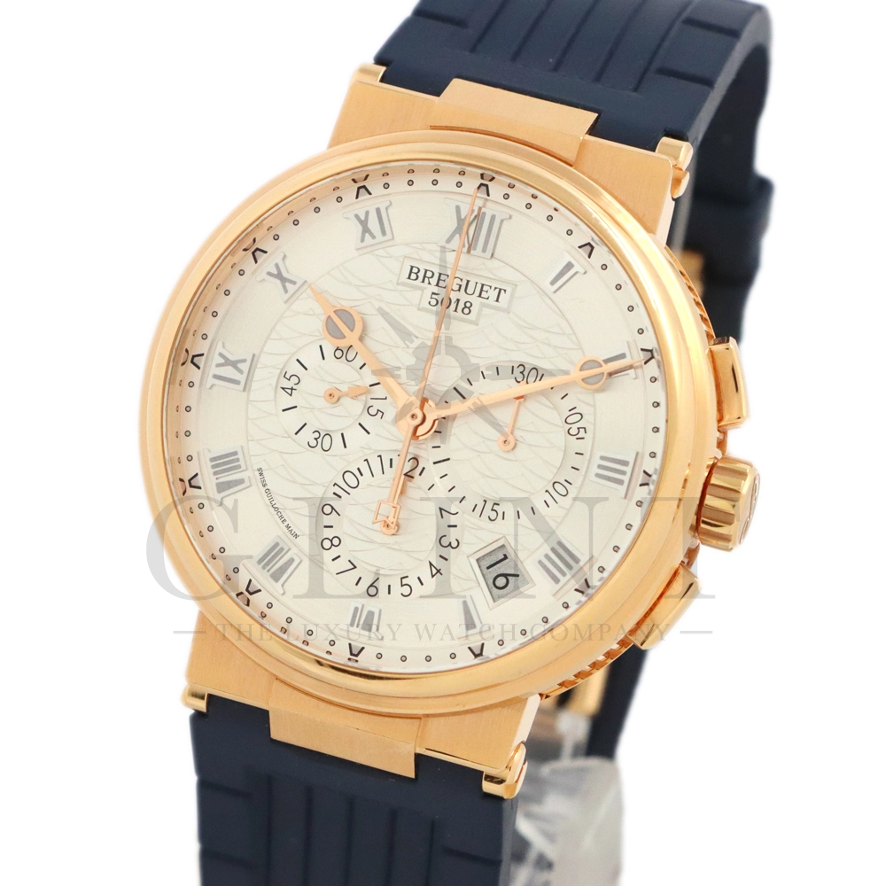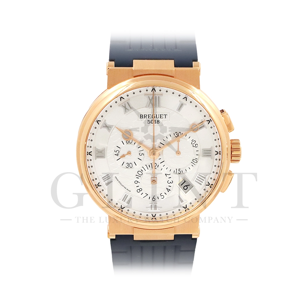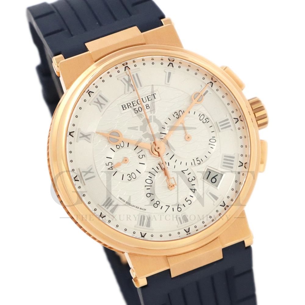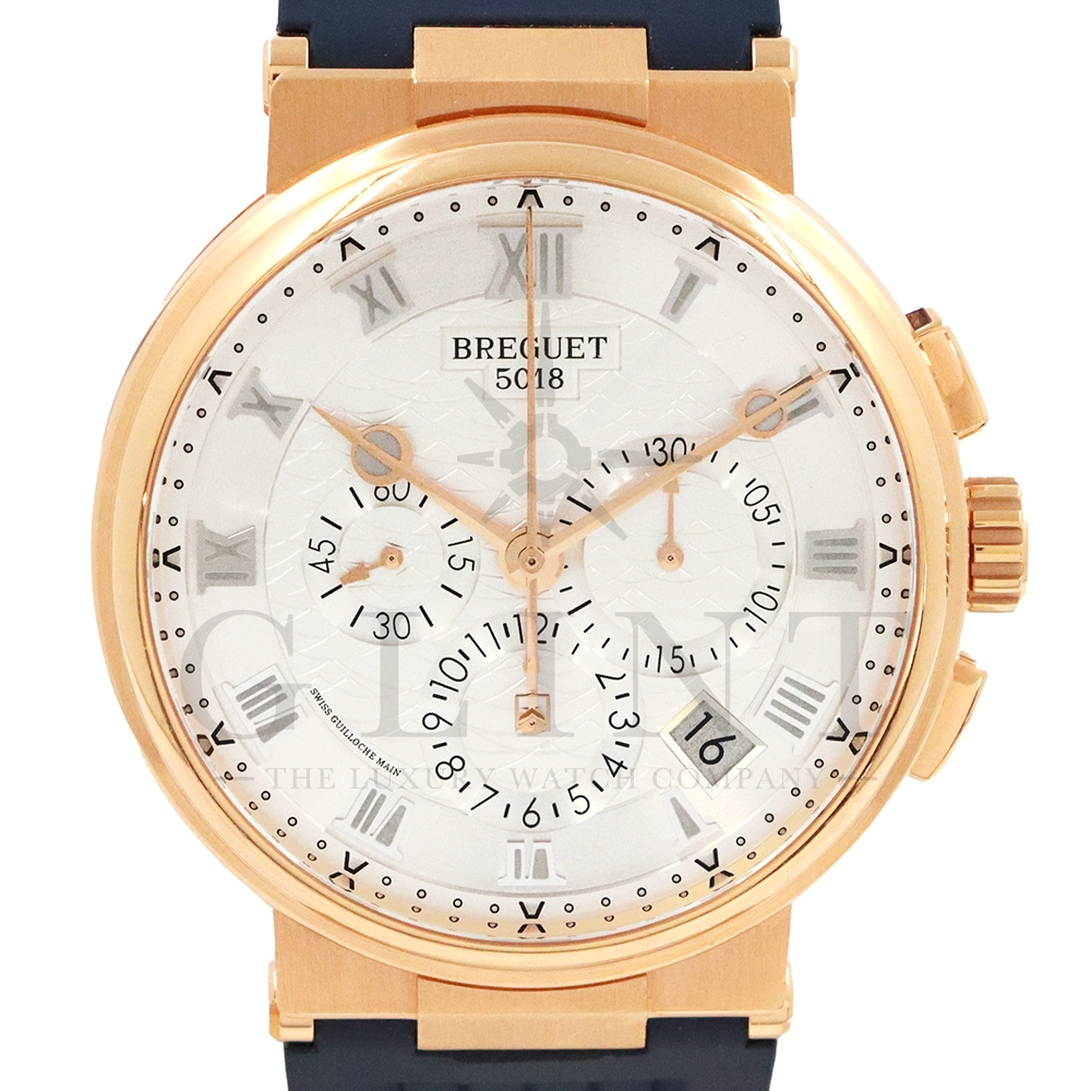 こちらはブレゲ マリーン クロノグラフ 5527BR/12/9WVです。18Kローズゴールドを採用した高級感溢れるモデル。ダイヤルはサンバースト・シルバー。ブレゲらしい針やインデックス、ケース側面のコインエッジ形状など、クラシカルで優美なブレゲの伝統を感じさせる魅力がたっぷり詰め込まれています。クロノグラフ秒針には国際海洋信号旗の「B」をアレンジしたモチーフが備わり、船の舵を模したバックルやローターなど、海をイメージするデザインが見て取れます。ムーブメントもアップデートされ、シリコン製ホーンのインバーテッド・インラインレバー脱進機とシリコン製ひげゼンマイを採用した48時間パワーリザーブのキャリバー582QAを搭載。エレガント&スポーティーを具現化する新たなマリーン クロノグラフをぜひお客様の腕元でご堪能ください。