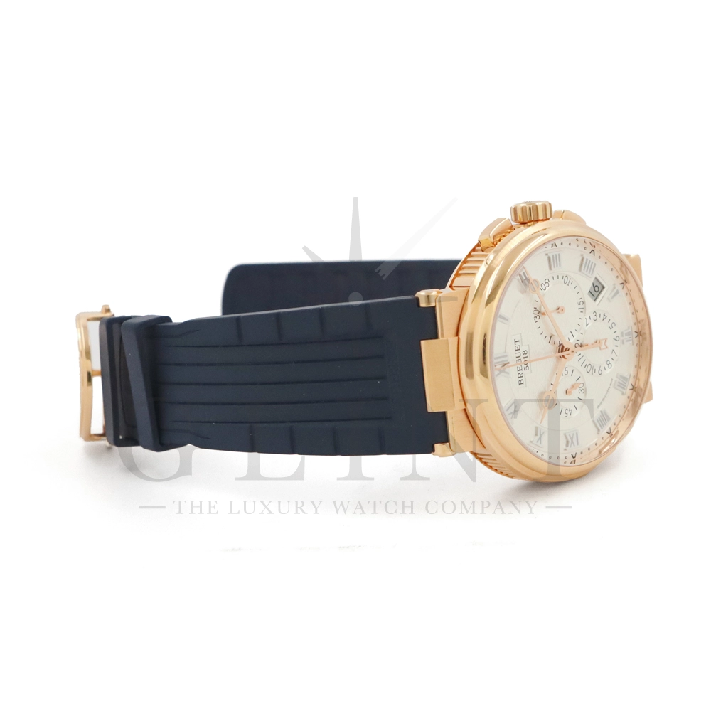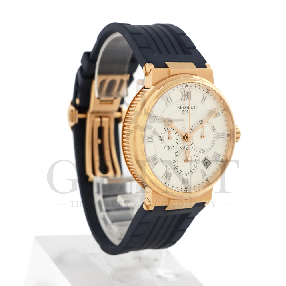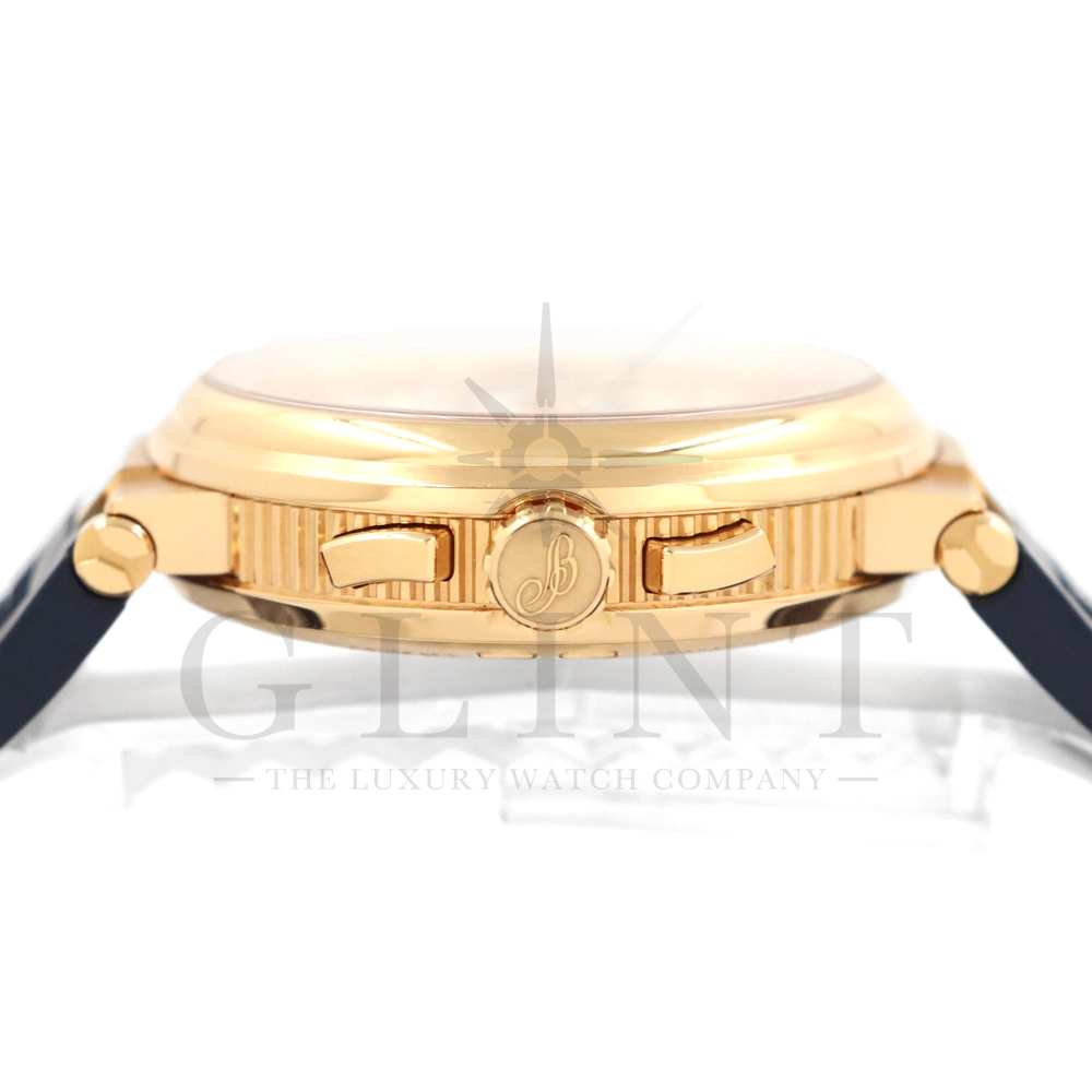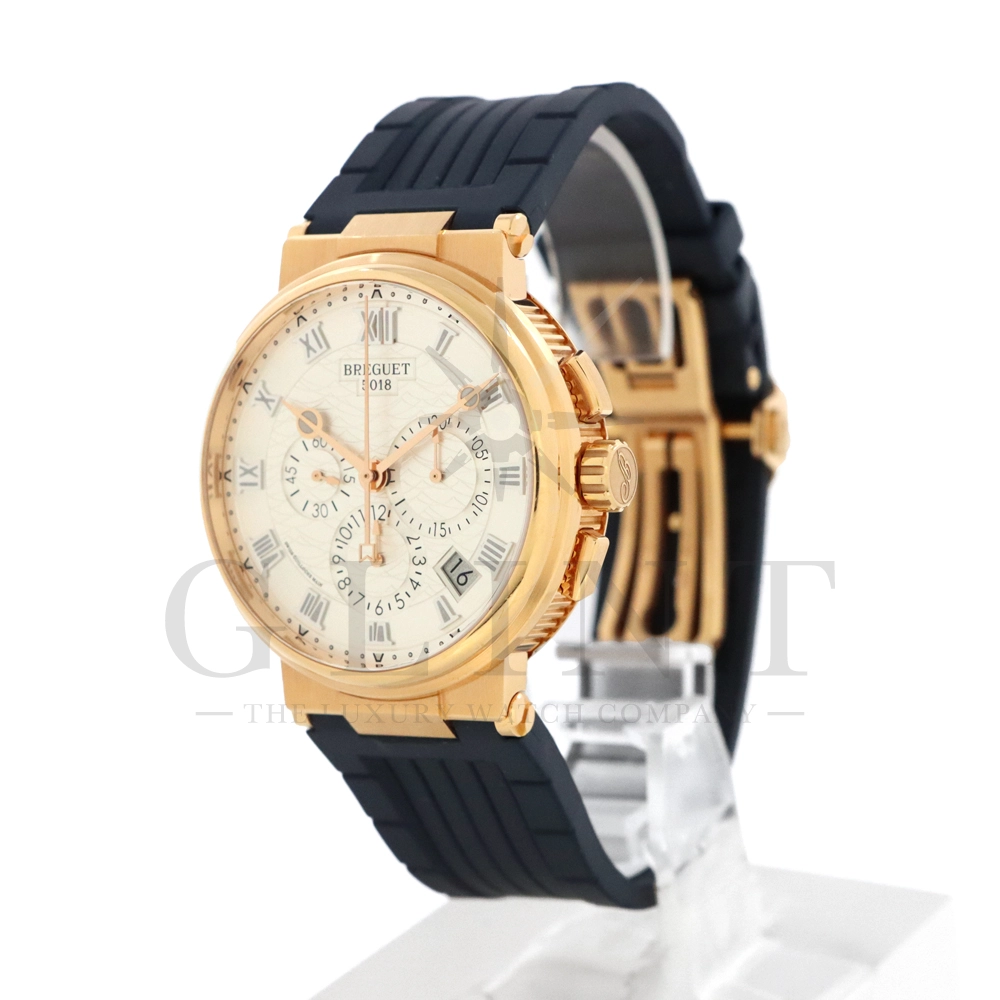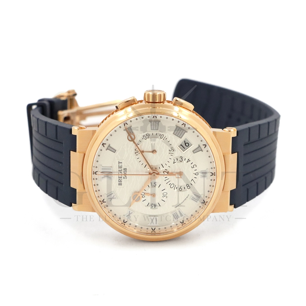 こちらはブレゲ マリーン クロノグラフ 5527BR/12/9WVです。18Kローズゴールドを採用した高級感溢れるモデル。ダイヤルはサンバースト・シルバー。ブレゲらしい針やインデックス、ケース側面のコインエッジ形状など、クラシカルで優美なブレゲの伝統を感じさせる魅力がたっぷり詰め込まれています。クロノグラフ秒針には国際海洋信号旗の「B」をアレンジしたモチーフが備わり、船の舵を模したバックルやローターなど、海をイメージするデザインが見て取れます。ムーブメントもアップデートされ、シリコン製ホーンのインバーテッド・インラインレバー脱進機とシリコン製ひげゼンマイを採用した48時間パワーリザーブのキャリバー582QAを搭載。エレガント&スポーティーを具現化する新たなマリーン クロノグラフをぜひお客様の腕元でご堪能ください。