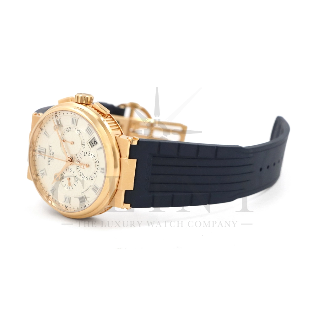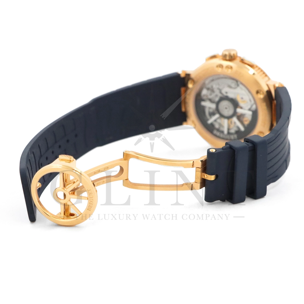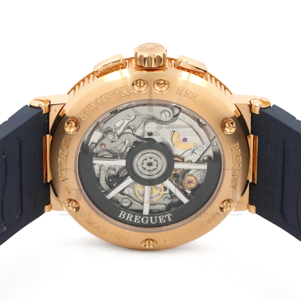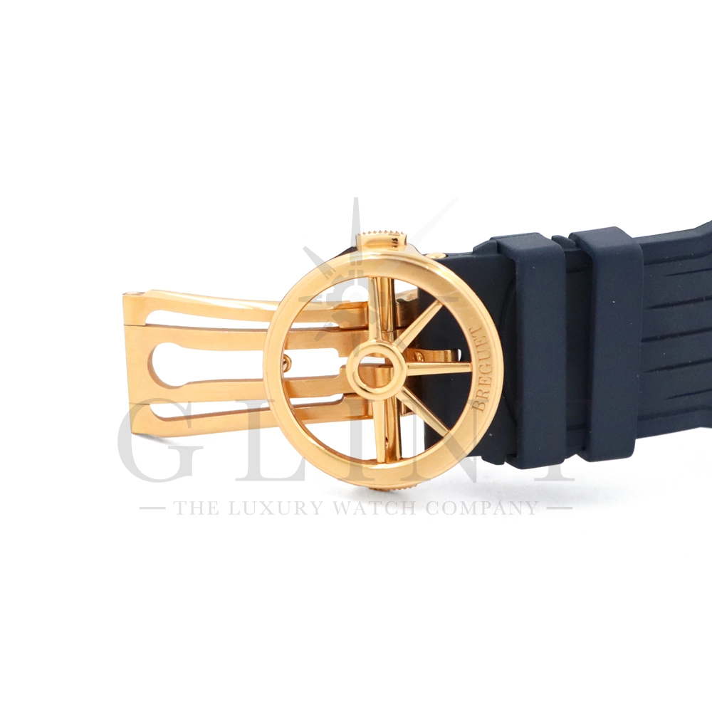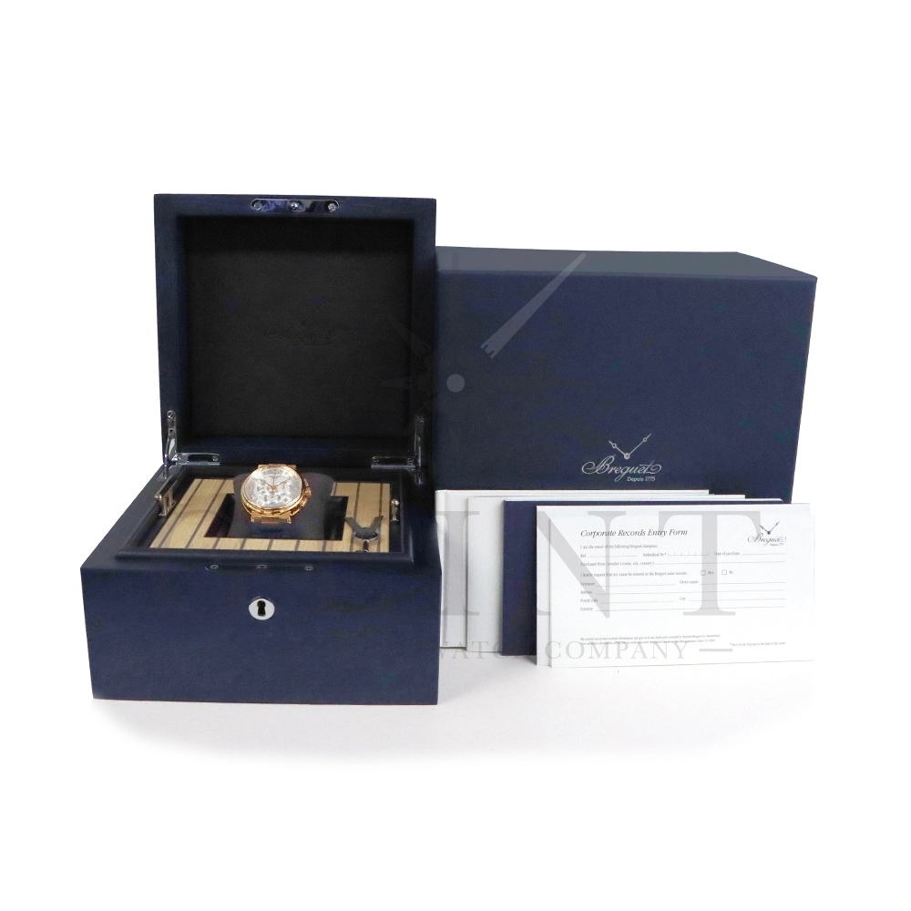文字盤:サンバースト・銀色仕上げゴールド。個別番号とBreguetのサイン。蓄光のローマ数字のチャプターリングとドットインデックス。3時位置に30分積算計。6時位置に12時間積算計。9時位置にスモールセコンド。4時-4時位置に日付表示。ファセットを加えたゴールド製蓄光ブレゲ針。海洋コードからデザインを着想したセンターセコンド針