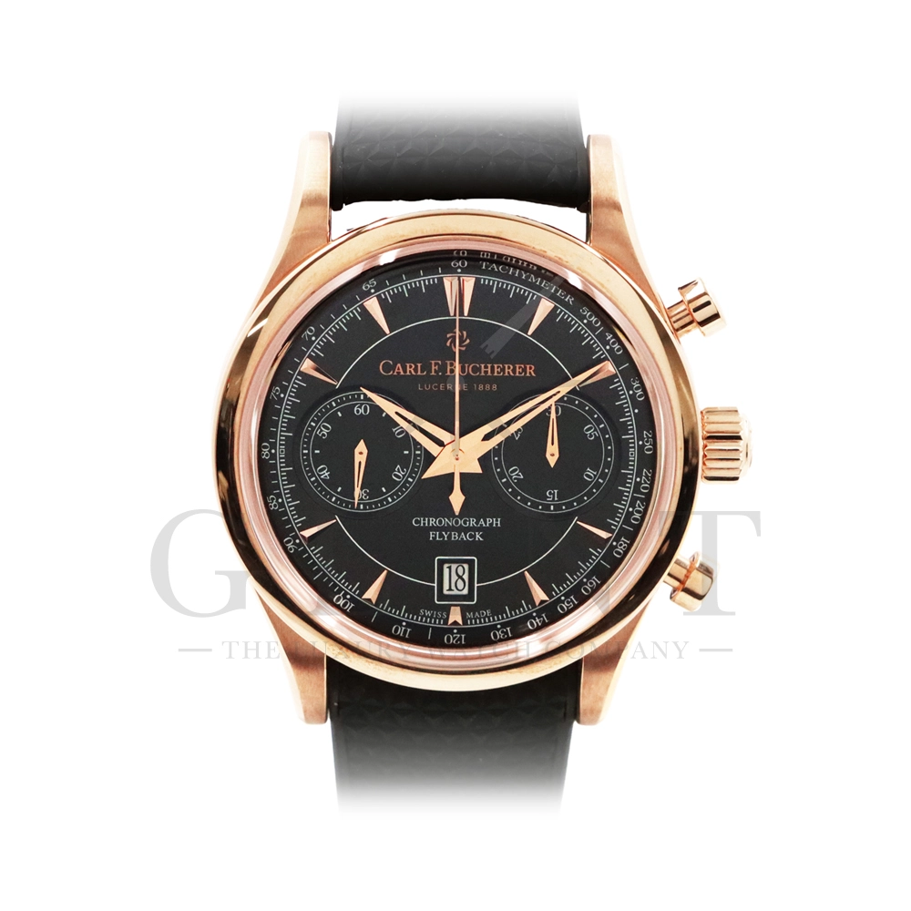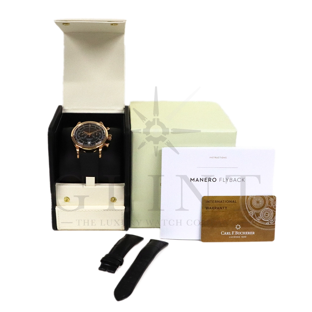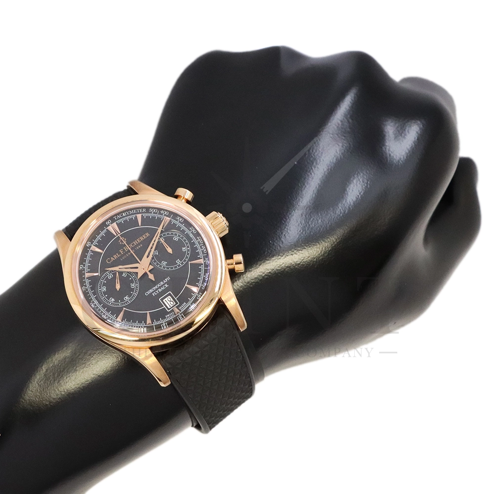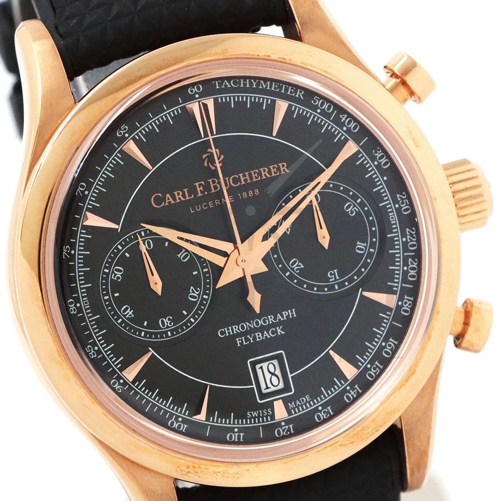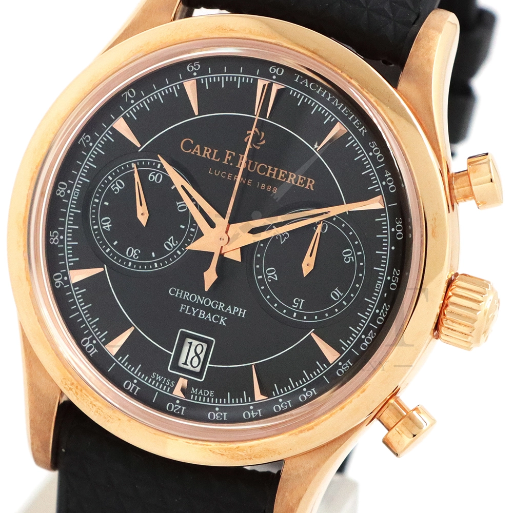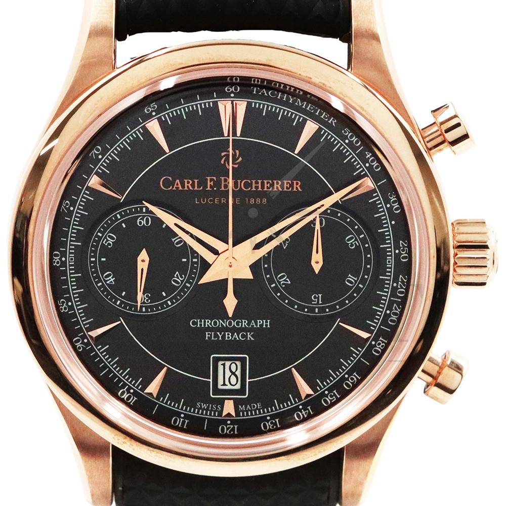 こちらはカール F. ブヘラ マネロ フライバックです。スイスの名門ウォッチメゾン CARL F. BUCHERER が誇るマネロ フライバックは、クラシカルな美意識と高度な時計技術が融合した、洗練されたクロノグラフモデル。伝統的なデザインコードを踏襲しながらも、現代的な機能性を兼ね備えた本作は、真の時計愛好家に向けた一本として高い評価を得ています。ケースには18Kローズゴールドを採用し、直径43mmの存在感あるサイズに仕上げられています。両面無反射コーティングが施されたドーム型サファイアクリスタルが、美しいブラックダイヤルの視認性を高めると同時に、エレガントな立体感を演出。ダイヤル上にはバランスよく配置された2つのサブダイヤルと、6時位置の日付表示が配され、クラシックでありながら機能美に優れたフェイスデザインとなっています。さらに外周にはタキメータースケールが備えられ、スポーティな要素もさりげなく取り入れられています。 本モデルの最大の特徴は、自社が誇る自動巻きクロノグラフムーブメント「CFB 1970」を搭載している点。約42時間のパワーリザーブを備え、フライバック機能により、計測中でも瞬時にリセットと再スタートが可能。通常のクロノグラフでは必要となる3段階の操作をワンプッシュで実現し、連続した時間計測をスムーズに行うことができます。この高度な機構は、機能性と操作性を両立した実用的な複雑機構として、時計の魅力を一層引き立てています。 また、ケースバックにはシースルー仕様を採用し、精緻に仕上げられたムーブメントの動きを視覚的にも楽しむことができます。防水性能は30mと日常使用に十分対応し、ドレスウォッチとしての上品さと実用性を兼ね備えているといえるでしょう。マネロ フライバックは、クラシックとモダン、伝統と革新が見事に調和したタイムピースです。洗練されたデザインと高性能ムーブメントを併せ持つこの一本は、ビジネスシーンからフォーマルな場面まで幅広く活躍し、着用者の品格を静かに引き立てます。時計という枠を超えた“工芸品”として、長く愛用できる価値あるモデルでしょう。