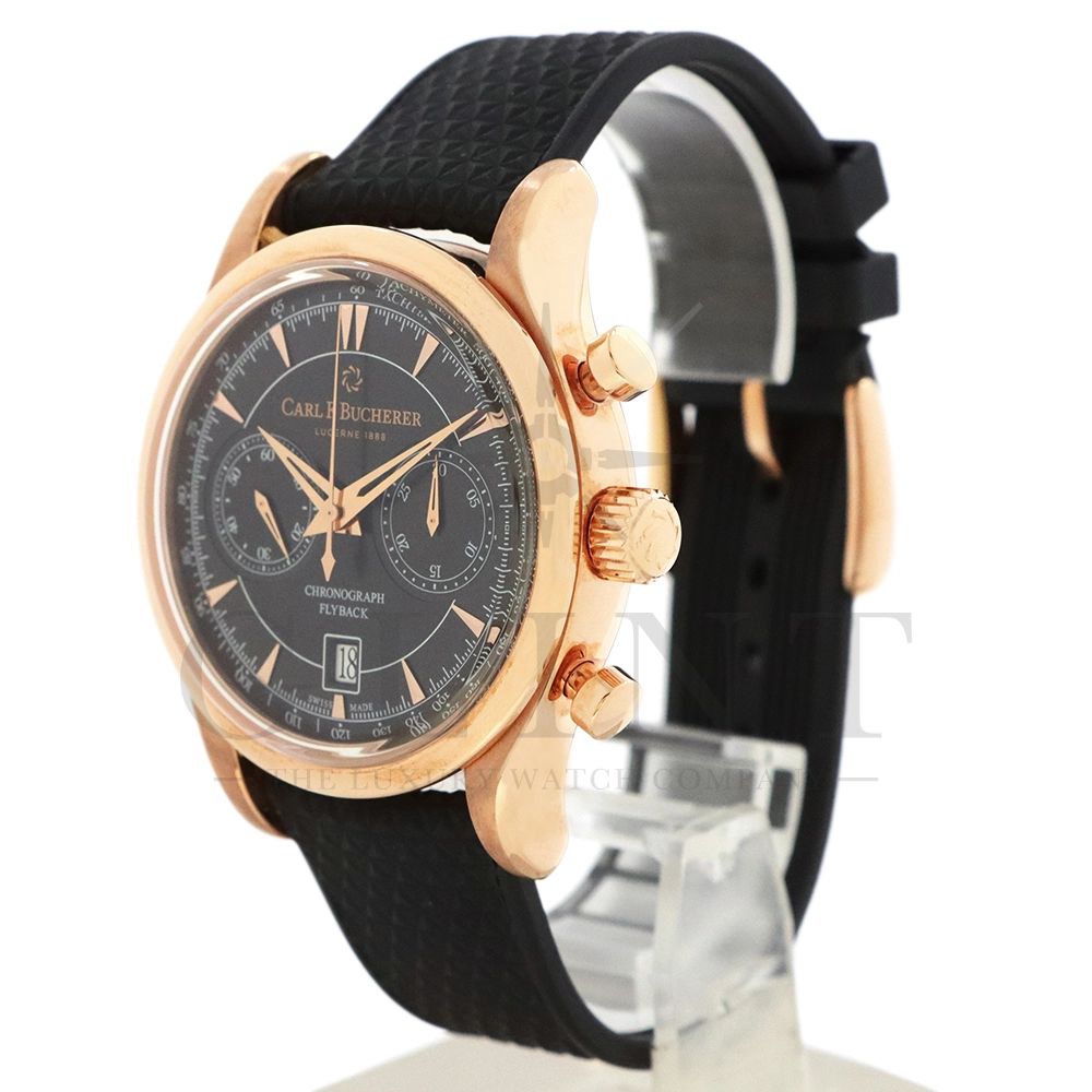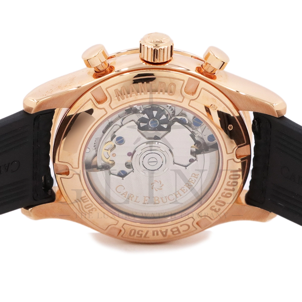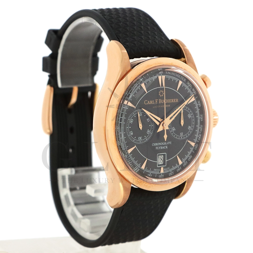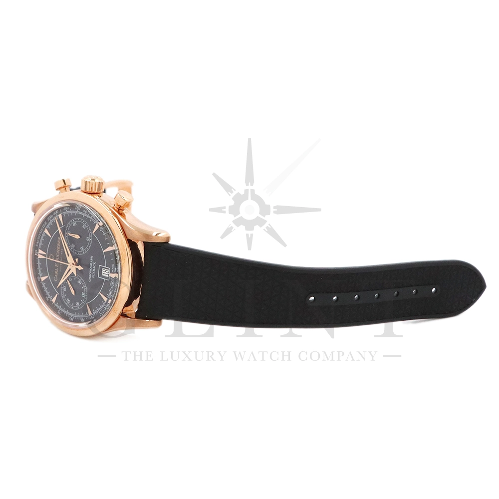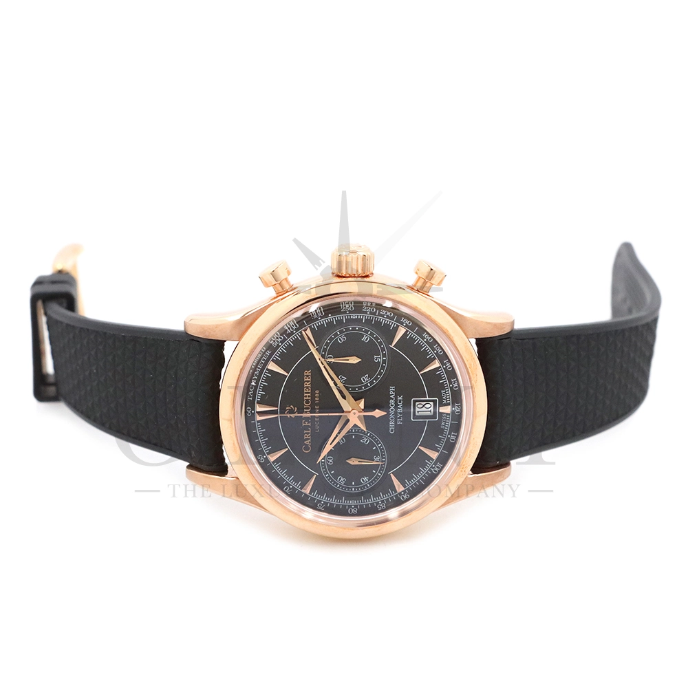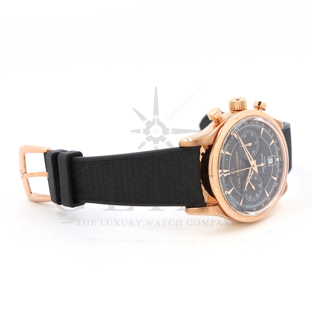 こちらはカール F. ブヘラ マネロ フライバックです。スイスの名門ウォッチメゾン CARL F. BUCHERER が誇るマネロ フライバックは、クラシカルな美意識と高度な時計技術が融合した、洗練されたクロノグラフモデル。伝統的なデザインコードを踏襲しながらも、現代的な機能性を兼ね備えた本作は、真の時計愛好家に向けた一本として高い評価を得ています。ケースには18Kローズゴールドを採用し、直径43mmの存在感あるサイズに仕上げられています。両面無反射コーティングが施されたドーム型サファイアクリスタルが、美しいブラックダイヤルの視認性を高めると同時に、エレガントな立体感を演出。ダイヤル上にはバランスよく配置された2つのサブダイヤルと、6時位置の日付表示が配され、クラシックでありながら機能美に優れたフェイスデザインとなっています。さらに外周にはタキメータースケールが備えられ、スポーティな要素もさりげなく取り入れられています。 本モデルの最大の特徴は、自社が誇る自動巻きクロノグラフムーブメント「CFB 1970」を搭載している点。約42時間のパワーリザーブを備え、フライバック機能により、計測中でも瞬時にリセットと再スタートが可能。通常のクロノグラフでは必要となる3段階の操作をワンプッシュで実現し、連続した時間計測をスムーズに行うことができます。この高度な機構は、機能性と操作性を両立した実用的な複雑機構として、時計の魅力を一層引き立てています。 また、ケースバックにはシースルー仕様を採用し、精緻に仕上げられたムーブメントの動きを視覚的にも楽しむことができます。防水性能は30mと日常使用に十分対応し、ドレスウォッチとしての上品さと実用性を兼ね備えているといえるでしょう。マネロ フライバックは、クラシックとモダン、伝統と革新が見事に調和したタイムピースです。洗練されたデザインと高性能ムーブメントを併せ持つこの一本は、ビジネスシーンからフォーマルな場面まで幅広く活躍し、着用者の品格を静かに引き立てます。時計という枠を超えた“工芸品”として、長く愛用できる価値あるモデルでしょう。