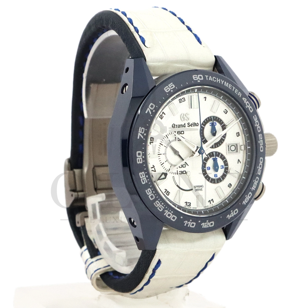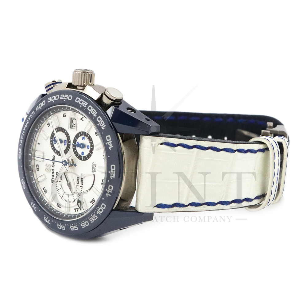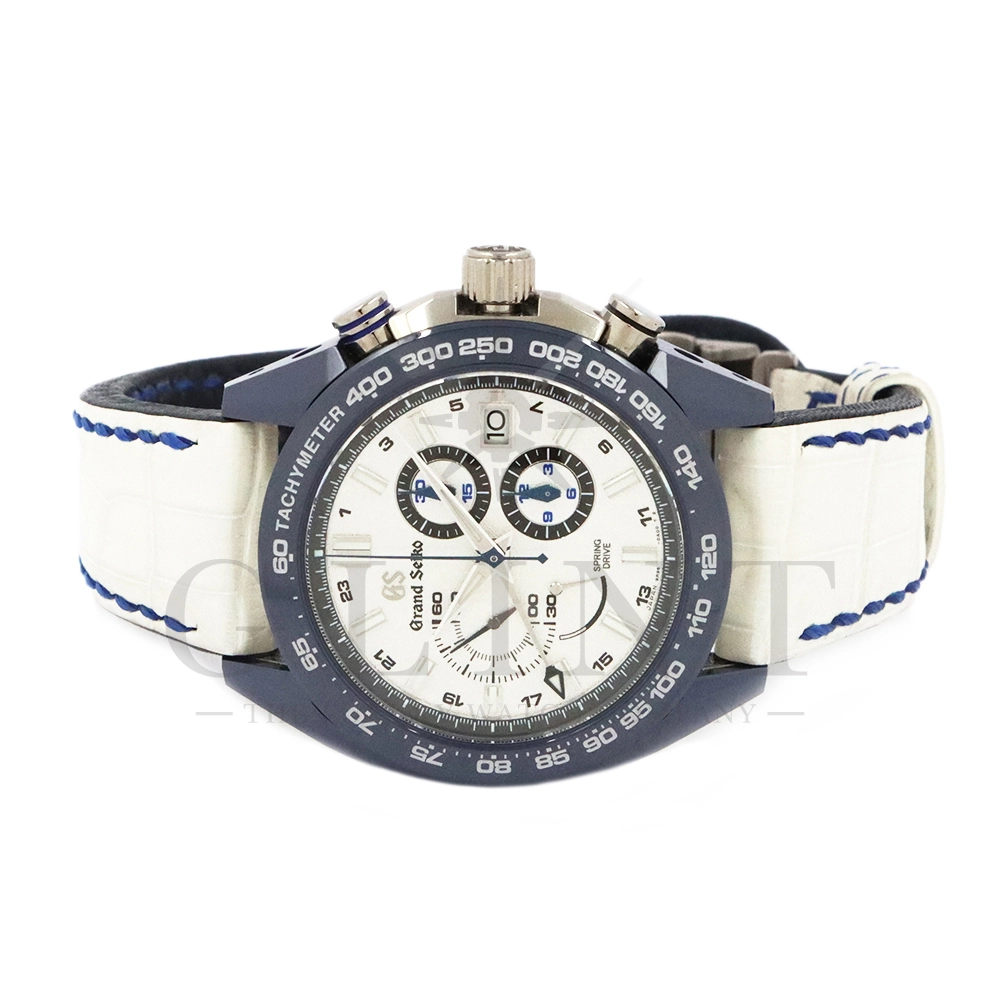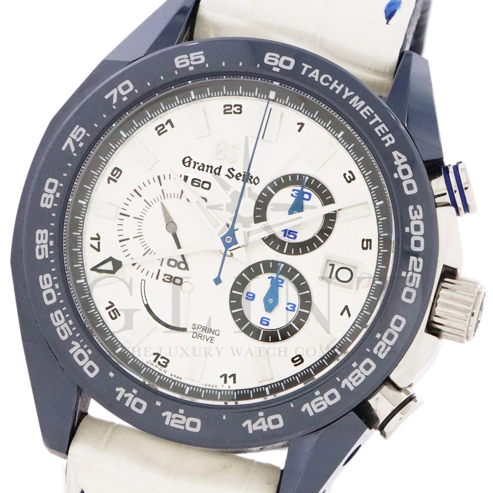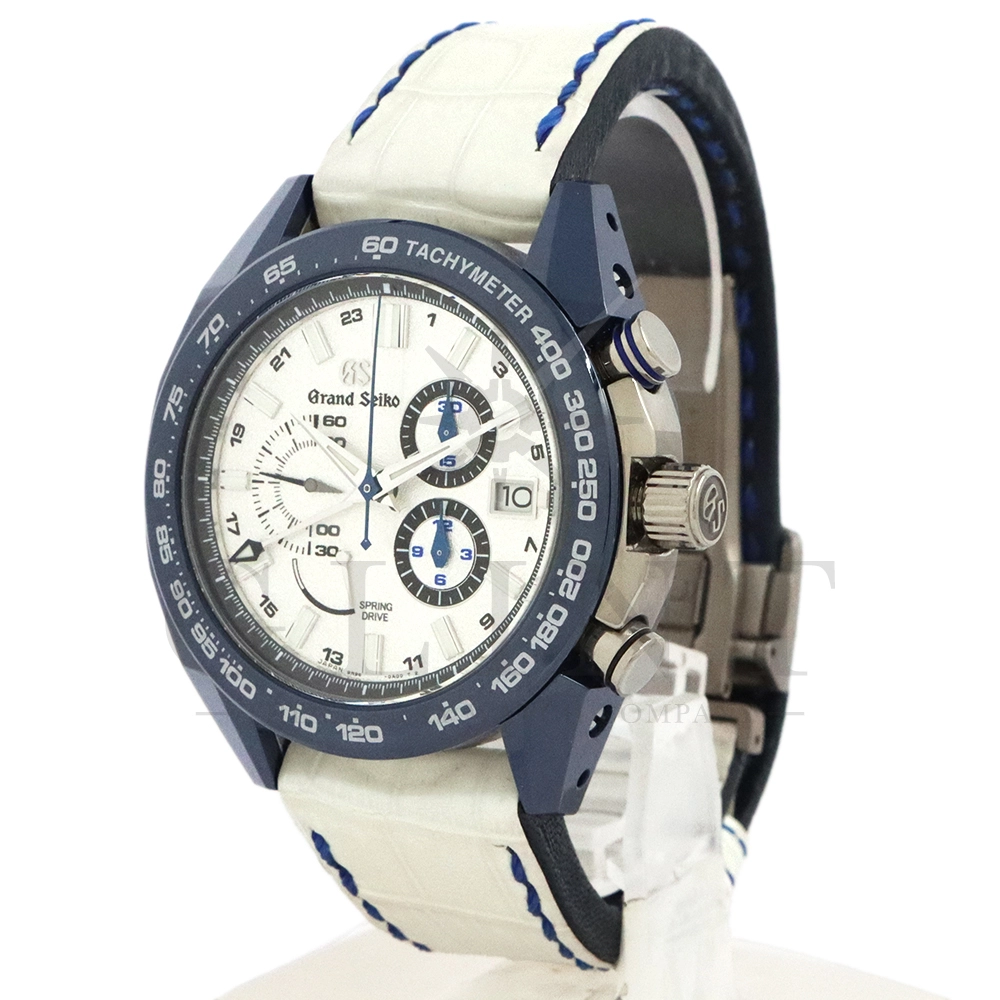 こちらはグランドセイコー スプリングドライブです。スポーツコレクション セラミックスモデルより、誕生50周年を迎えた「NISSAN GT-R」の記念モデルである「NISSAN GT-R 50th Anniversary」にインスパイアされた、数量限定のコラボレーションモデルが登場。「NISSAN GT-R」50th Anniversaryは、「GT-R」の原点である「スカイライン2000GT-R(PGC10 型)」のレーシング仕様にオマージュを捧げた期間限定車です。鮮烈な走りを印象づける「青」を主体としたカラーリングの“ワンガンブルー”に着想を得たこのモデルは、“グランドセイコーブルー” のセラミックスとブライトチタンのハイブリッド構造をもつモデルを採用しました。硬いセラミックスパーツが時計を傷から守りつつ、軽量なブライトチタンケースとのコンビネーションによって高い装着性と防水性を実現しています。また、往年の日産レーシングカーにあしらわれたストライプを彷彿とさせる「白」は、クロコダイルストラップとホワイトシルバー色のダイヤルによって表現。“グランドセイコーブルー” のケースと見事な調和を果たし、これまでにない開放感のある新しいスポーツモデルが誕生しました。2019年に誕生20周年を迎えた独創の機構スプリングドライブを搭載。誕生20周年記念ロゴがあしらわれたシースルーバック仕様の裏ぶたからは、コラボレーションモデルの証である「GT-R」ロゴのワッペン(18KYG 製)がセットされた回転錘と、ムーブメントが精緻な時を刻む姿をご覧いただくことができます。特別な雰囲気を堪能できるスプリングドライブです。