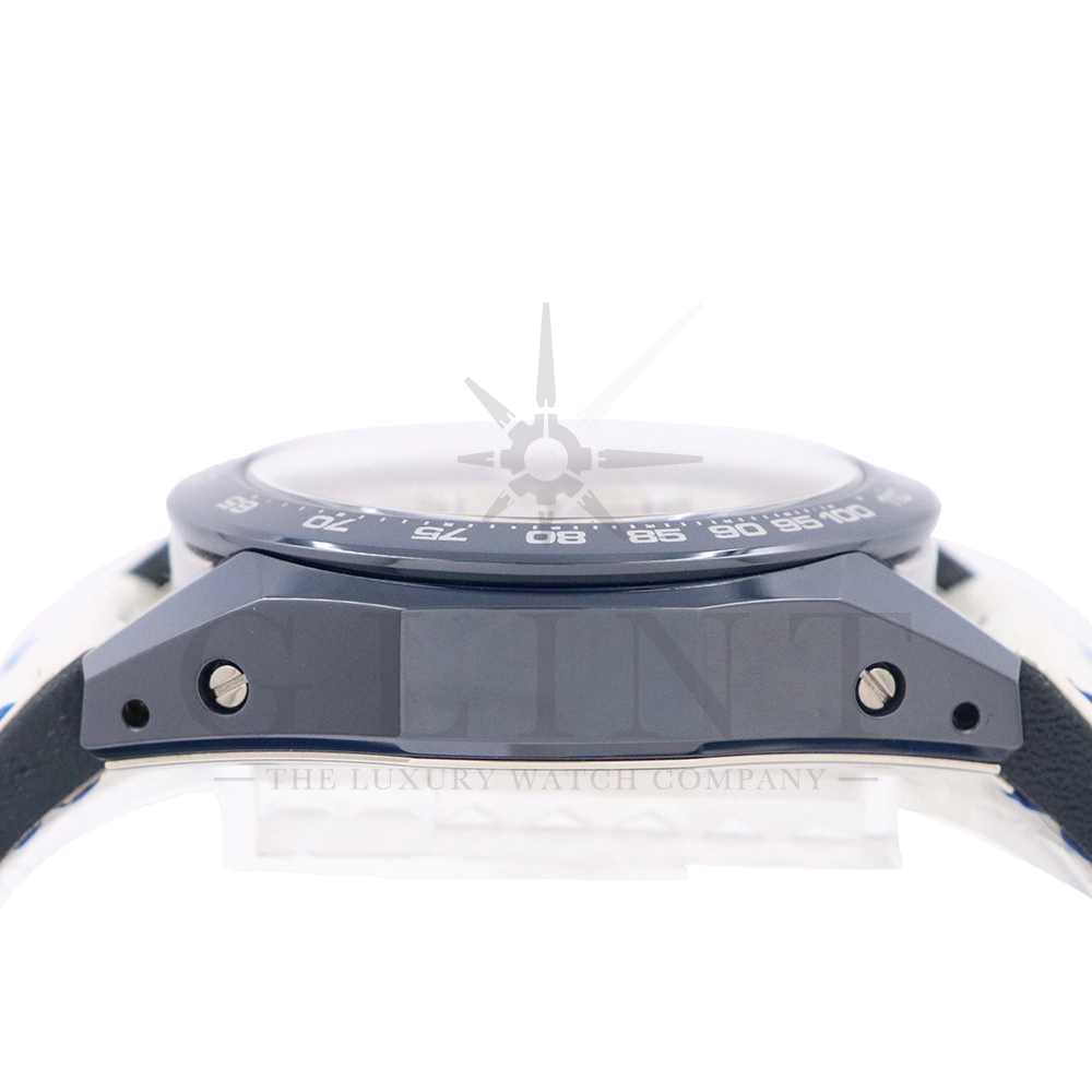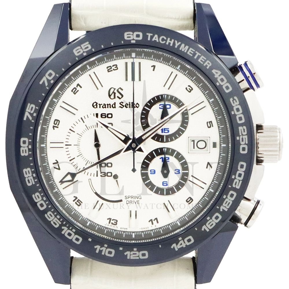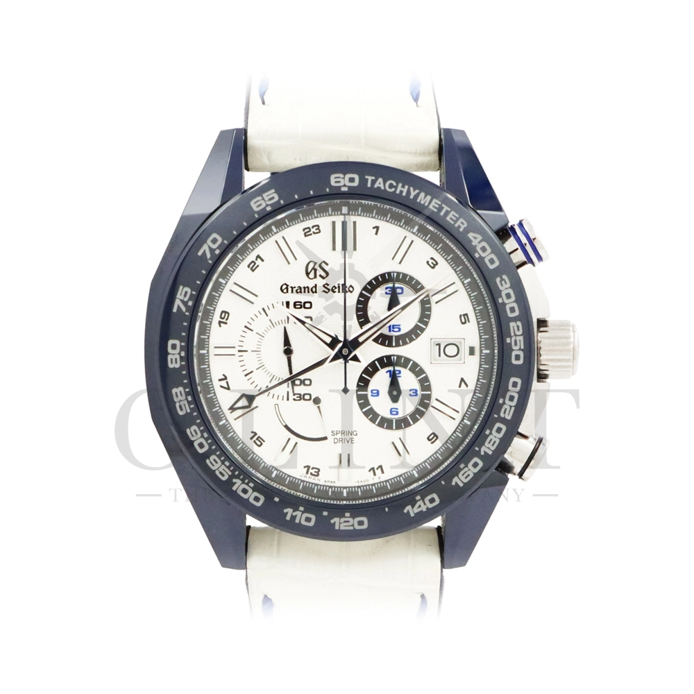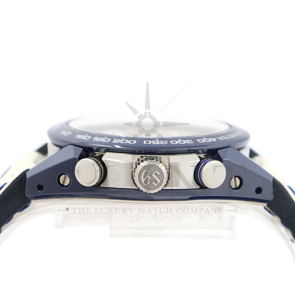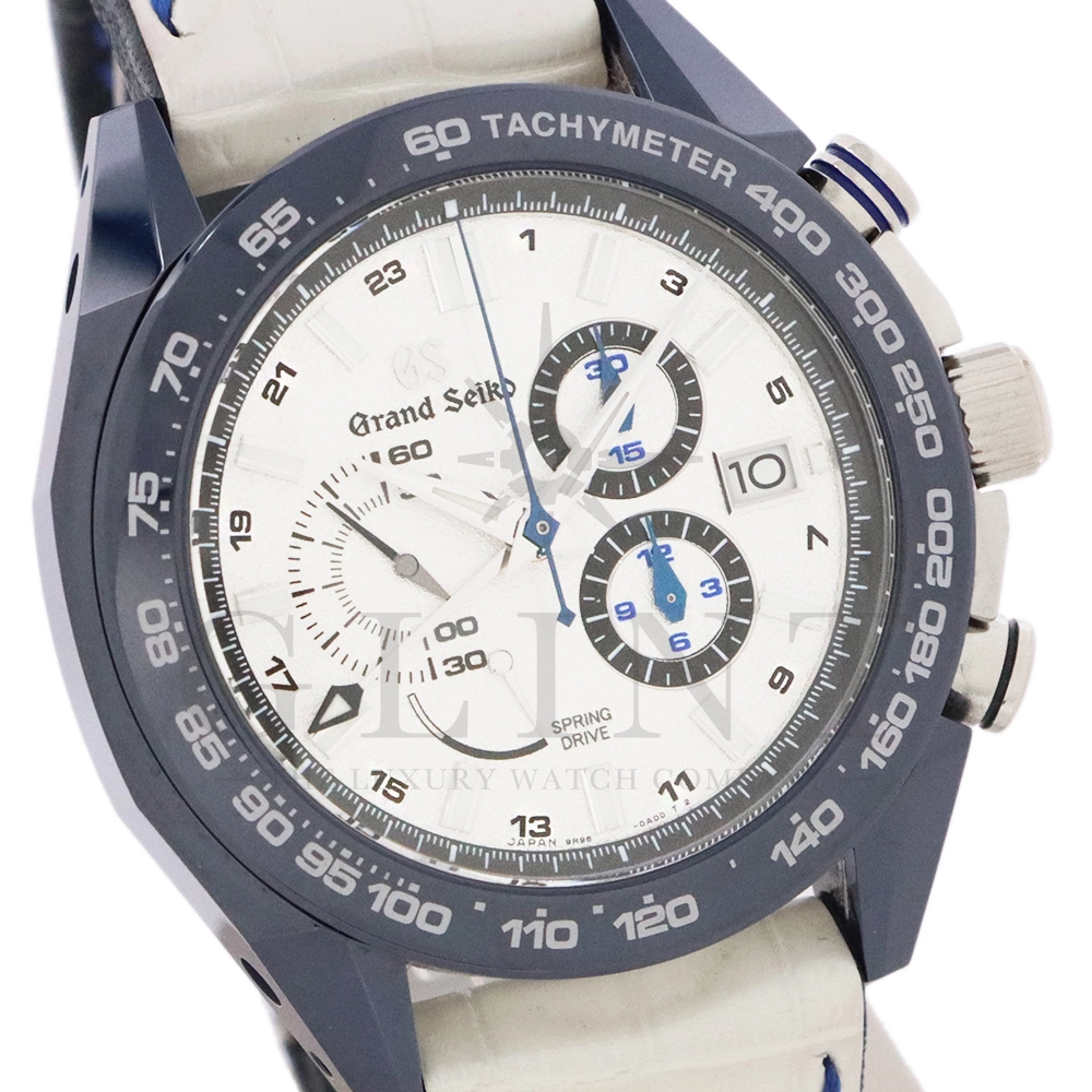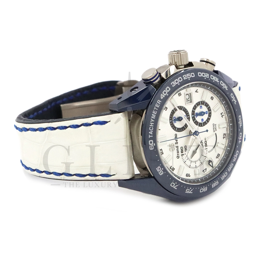 こちらはグランドセイコー スプリングドライブです。スポーツコレクション セラミックスモデルより、誕生50周年を迎えた「NISSAN GT-R」の記念モデルである「NISSAN GT-R 50th Anniversary」にインスパイアされた、数量限定のコラボレーションモデルが登場。「NISSAN GT-R」50th Anniversaryは、「GT-R」の原点である「スカイライン2000GT-R(PGC10 型)」のレーシング仕様にオマージュを捧げた期間限定車です。鮮烈な走りを印象づける「青」を主体としたカラーリングの“ワンガンブルー”に着想を得たこのモデルは、“グランドセイコーブルー” のセラミックスとブライトチタンのハイブリッド構造をもつモデルを採用しました。硬いセラミックスパーツが時計を傷から守りつつ、軽量なブライトチタンケースとのコンビネーションによって高い装着性と防水性を実現しています。また、往年の日産レーシングカーにあしらわれたストライプを彷彿とさせる「白」は、クロコダイルストラップとホワイトシルバー色のダイヤルによって表現。“グランドセイコーブルー” のケースと見事な調和を果たし、これまでにない開放感のある新しいスポーツモデルが誕生しました。2019年に誕生20周年を迎えた独創の機構スプリングドライブを搭載。誕生20周年記念ロゴがあしらわれたシースルーバック仕様の裏ぶたからは、コラボレーションモデルの証である「GT-R」ロゴのワッペン(18KYG 製)がセットされた回転錘と、ムーブメントが精緻な時を刻む姿をご覧いただくことができます。特別な雰囲気を堪能できるスプリングドライブです。