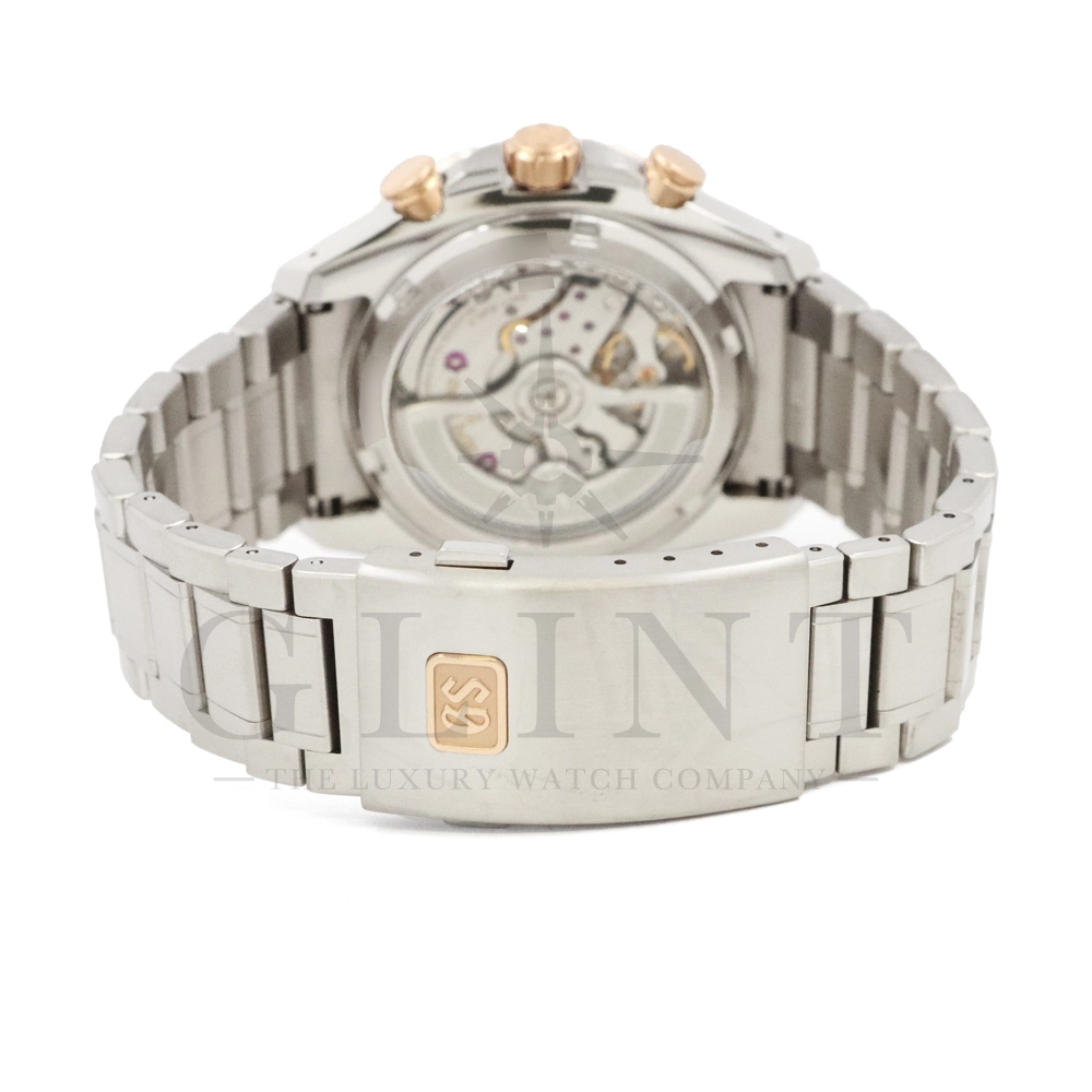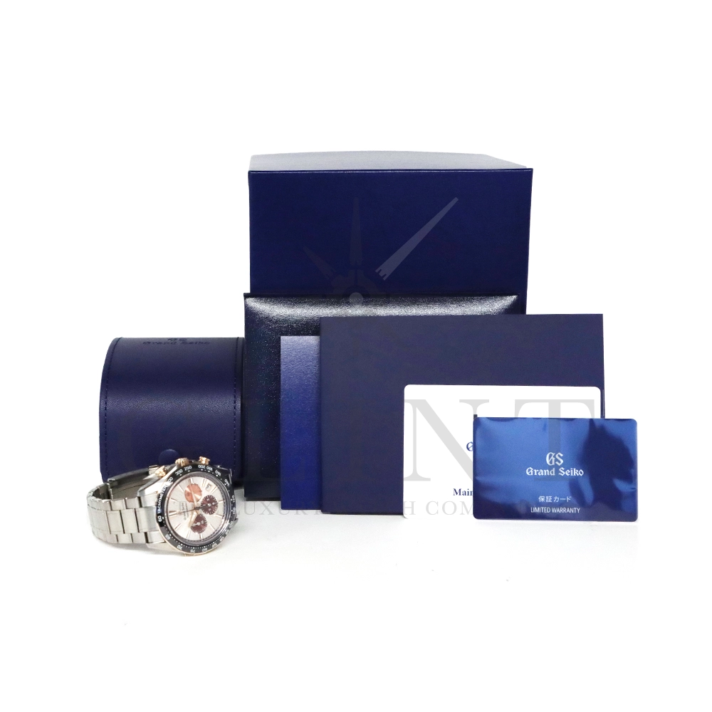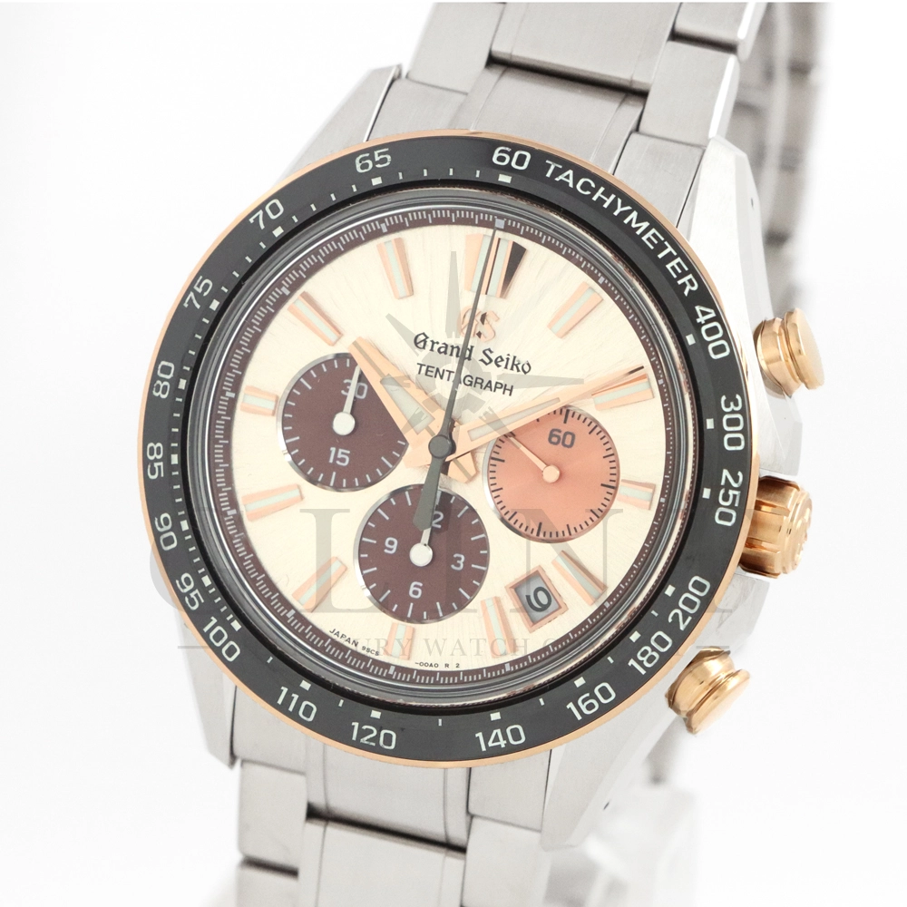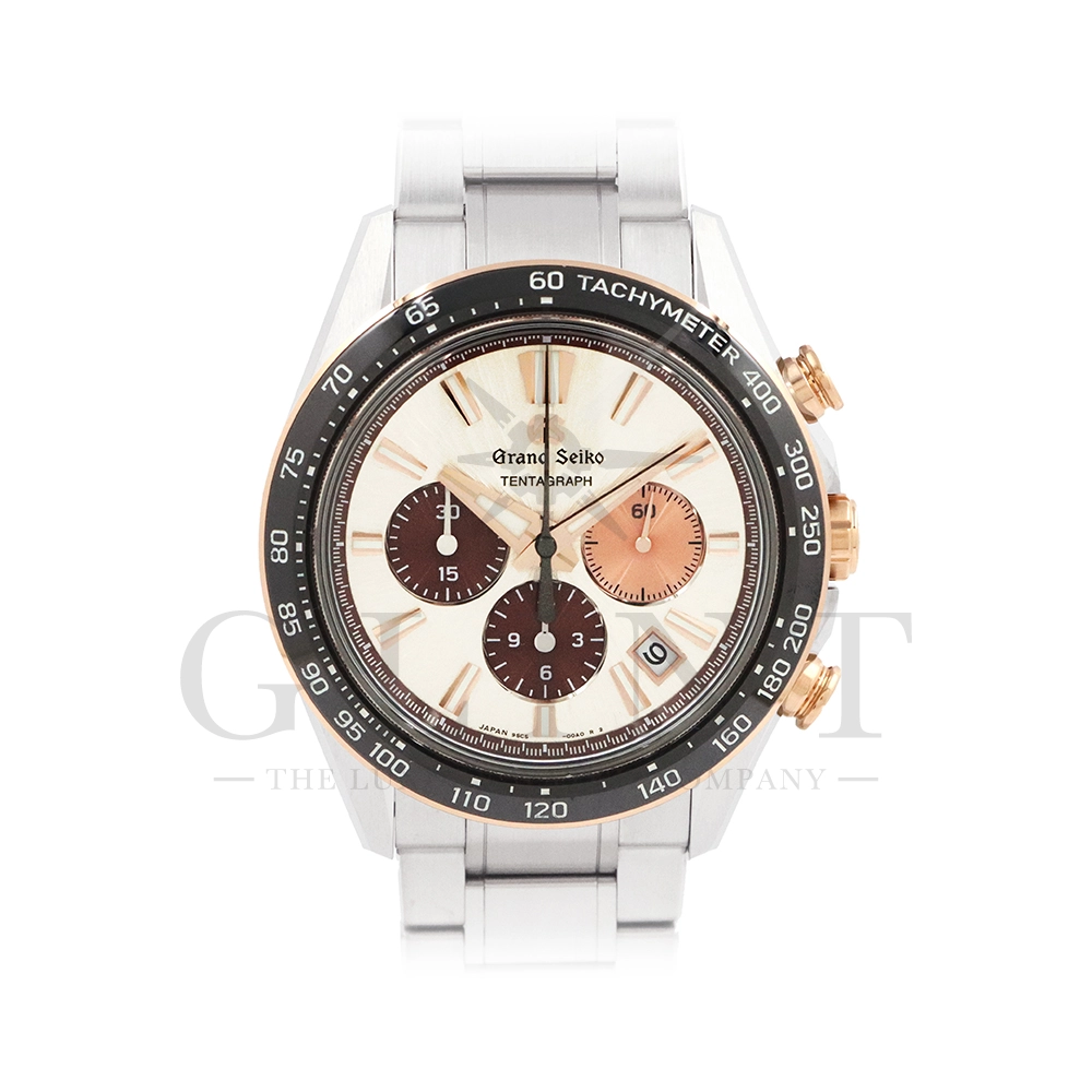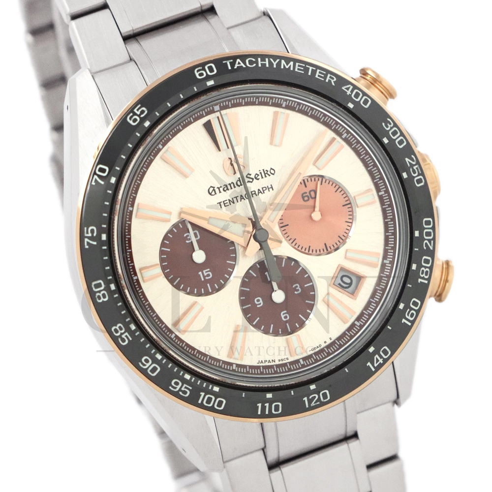 こちらはグランドセイコー エボリューション9 コレクション テンタグラフ 300本限定モデルです。グランドセイコーの新世代クロノグラフ テンタグラフ SLGC006は、ブランドの美学と精密技術を極限まで融合したメカニカルウォッチです。エボリューション9スタイルを採用し、日本の美意識とグランドセイコーの時計製造技術を高い次元で融合させています。文字盤には、グランドセイコーの製造拠点である「グランドセイコースタジオ 雫石」から望む岩手山の尾根筋をモチーフとした立体的な型打ち模様を。カッパーピンクの文字盤カラーは 朝日を浴びて輝く岩手山を想起させ、堂々とした佇まいを演出します。テンタグラフ(Tentagraph) の名称は“TEN beat(10振動/秒)”、“Three days(約3日間パワーリザーブ)”、“Automatic(自動巻)”、“ChronoGRAPH(クロノグラフ)”の4つの特徴から命名。毎秒10振動のハイビートムーブメントは安定した精度と優れた動作を実現し、フル巻上げで 約72時間(約3日間) の駆動が可能です。エボリューション9スタイルの高い視認性を実現するため、針とインデックスの間隔が最適化されており、多彩な情報を瞬時に読み取ることができます。日付表示は4〜5 時位置に配置し、サブダイヤルとの干渉を避けつつ12箇所のインデックスを確保。 裏ぶたには “LIMITED EDITION” の刻印と シリアルナンバー が入っています。SLGC006は、岩手山の自然美とグランドセイコーの高度なものづくりを結集した 世界限定のハイエンドメカニカルクロノグラフ です。着用するだけで日本の風景と技術哲学を感じられる一本であり、コレクターズピースとしても非常に魅力的なモデルと言えるでしょう。